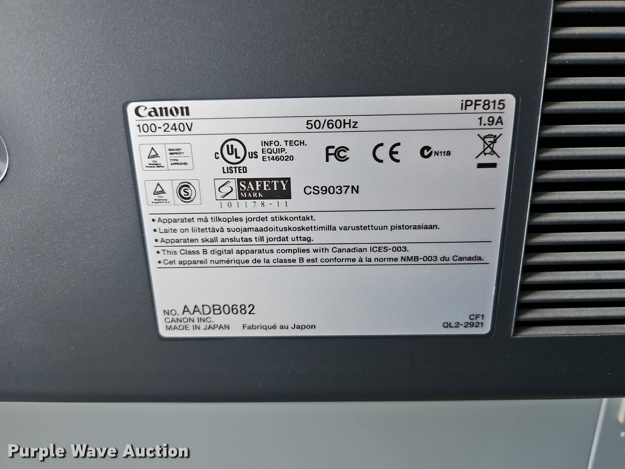 Purple Wave is selling a used Copy or Printing Machine in Kansas. This item is a Canon iPF815 printer with the following: Serial: AADB0682, Volts: 100/240