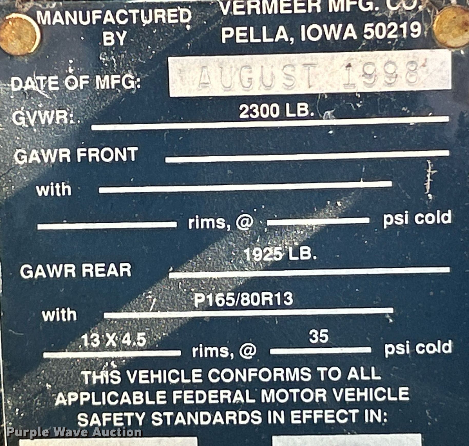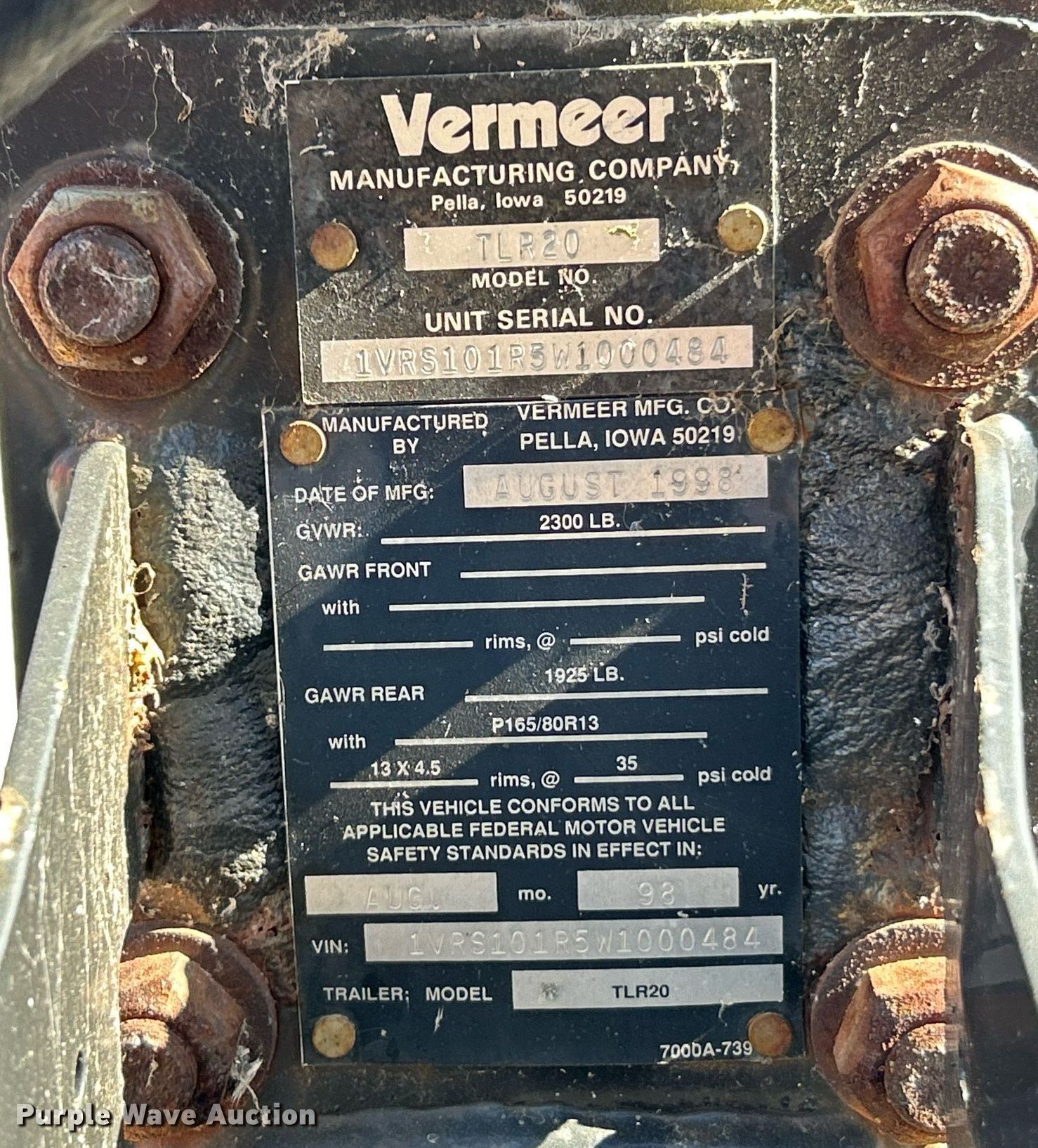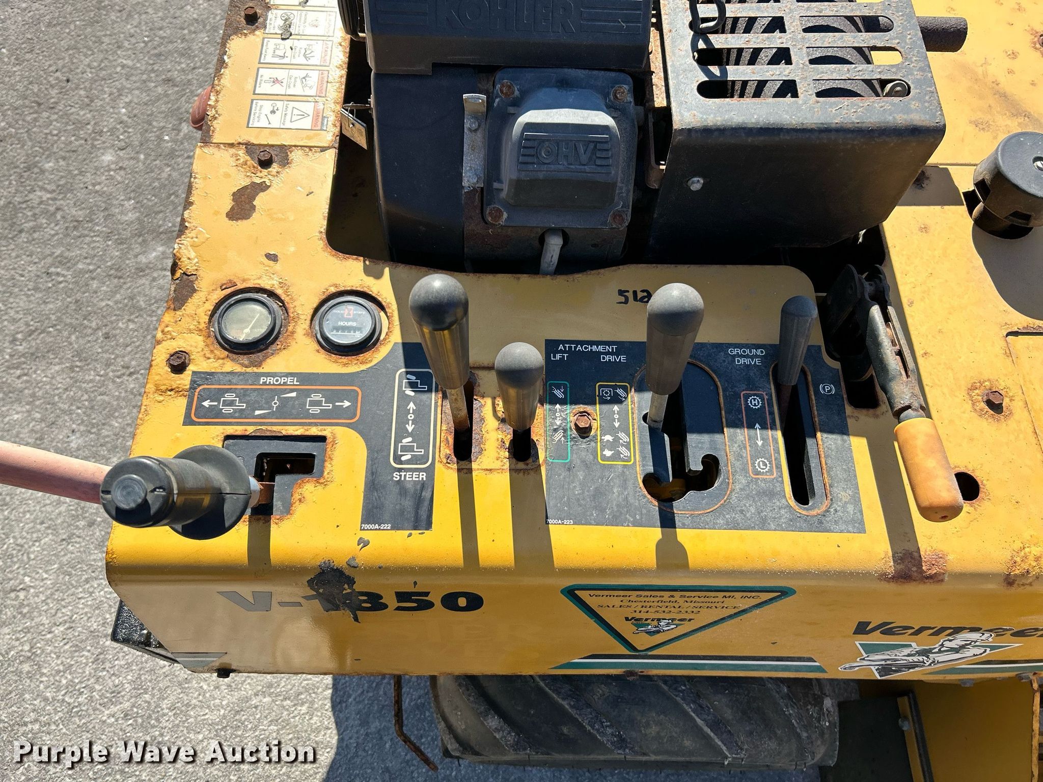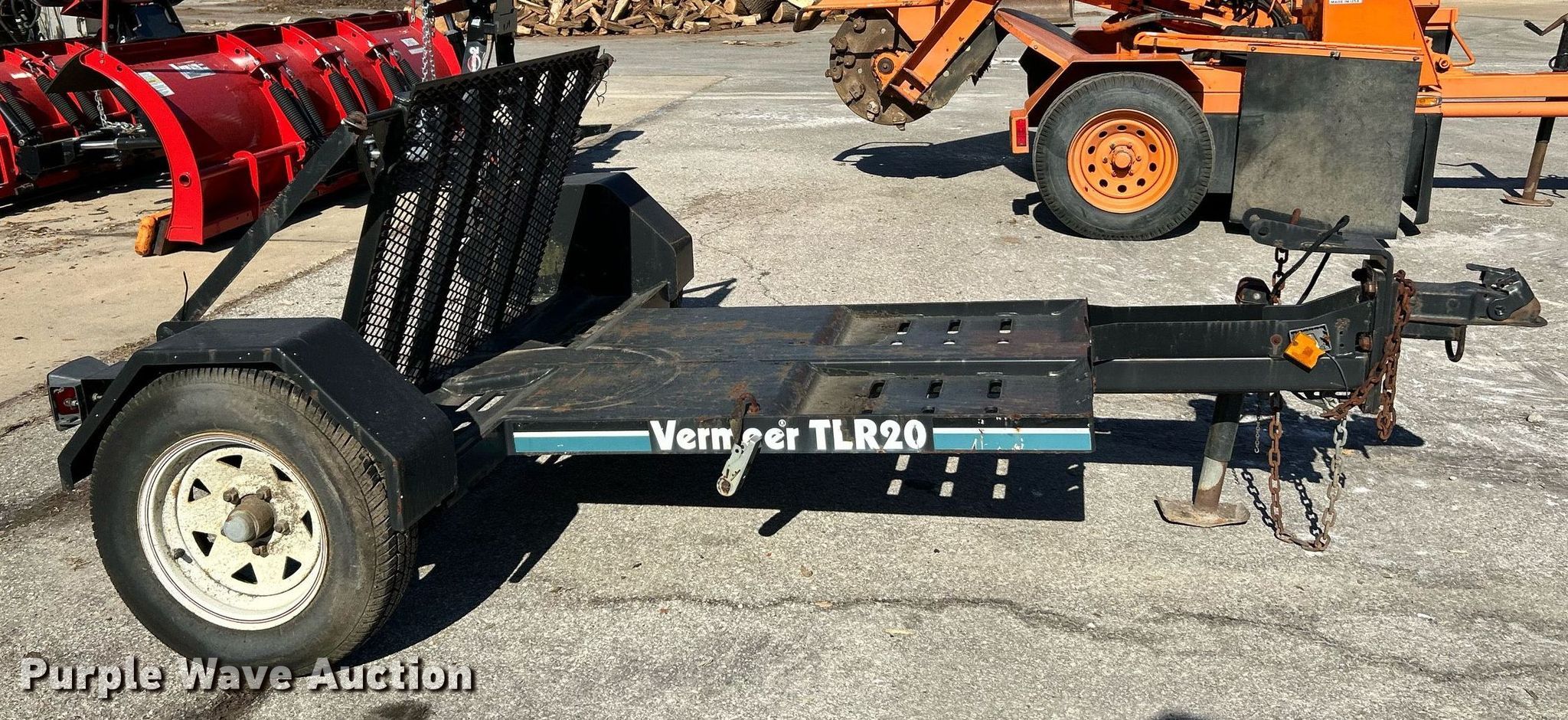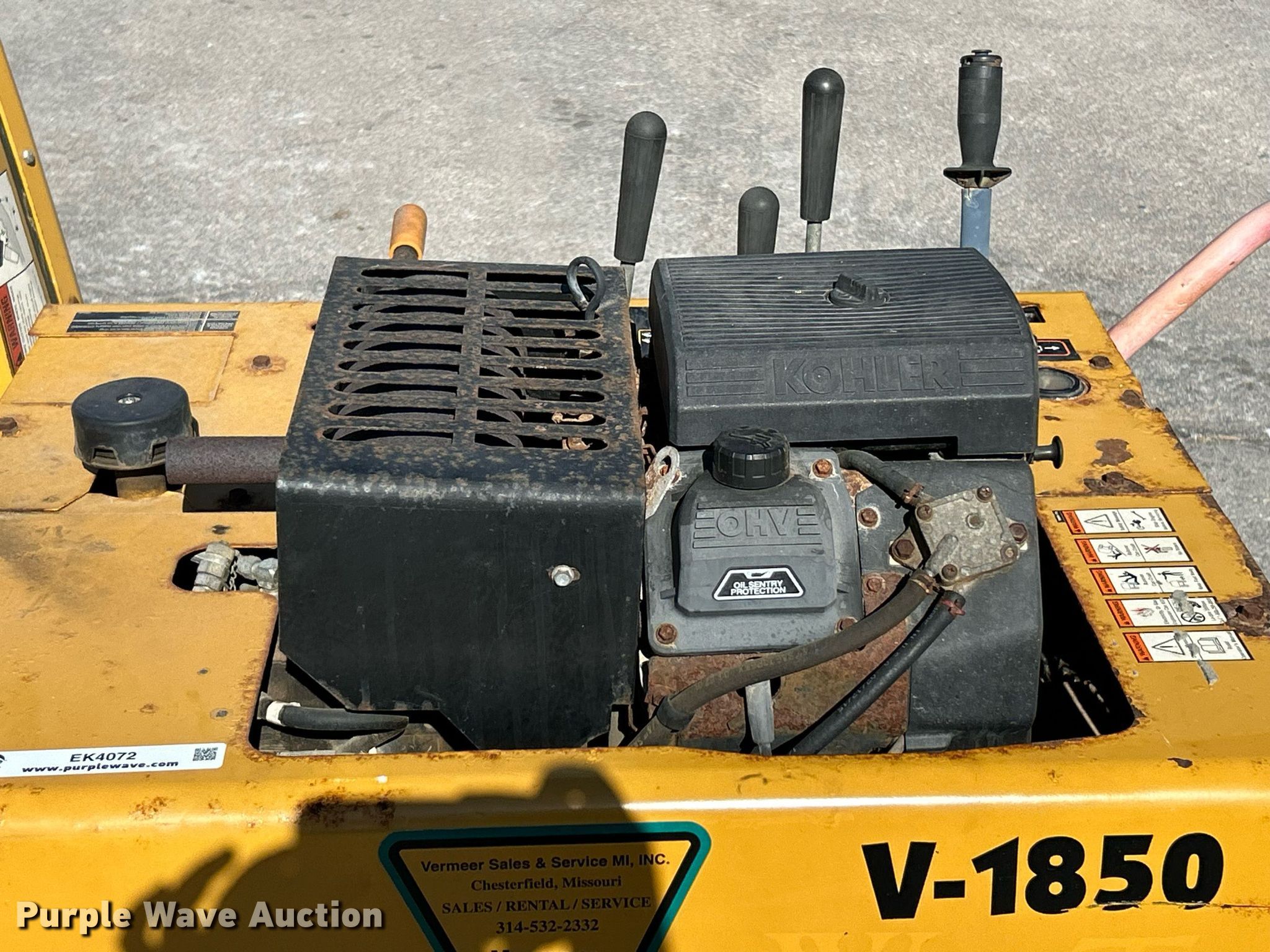 1998 Vermeer V-1850RCA root cutter. Hours: 271 on meter, Serial: 1VRK040R5W1000156. Engine Kohler, Displacement: 624 cc, Cylinders: 2, Fuel type: Gas. Transmission Hydrostatic. Features Root cutter Cut Depth: 16", Trencher attachment Vermeer V1850TR, Serial: 1VRK040N6W1000972, Estimated dig depth: 4', Cutting width: 5", Manual crumber, Trailer 1998 Vermeer TLR20, Vin: 1VRS101R5W1000484, Dimensions: 9' L x 70" W, Tire size: 165/80R13. Tires Front: 16x7.50-8, Rear: 23x10.50-12. City of Webster Groves, MO. Webster Groves, MO 63119