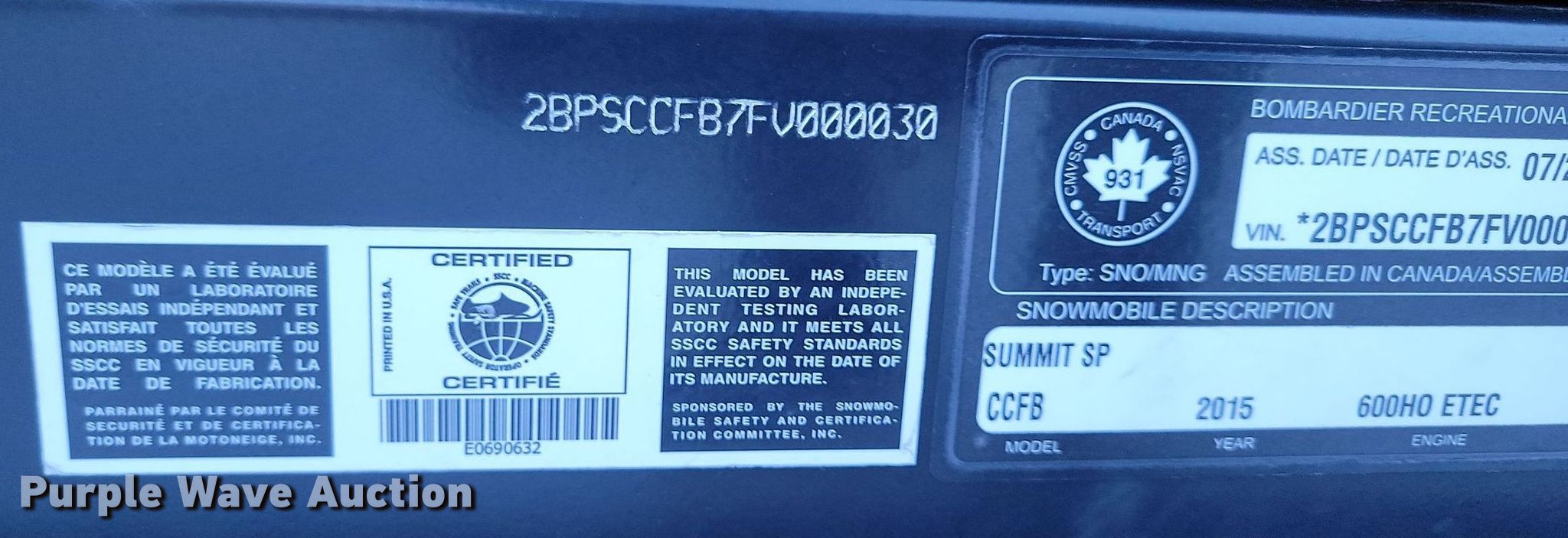 Purple Wave is selling a used ATV in South Dakota. This item is a 2015 Ski-Doo Summit SP 600 HDE-TECH snowmobile with the following: Miles: 8,328 on odometer, VIN: 2BPSCCFB7FV000030, Unit #: GFP04