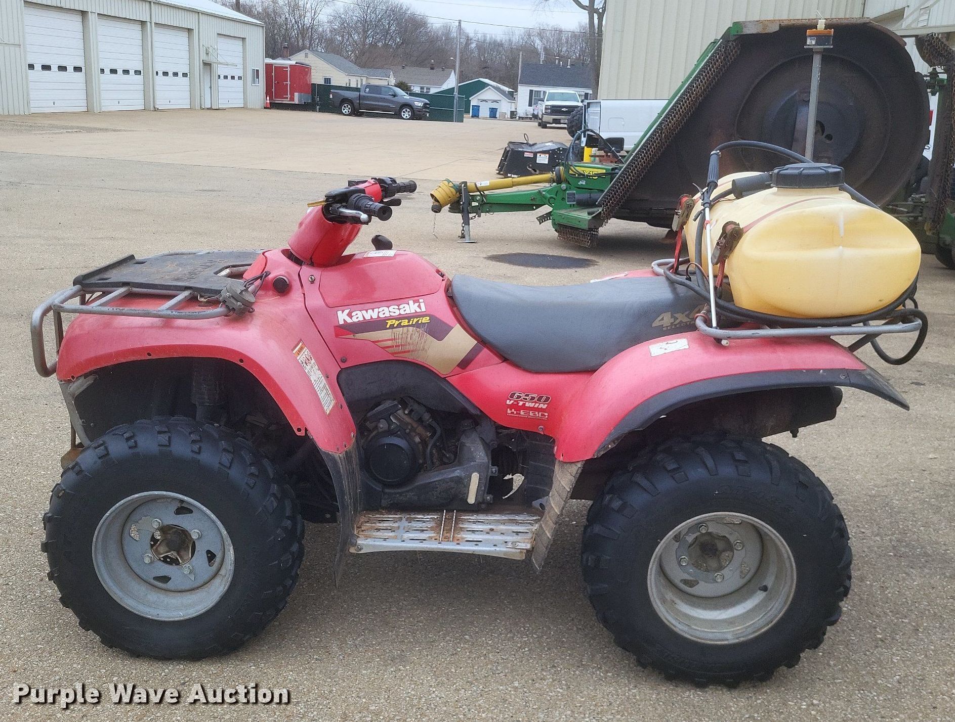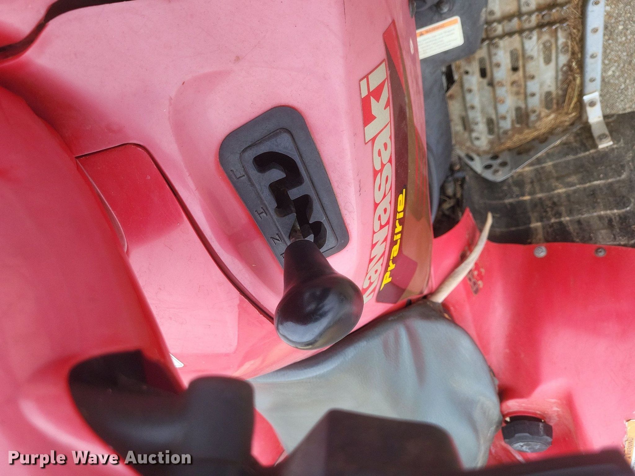 Purple Wave is selling a used ATV in Missouri. This item is a 2002 Kawasaki Prairie 650 ATV with the following: Miles: 2,380 on odometer, Hours: 513 on meter, VIN: JKAVFEA162B503042