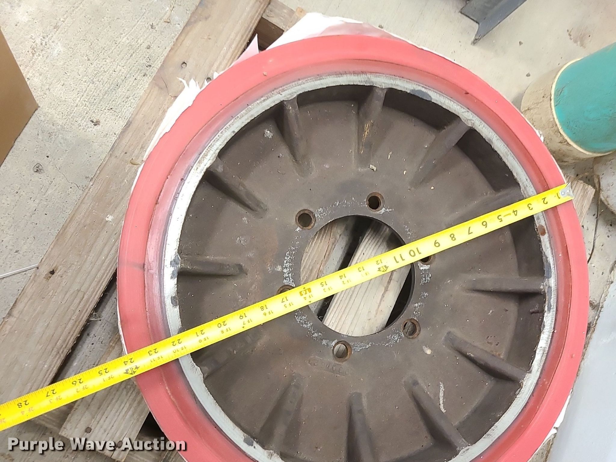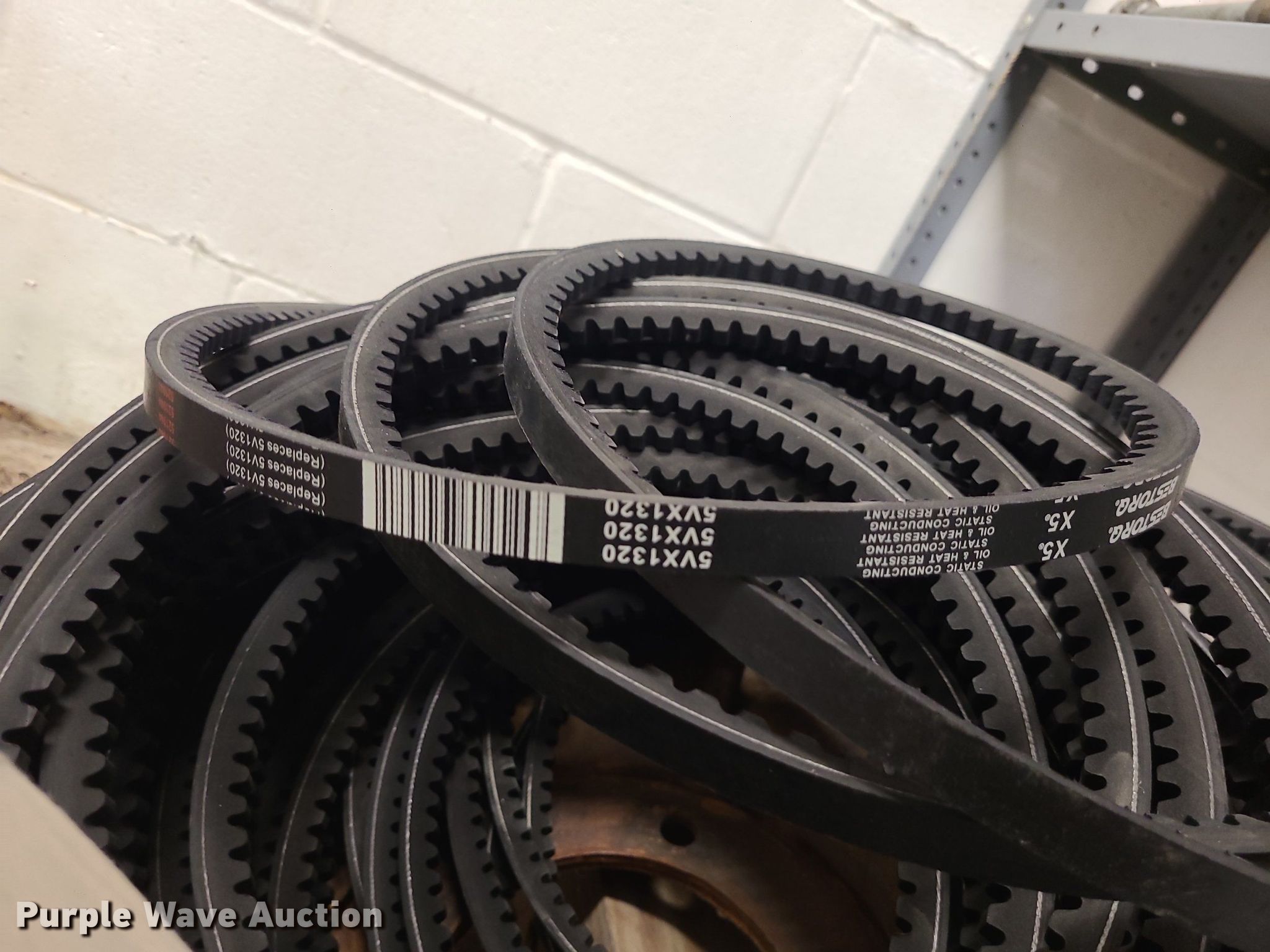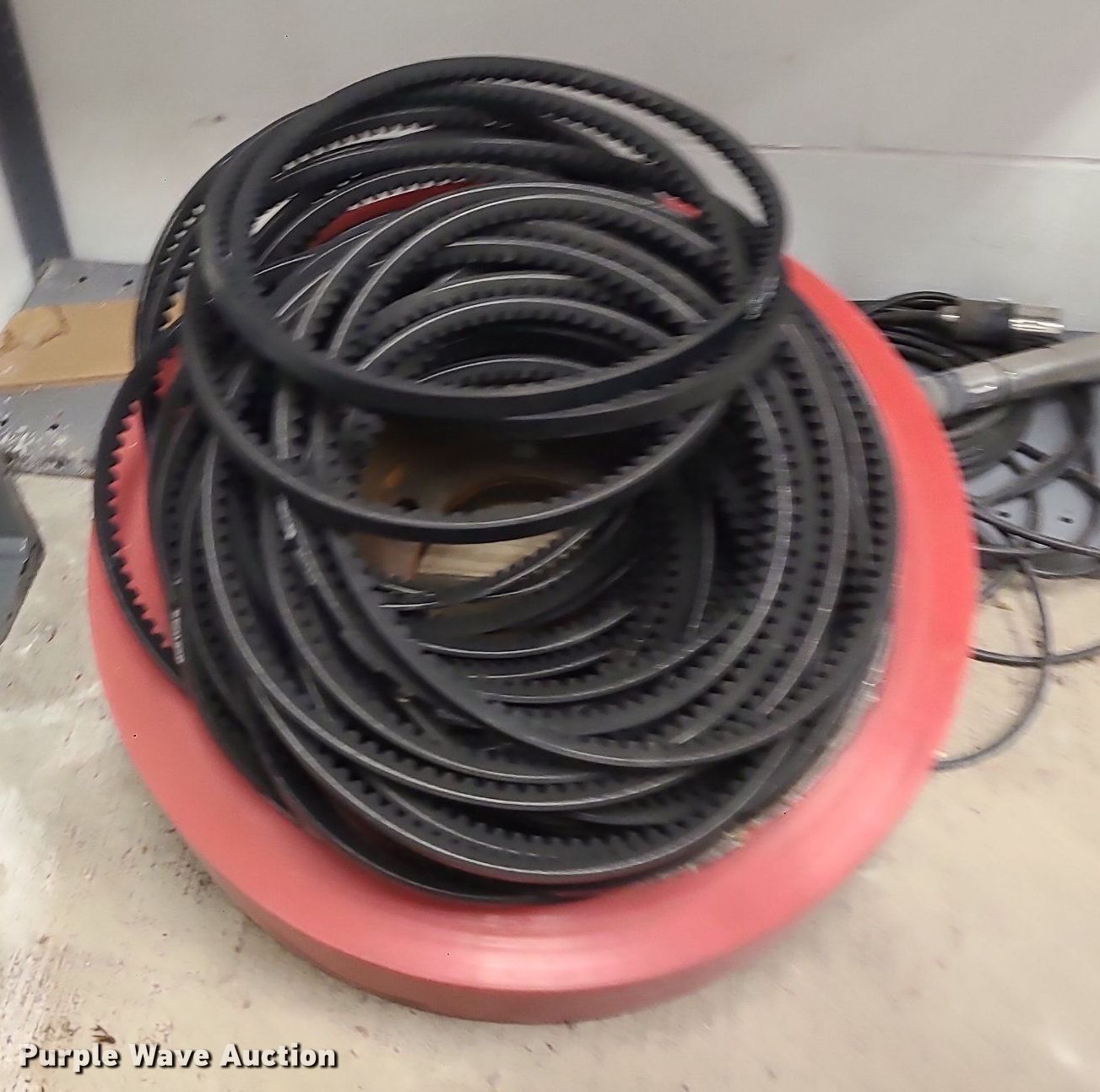 Purple Wave is selling a used Tools in Missouri. This item is a Parts with the following: (2) bridge wheels, Dimensions: 6" x 24", (2) 71936 air filters, Approx. 25 belts, Dimensions: 6" x 24"