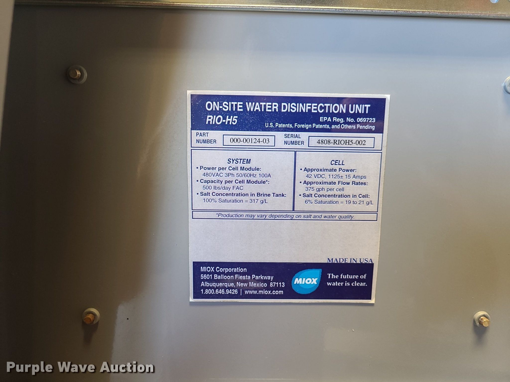 Purple Wave is selling a used Appliances in Missouri. This item is a (2) Miox Rio-H5 mixed oxidant generators with the following: Serial: 4808-RIOH5-002, Serial: 4808-RIOH5-001, Unknown operating condition