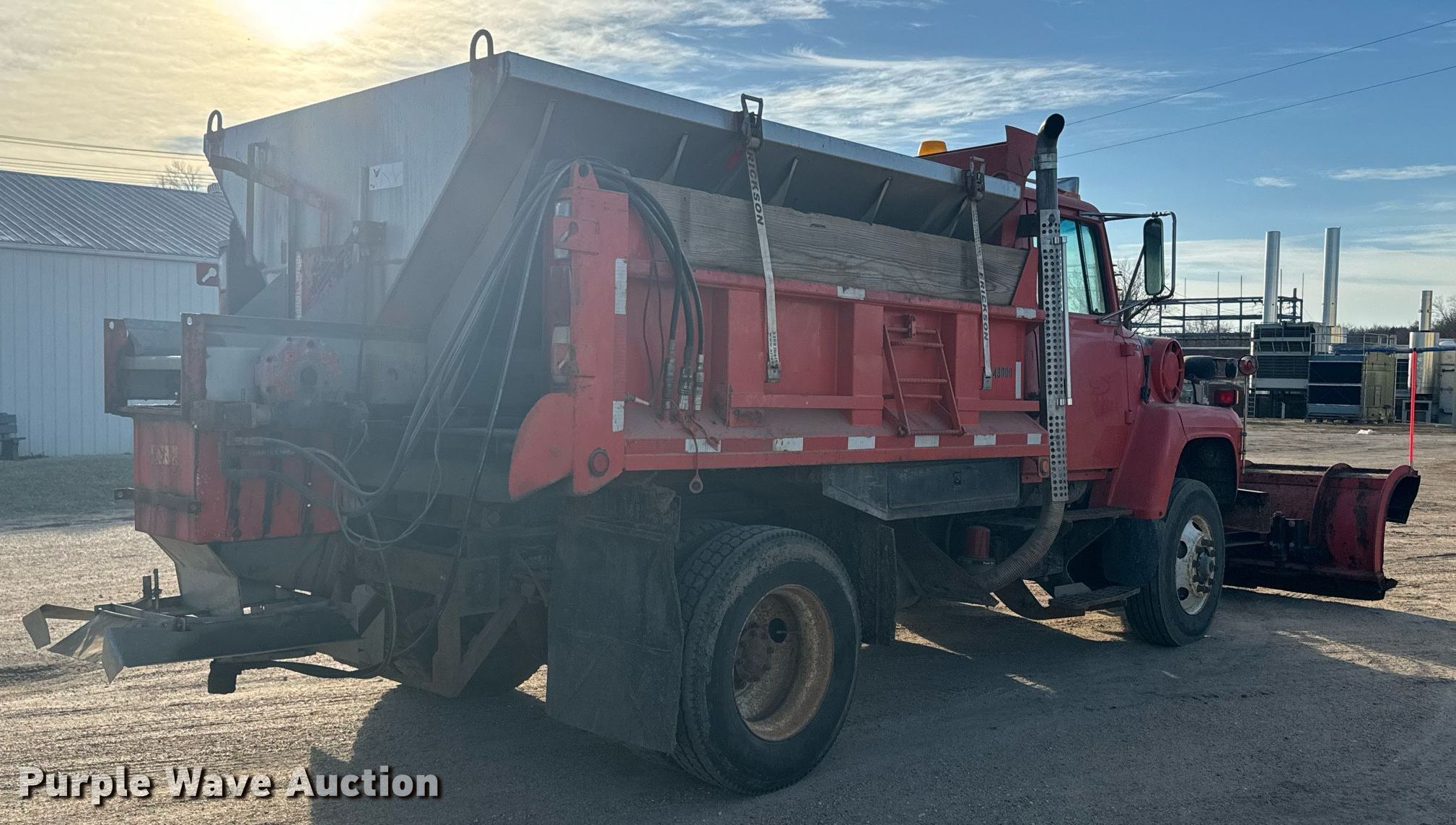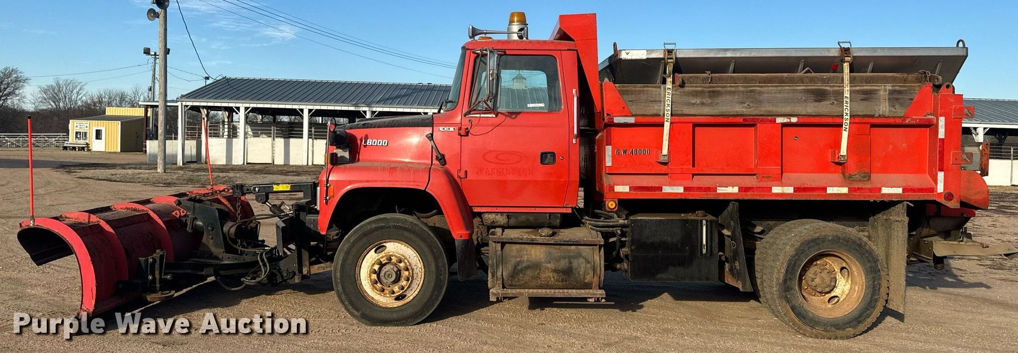 1995 Ford L8000 dump truck. Miles: 183,531 on odometer, Hour: 493 on meter, VIN: 1FDYR82E7SVA43980. Engine Ford C8.3, Displacement: 8.3L, Cylinders: 6, Fuel type: Diesel. Transmission Allison, Automatic. Chassis Axles: Single, Differential lock: Inter-axle, Suspension: Spring, Brakes: Air, Front mount PTO, GVWR: 35,920 lbs FAWR: 13,220 lbs, RAWR: 22,700 lbs, Wheelbase: 150". Interior Heat, Heated mirrors. Features Dump bed 10' L x 98" W, Side height: 24", Side board height: 11", Bed type: Steel, Ram: Single, End gate: Air operated, Spreader Swenson, Plow Flink PF91, Width: 120". Tires Size: 295/75R22.5. Kansas title. Title distribution may be delayed up to 14 days from verification of funds. City of Washington. 1004 D St. Washington, KS 66968