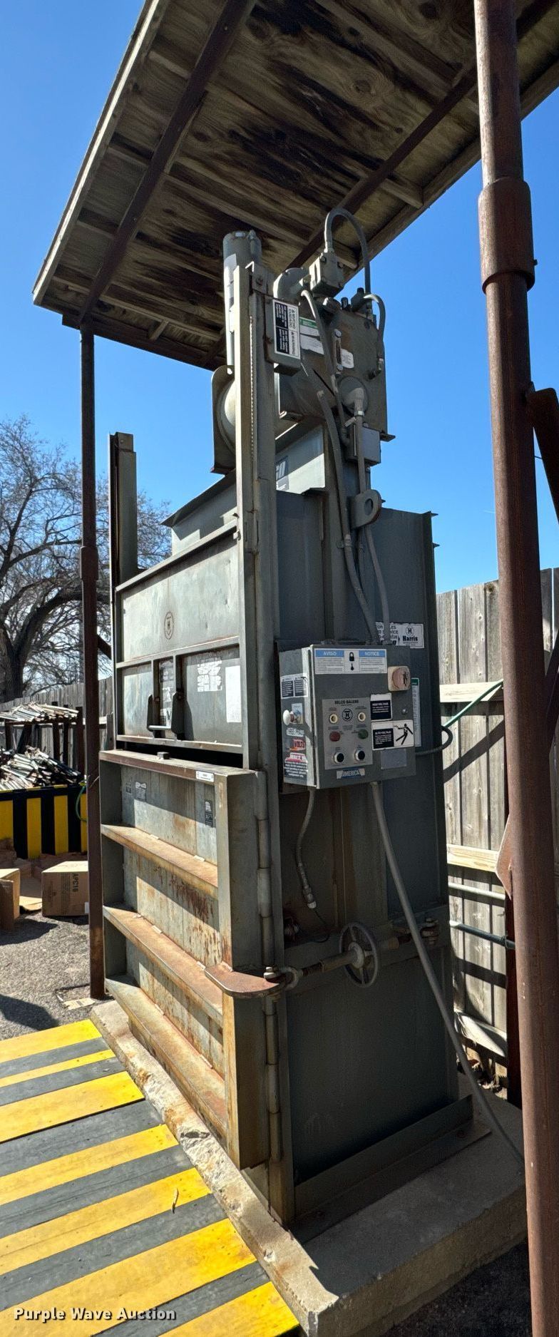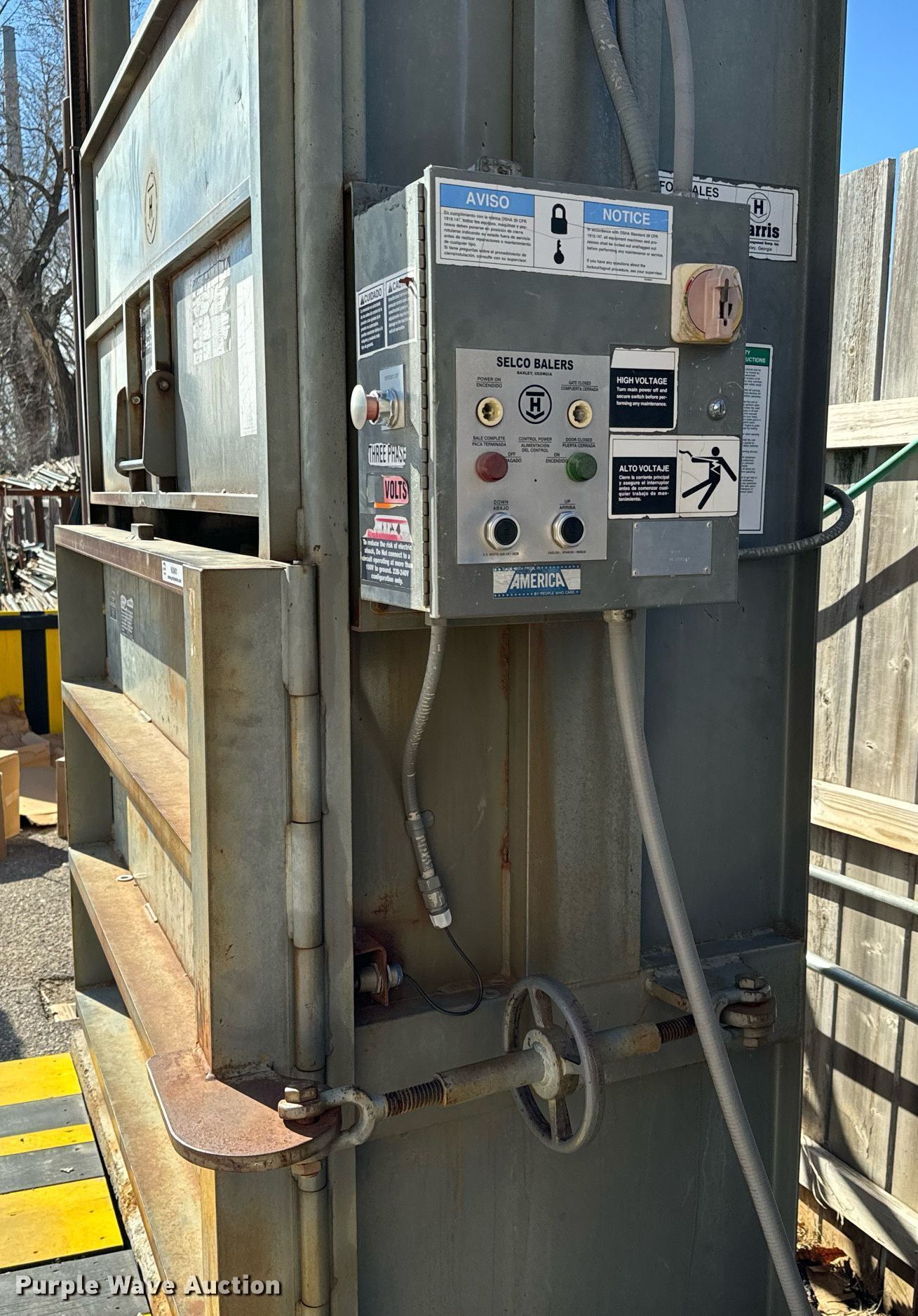 Purple Wave is selling a used Refuse or Compaction Equip. in Kansas. This item is a Selco Balers V1-5 cardboard baler with the following: Three phase, 5' x 4' bales, 12' 4" x 74" x 40"