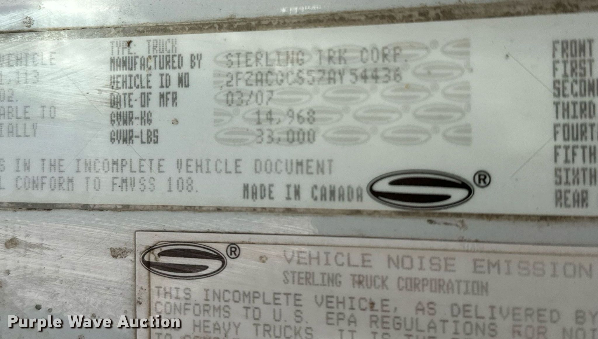 Purple Wave is selling a used Refuse Truck in Kansas. This item is a 2007 Sterling Acterra refuse truck with the following: Miles: 133,699 on odometer, Miles or hours may vary, unit still in use, VIN: 2FZACGCS57AY54436