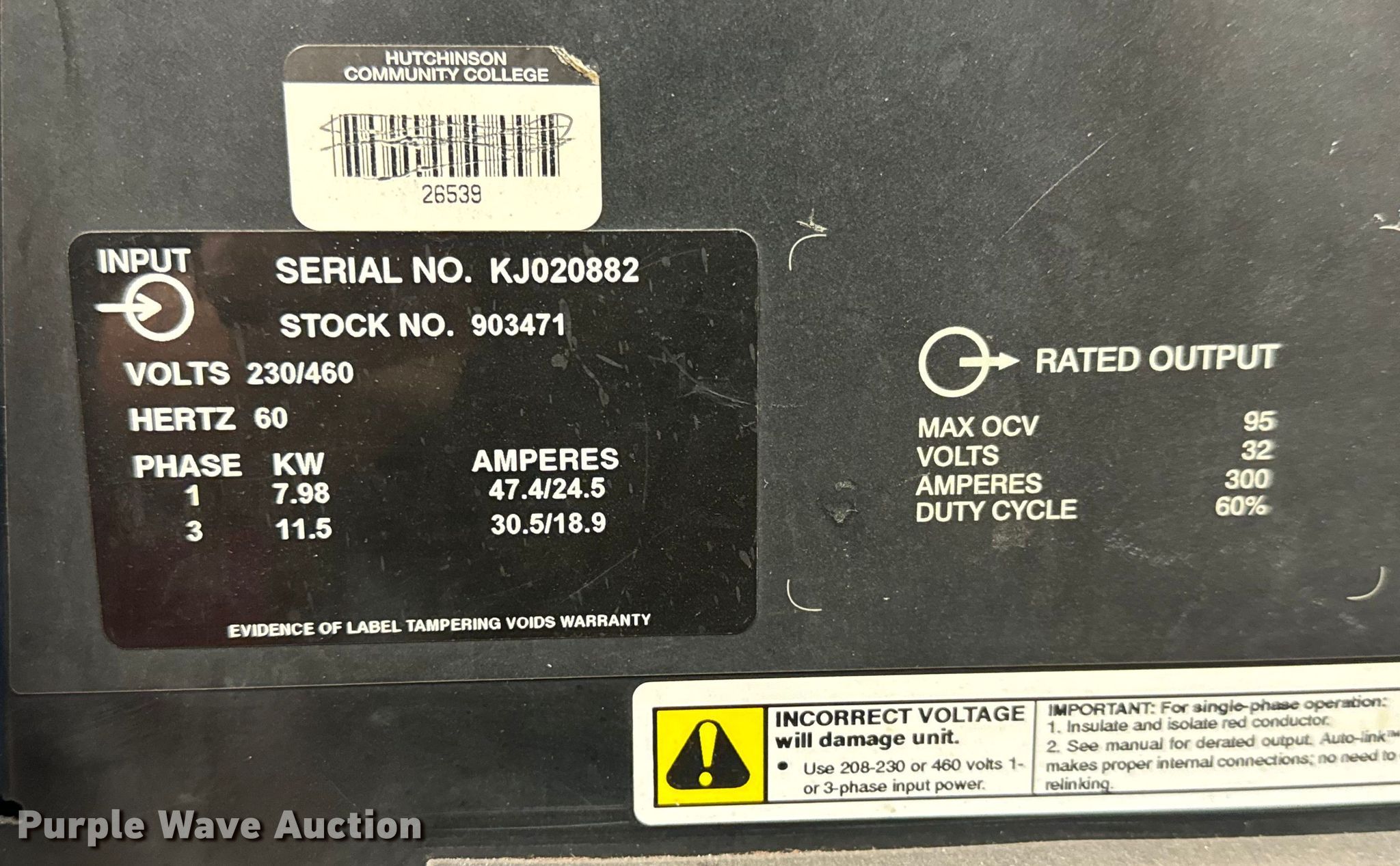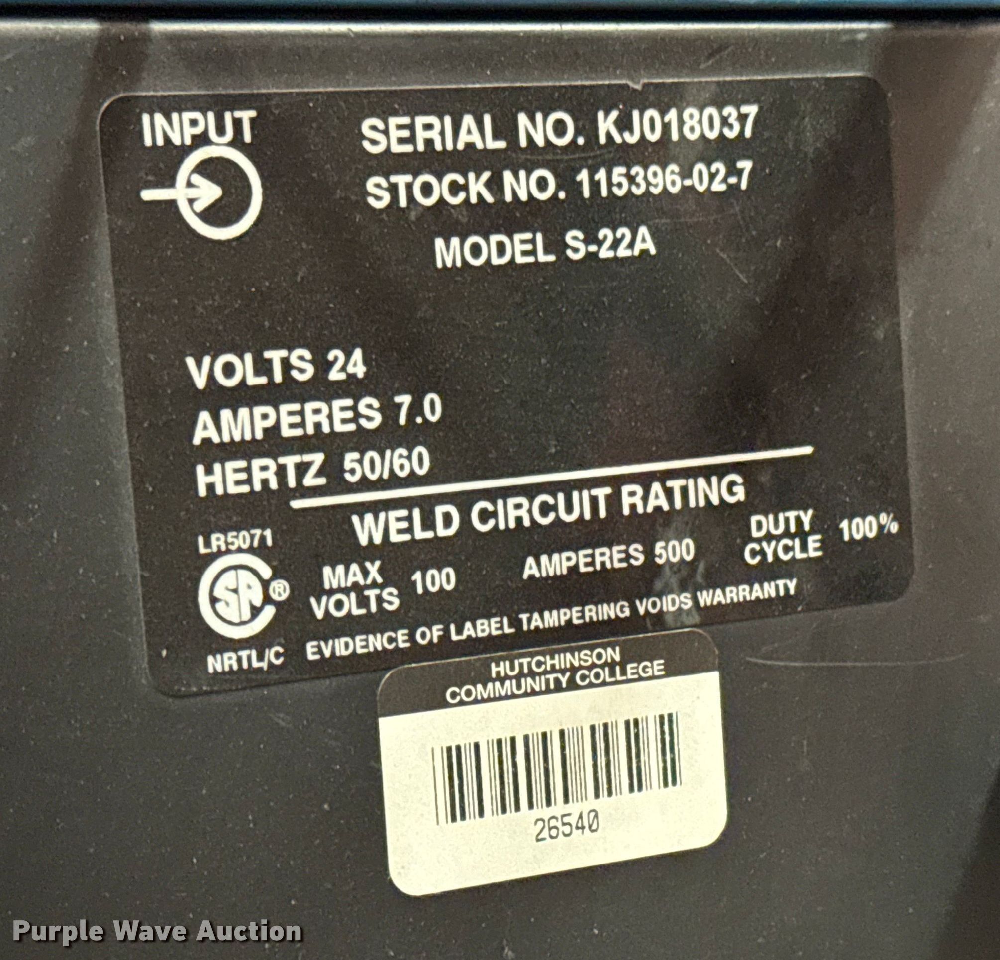 Miller XMT 304 CC/CV welder. Serial: KJ020882. Electric Motor Phase: Single, Three, Volts: 230/460. Features Welder Capabilities: CC, CV, DC, Wire, MIG, TIG, Stick, Bottles not included, Leads, Miller S-22A wire feeder, Tweco style guns, Tweco consumables. Notes Spool of wire not included. Hutchinson Community College. 1800 East Essex Road. Hutchinson, KS 67501