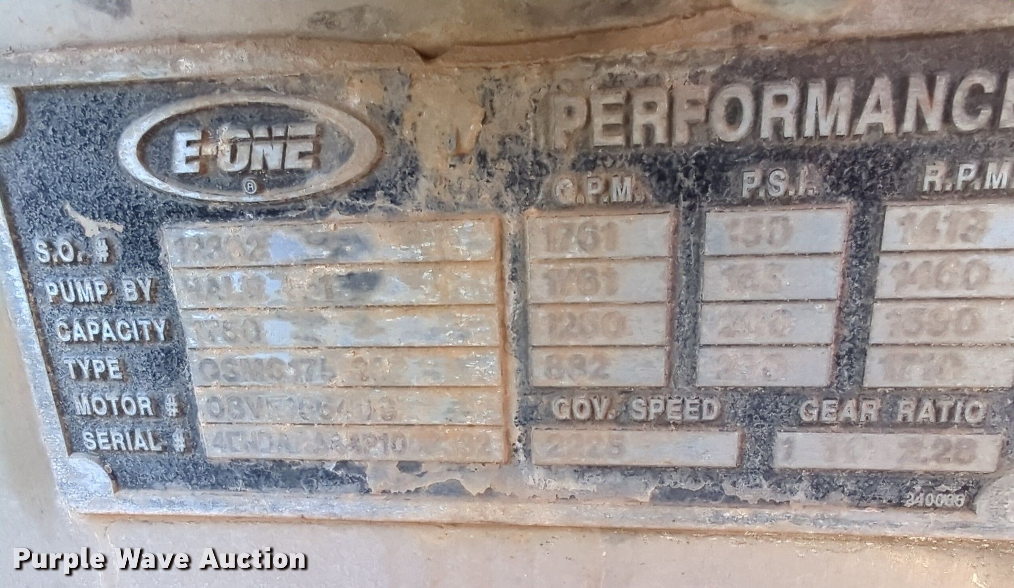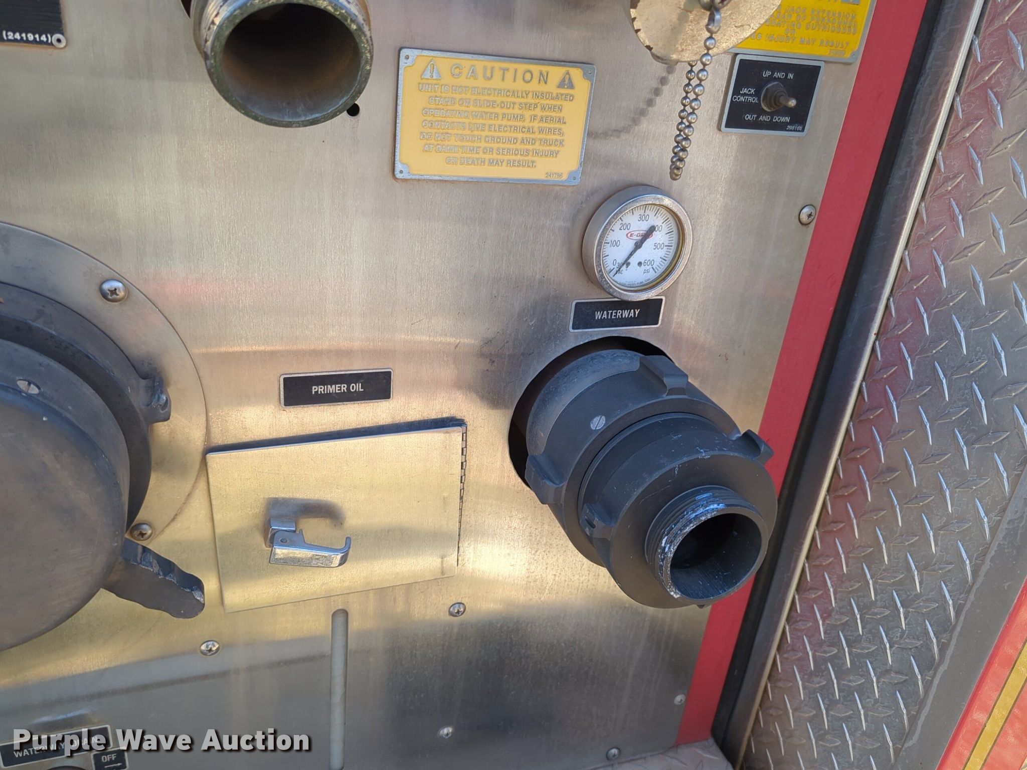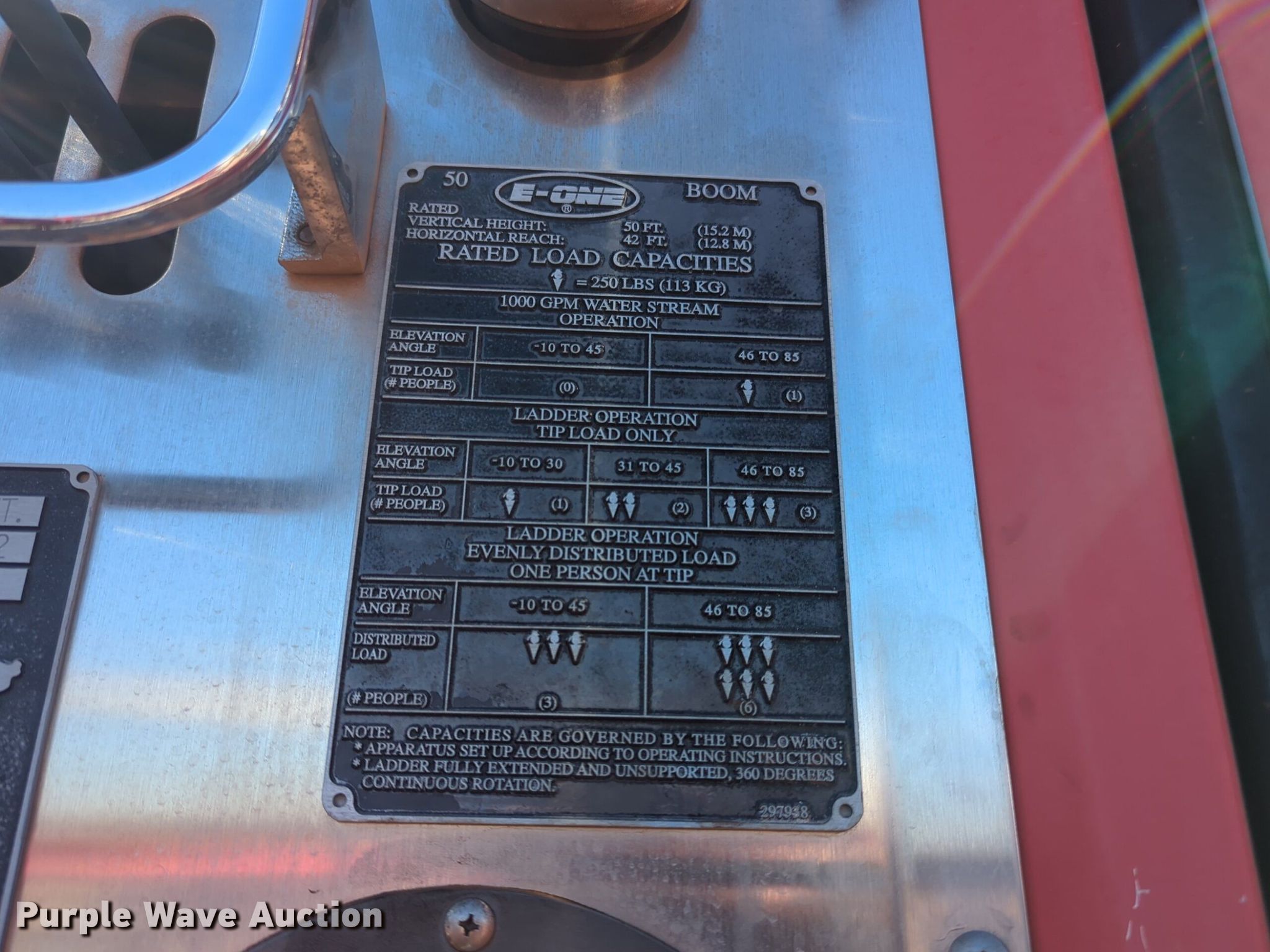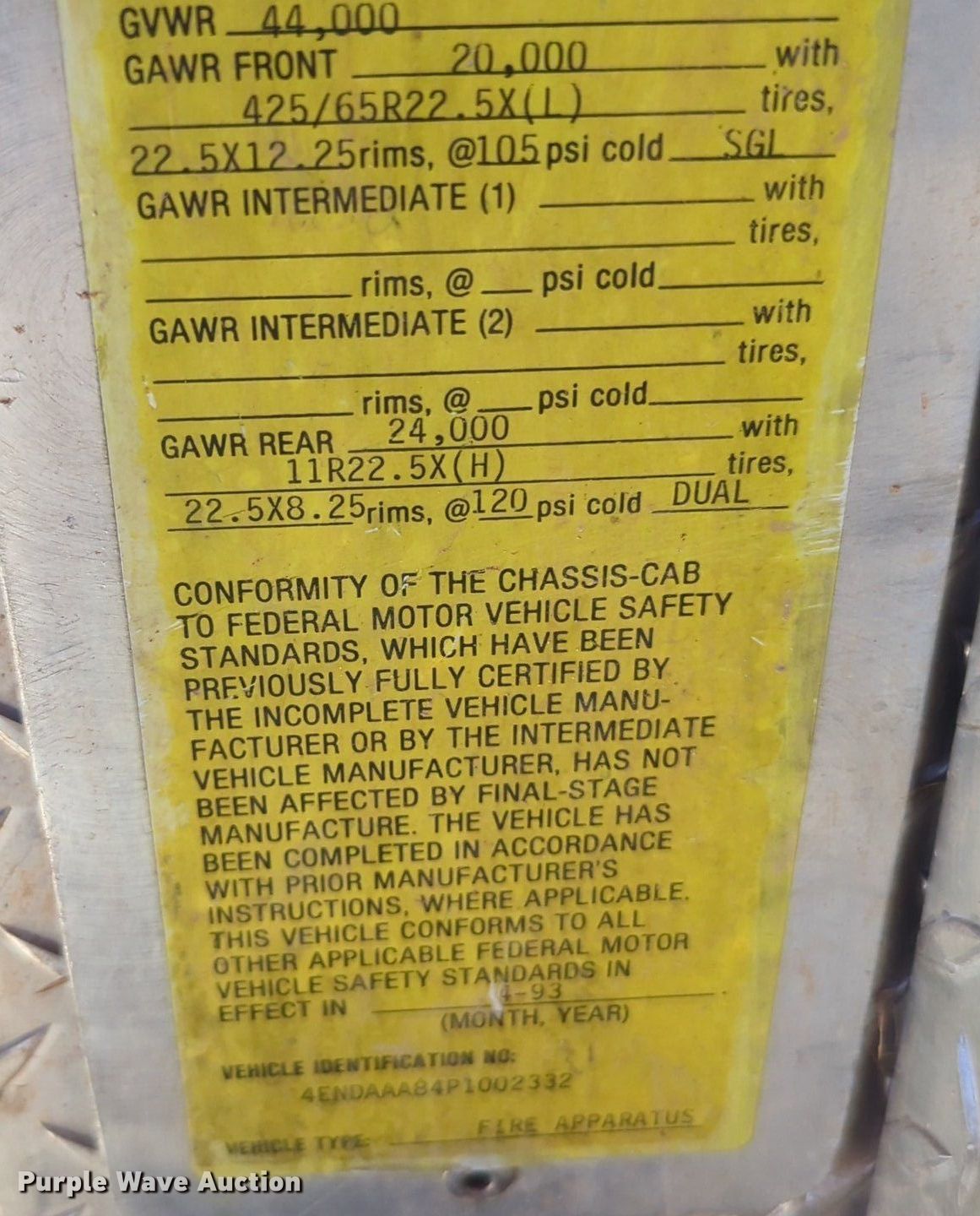 1993 E-One Cyclone ladder fire truck. Miles: 114,599 on odometer, Hours: 5,492 on meter, VIN: 4ENDAAA84P1002332. Engine Detroit Diesel, Displacement: 9.3L, Cylinders: 8, Fuel type: Diesel. Transmission Automatic. Chassis Axles: Single, Suspension: Spring, Brakes: Air, GVWR: 44,000 lbs. Interior AC, Heat. Features Fire truck body Aerial Maximum height: 50', Maximum lift capacity: 250 lbs, Stabilizers Quantity: 2, Pump 1,750 gpm, Generator, PA/ siren controls. Tires Front: 425/65R22.5, Rear: 12R22.5. Notes Hydraulic pump leak. Oklahoma title. Title distribution may be delayed up to 14 days from verification of funds. Town of Cashion. 402 North Main Street. Cashion, OK 73016