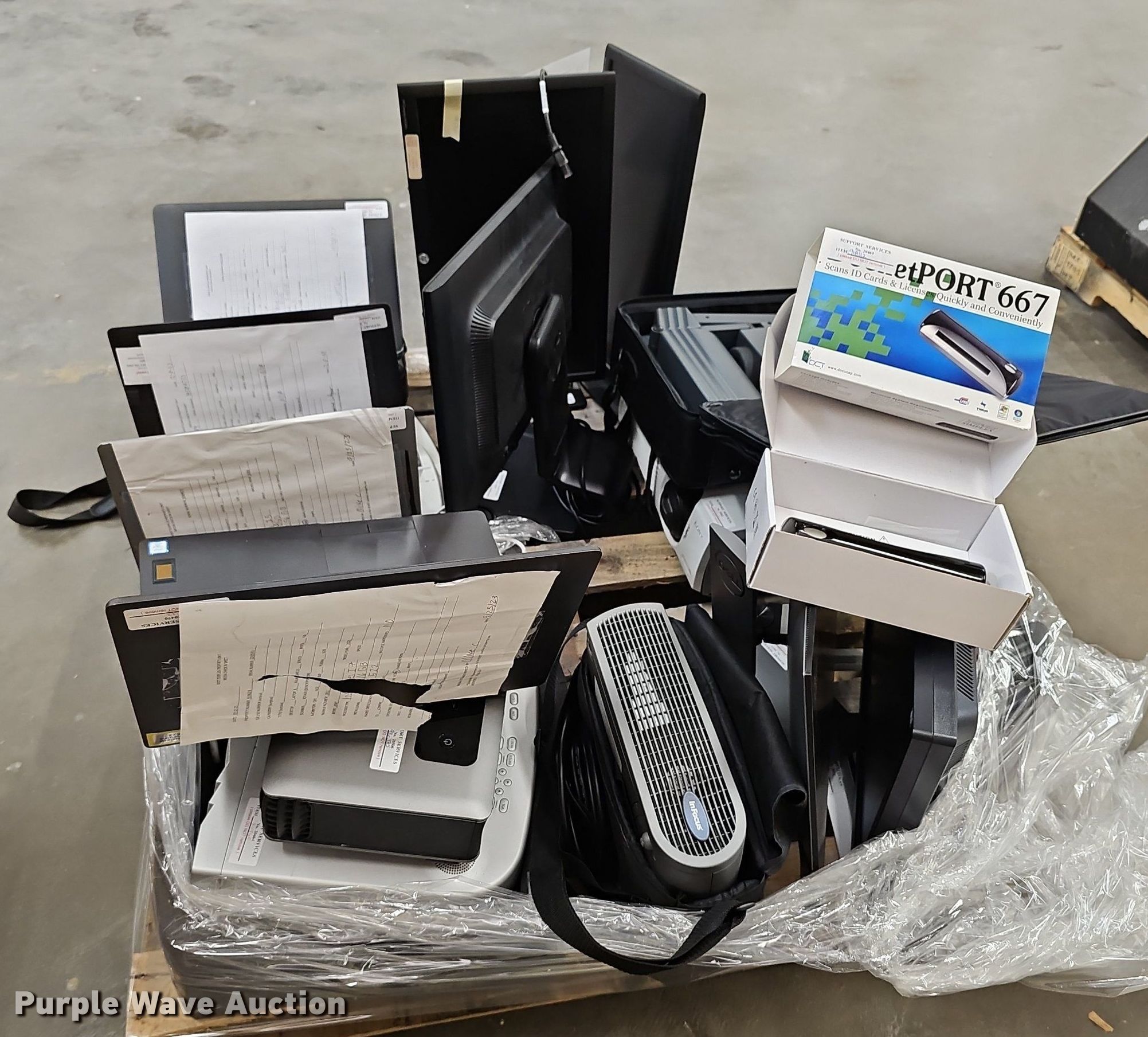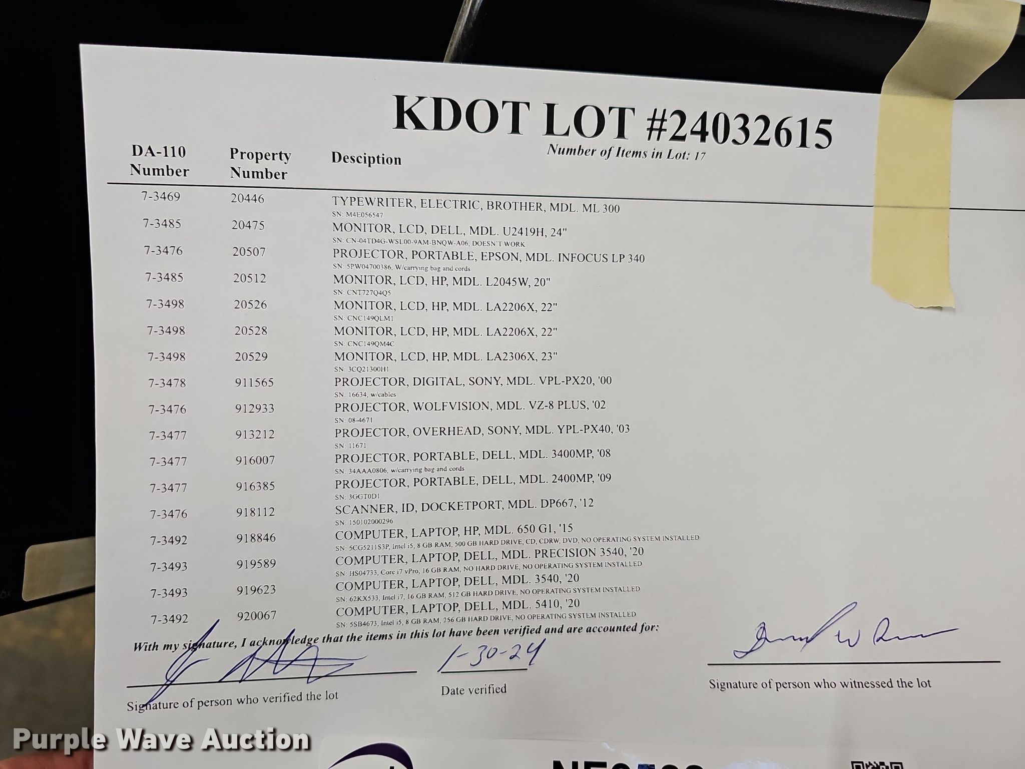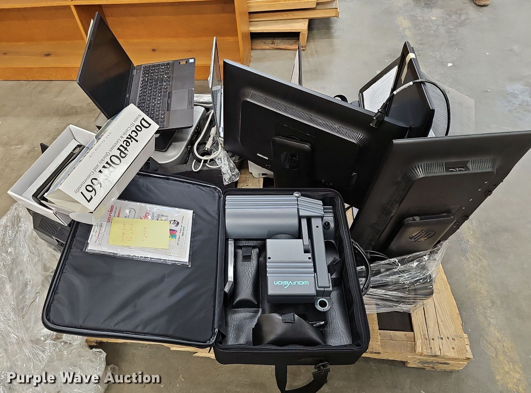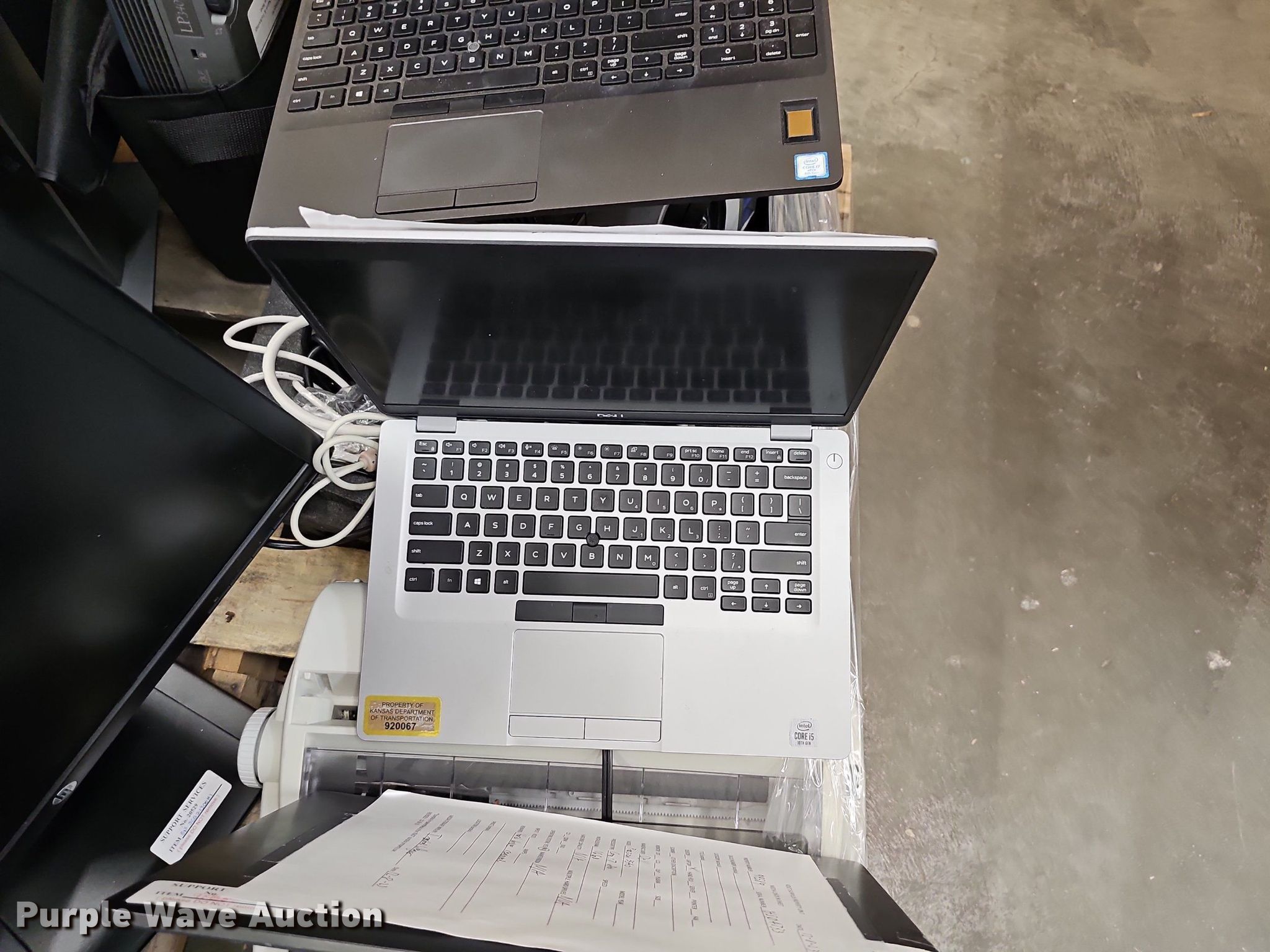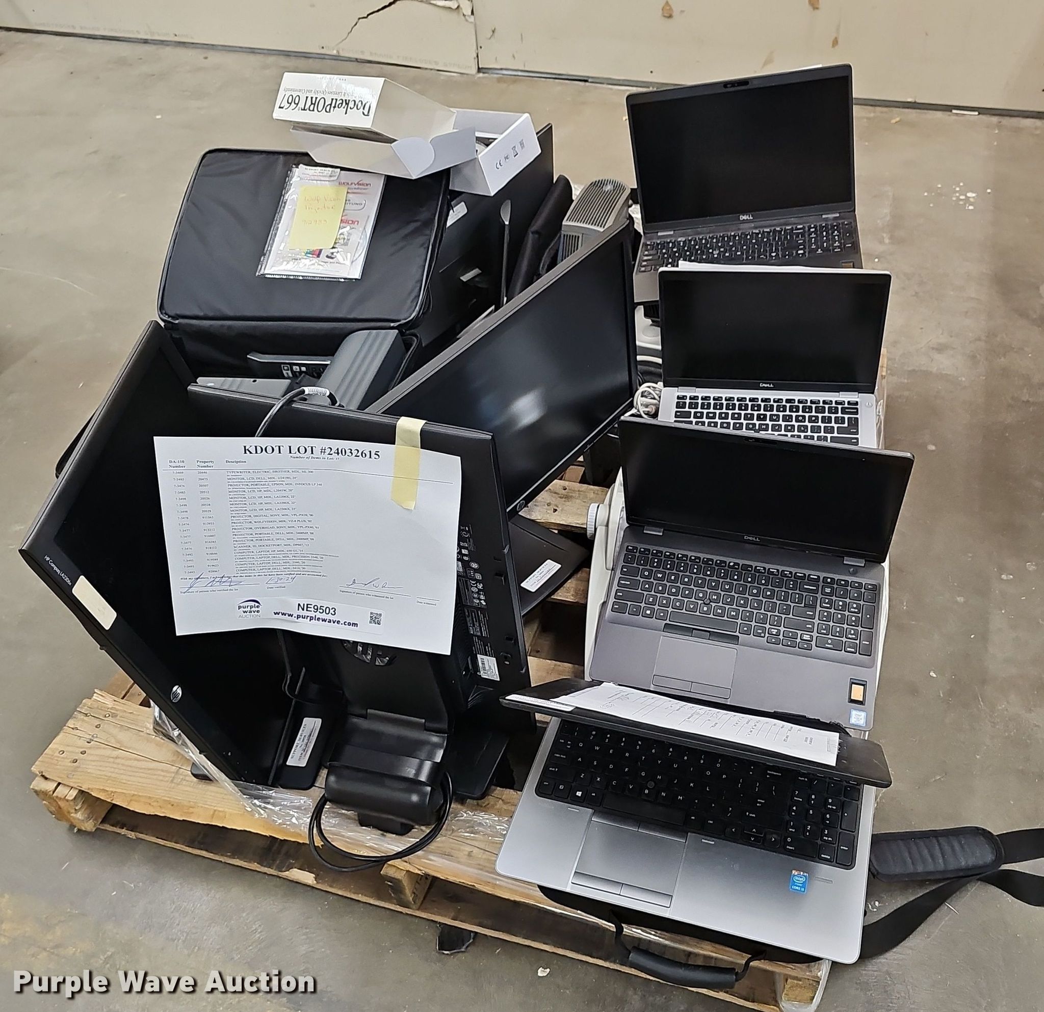 Purple Wave is selling a used Electronics in Kansas. This item is a Electronics with the following: KDOT ID: 24032615, (4) laptops, (3) Dell, HP, Hard drives have been reformatted and no operating system installed, (5) monitors, (4) HP, Dell, (6) projectors, (2) Sony, (2) Dell, Epson, Wolfvision, Docketport DP667 scanner, Brother ML 300 typerwriter
