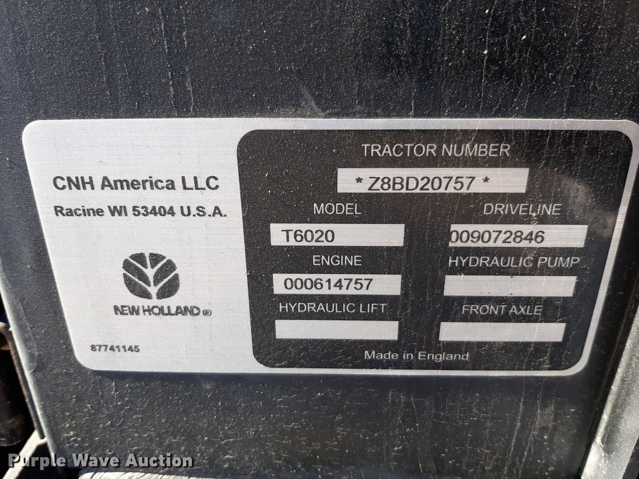 Purple Wave is selling a used Tractor in Kansas. This item is a 2008 New Holland T-6020 tractor with the following: Hours: 5,003 on meter, Serial: Z8BD20757, KDOT ID: 352-5098