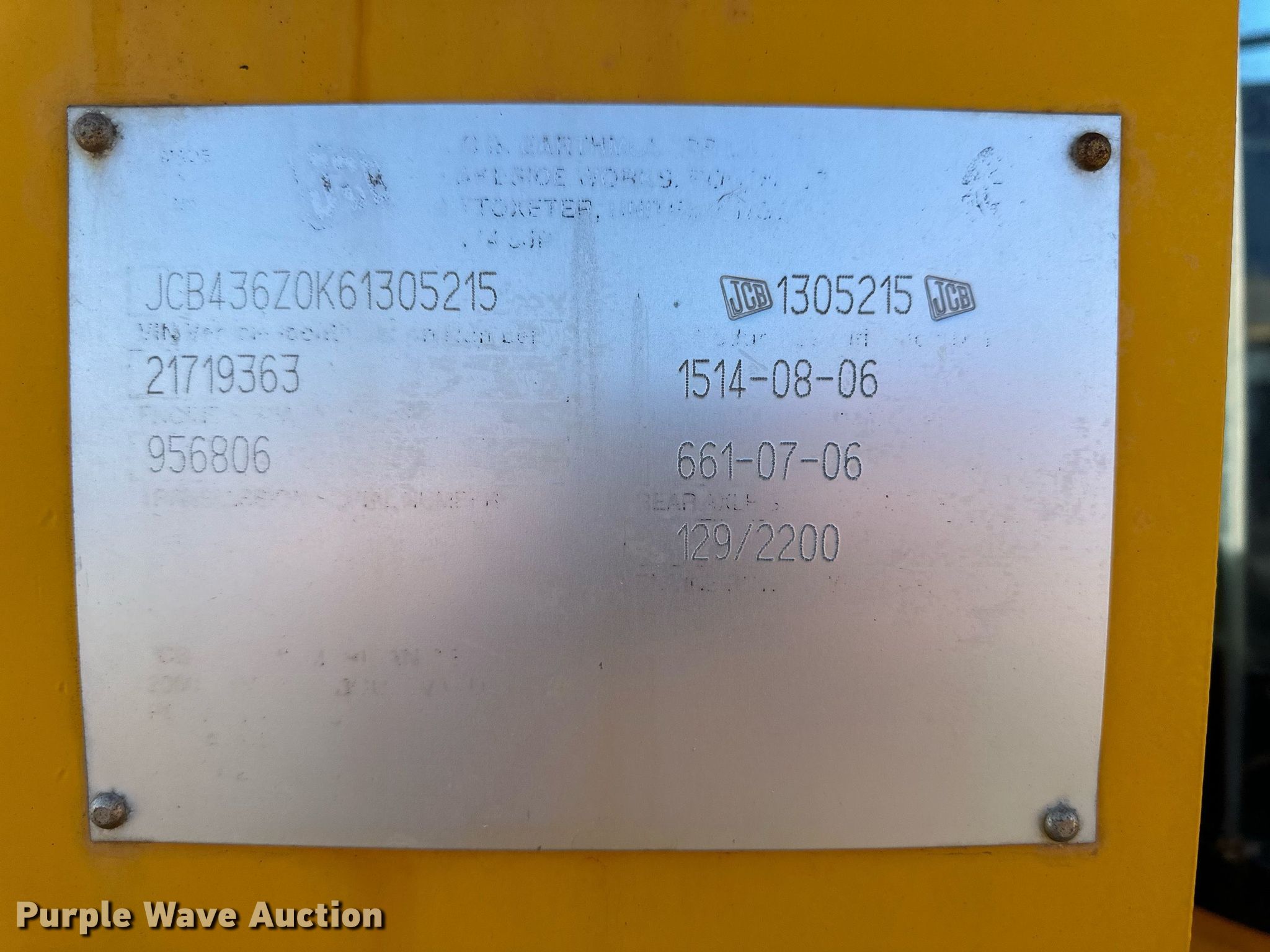 Purple Wave is selling a used Wheel Loader in Kansas. This item is a 2006 JCB 436 ZX wheel loader with the following: Last known hours: 2,959, Serial: JCB436Z0K61305215, KDOT ID: 369-6046