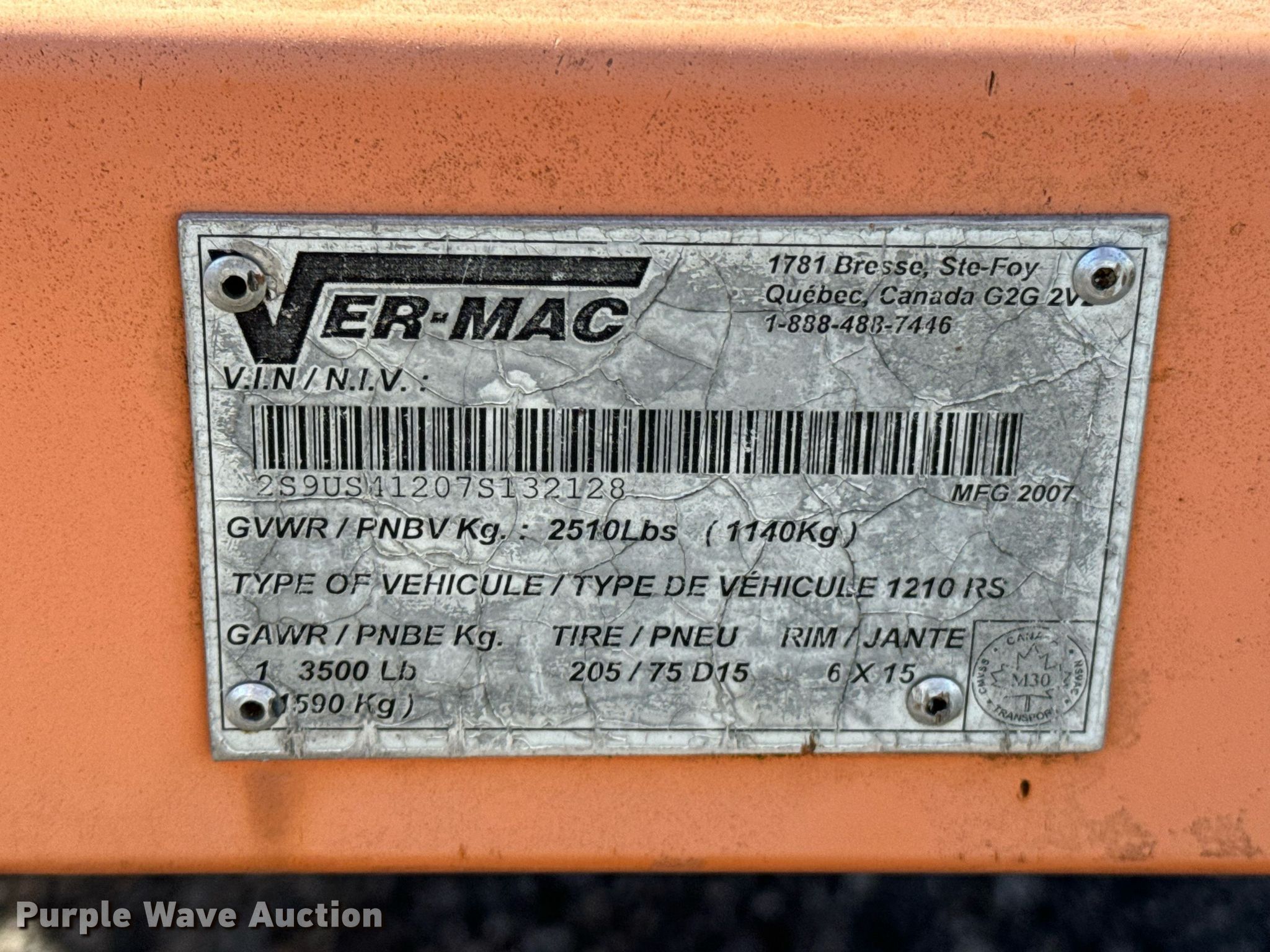 2007 Ver-Mac 1210 message board trailer. VIN: 2S9US41207S132128, Serial: 07-092754, KDOT ID: 553-4057. Dimensions Overall: 11' L x 6' W. Features Deck type: Steel. Chassis Hitch: Pintle, Landing gear: Single, Brakes: Electric, GVWR: 2,510 lbs. Tires Size: ST205/75D15. Notes Dead battery, Unknown operating condition. Transfer documentation will be distributed after confirmation of payment and removal. This is worksite support equipment and will not come with a title. Transfer of ownership documentation will be a bill of sale. Kansas Dept. of Transportation - Chanute. 411 W 14th St. Chanute, KS 66720