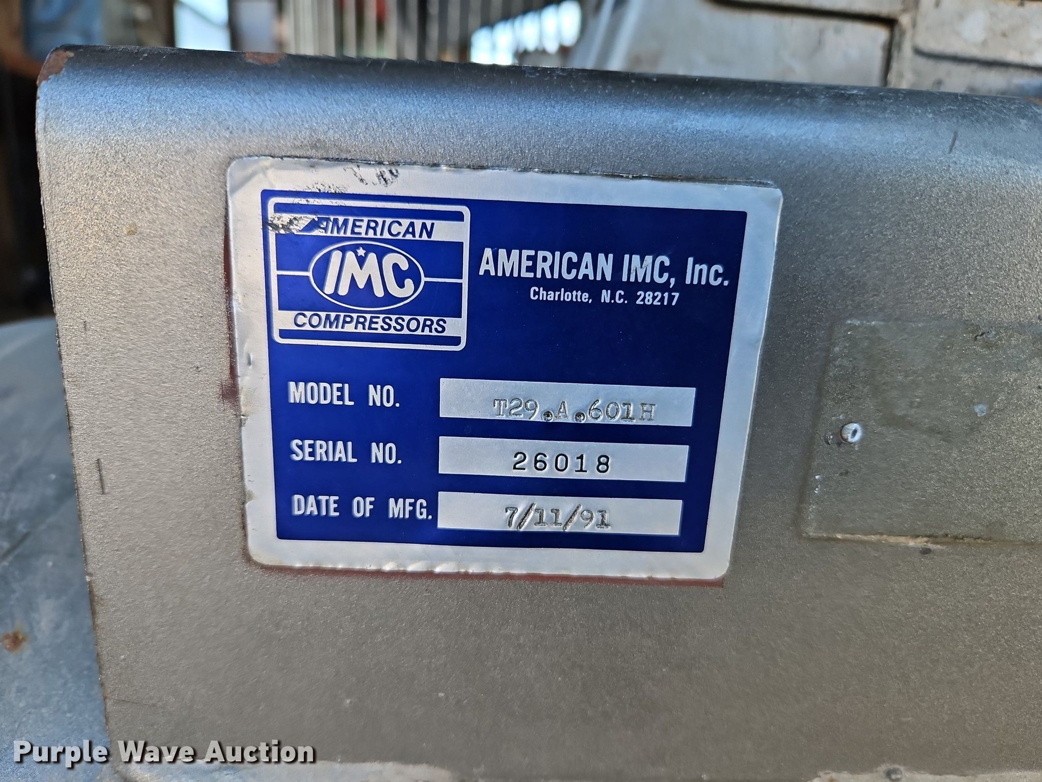Purple Wave is selling a used Air Compressor in Kansas. This item is a American IMC T29.A.601H air compressor with the following: Serial: 26018, KDOT ID #: 4192