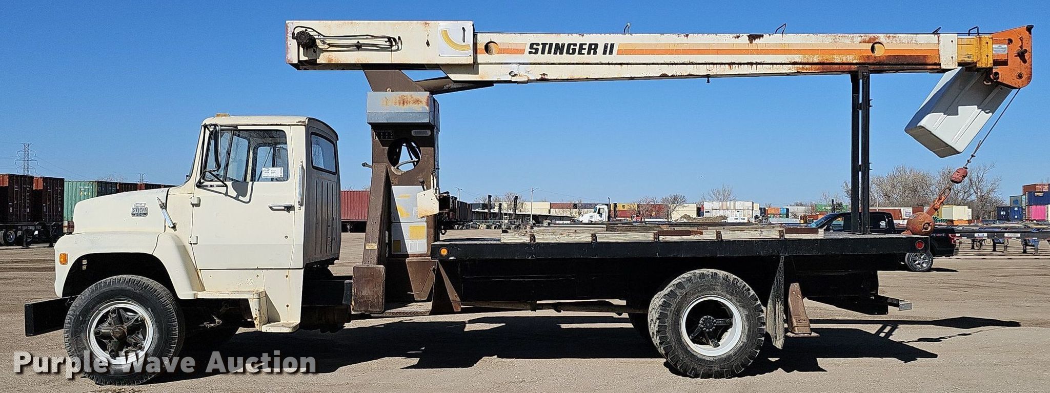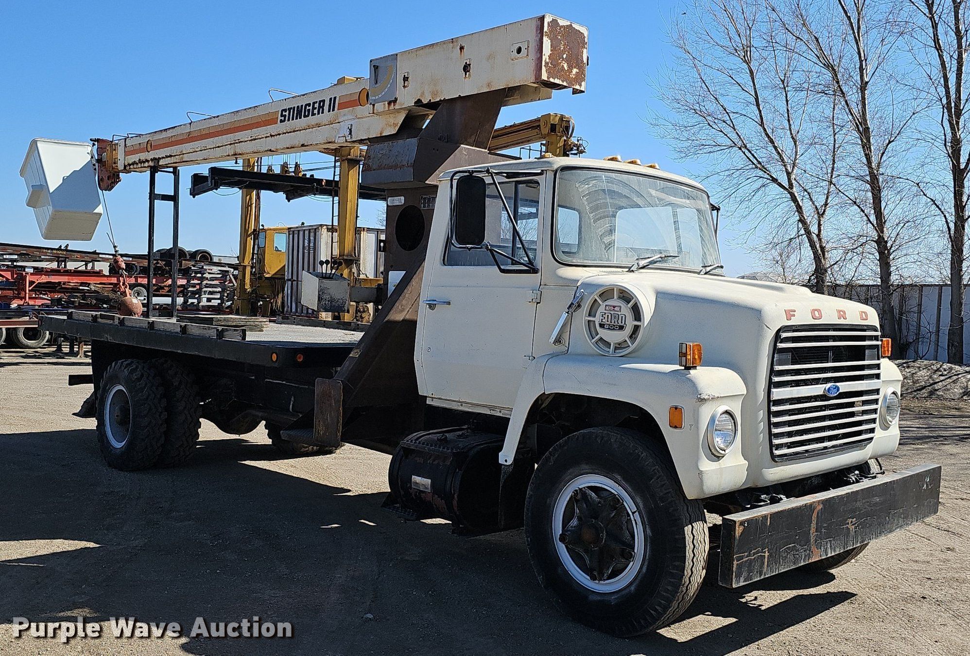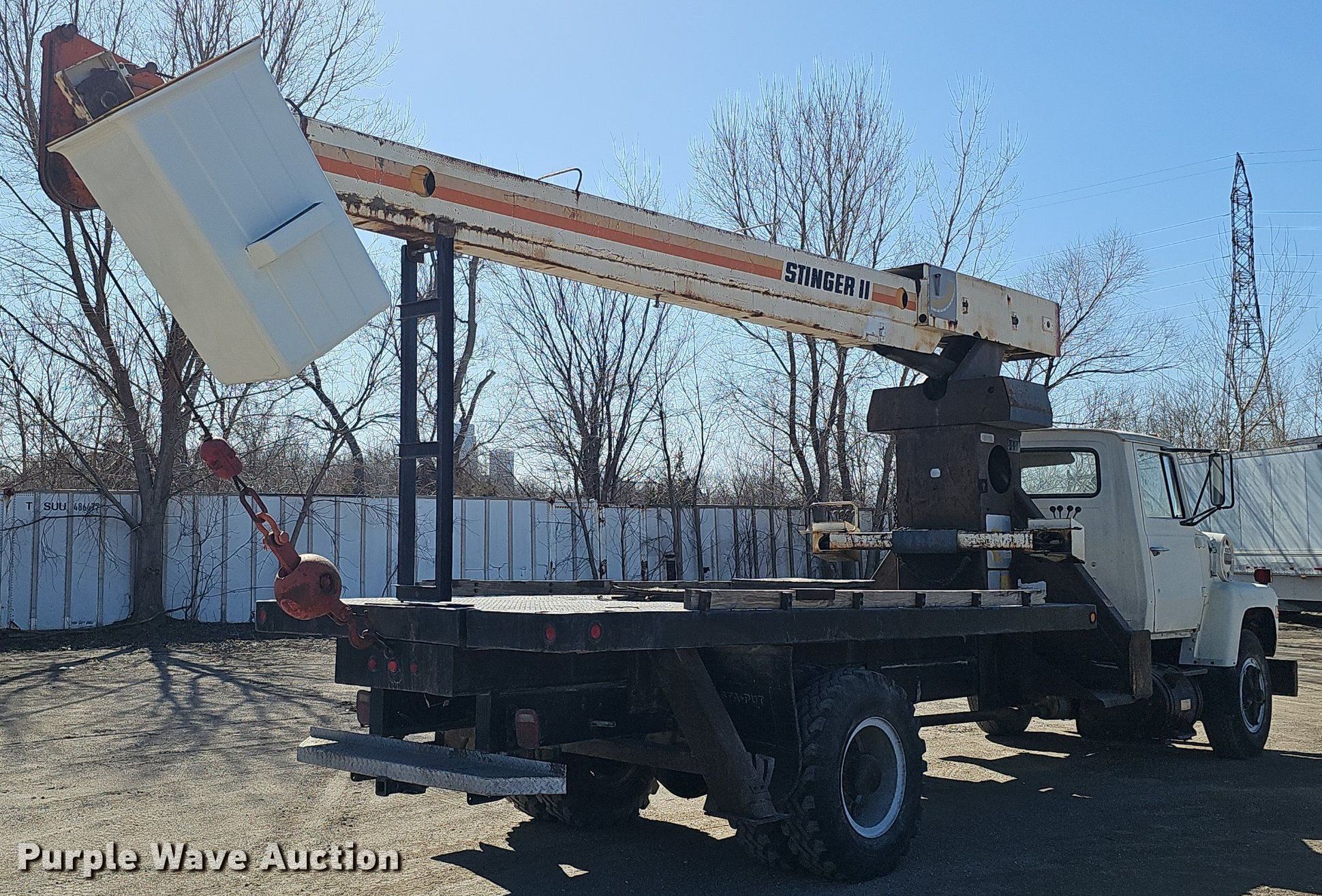 1979 Ford 800 crane truck. Miles: 194 on odometer, VIN: N80BVDK0415. Engine Model: 370-4V, Cylinders: 8, Fuel type: Gas. Transmission Manual, Speed: 5, plus 2. Chassis Axles: Single, Suspension: Spring, Brakes: Hydraulic, PTO, GVWR: 27,500 lbs, Wheelbase: 223". Interior Heat. Features Bed 16' L x 94" W, Boom Stinger II, Serial: 1130379357, Boom length: 60', Maximum lift capacity: 6,600 lbs, Boom type: Telescopic, Man basket, Boom controls Ground.. Tires Size: 10.00-20. Notes Boom hydraulic leak. Nebraska title. Mileage has not been verified. Exempt will be written in the odometer disclosure on the title. Title distribution may be delayed up to 14 days from verification of funds. 2501 North 11th Street. Omaha, NE 68110
