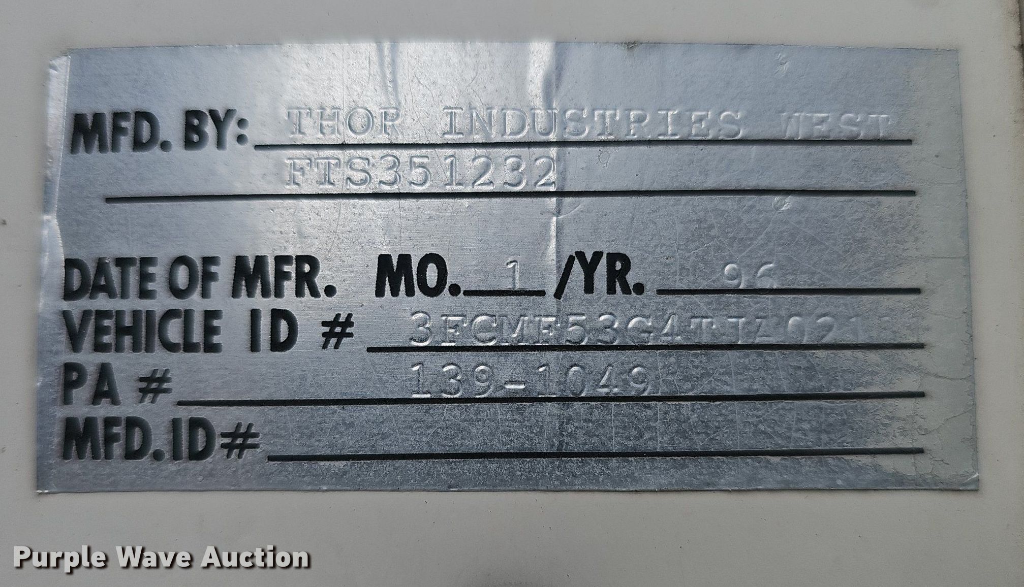 1996 Thor West Residency 3650 FTS351232 RV. Miles: 54,383 on odometer, Camper length: 36', VIN: 3FCMF53G4TJA02181. Engine Cylinders: 8, Fuel type: Gas. Transmission Automatic. Chassis Axles: Tandem, Suspension: Spring, Brakes: Hydraulic. Interior Kitchen: Sink, Refrigerator, Freezer, Microwave, Stove: Electric, Living room: Table, Pull out couch, Bathroom, Washer, Dryer, Beds: 1 Bed type: Double, TVs: 1, Sound system, Heater, AC units: 2. Features Slide outs: 2, Awnings: 3 Awning type: Manual, Auto leveler, Generator Onan 5BGMFA26105F, Hours: 313 on meter, Fuel type: Gas, kW: 5, Rear hitch. Tires Size: LT235/85R16, Brand: Hankook. Nebraska title. Title distribution may be delayed up to 14 days from verification of funds. Star City Auto Sales. 3101 Cornhusker Hwy. Lincoln, NE 68504