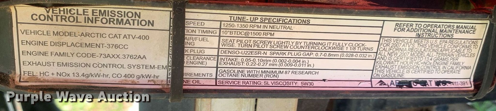 Purple Wave is selling a used ATV in Oklahoma. This item is a 2007 Arctic Cat ATV-400 ATV with the following: Hours: Unknown, VIN: 4UF07ATVX7T230428, Unit #: 212