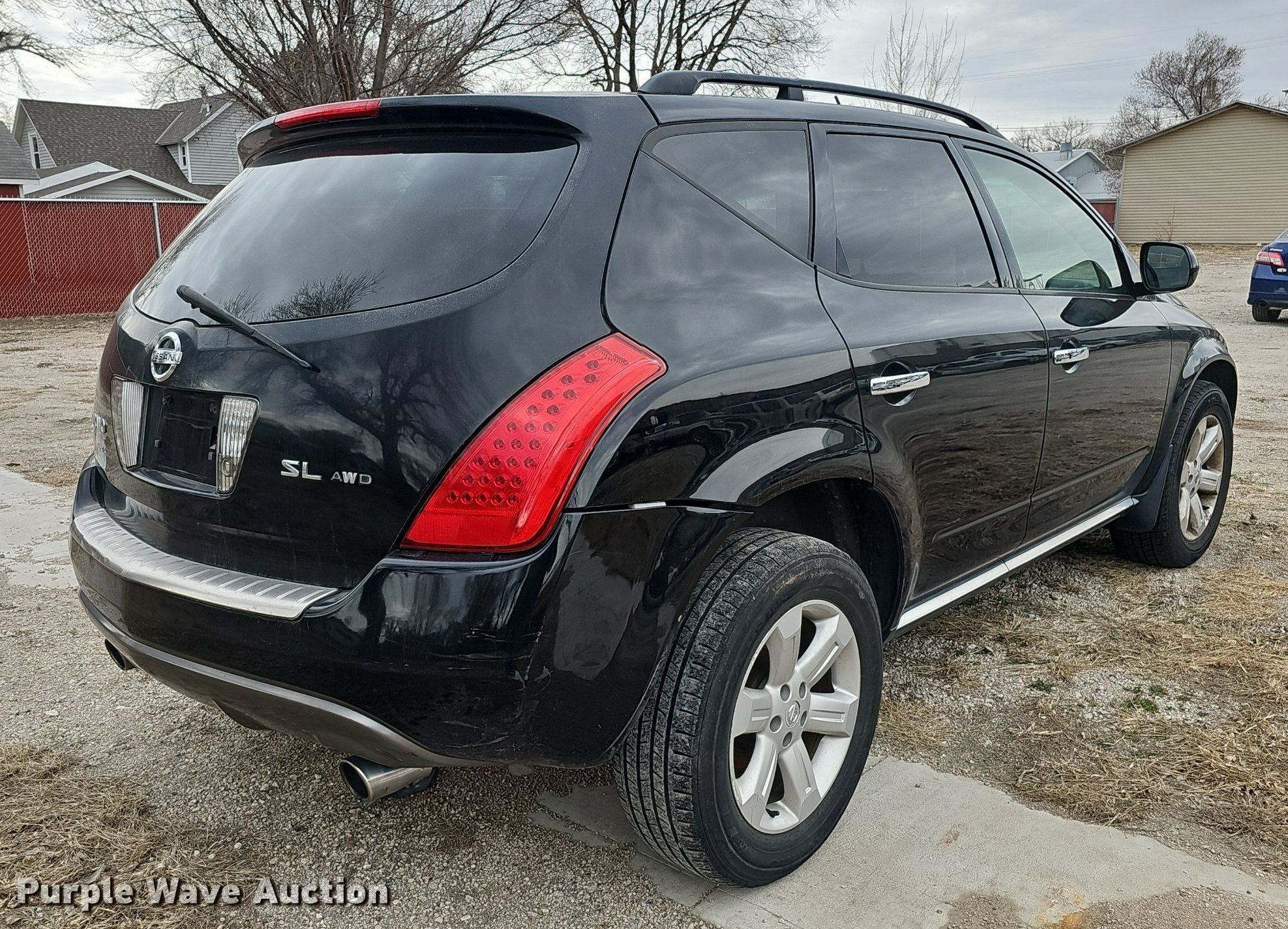 2006 Nissan Murano SL SUV. Miles: 214,067 on odometer, VIN: JN8AZ08W86W533288. Engine Displacement: 3.5L V6 DOHC, Cylinders: 6, Fuel type: Gas. Transmission Automatic, All wheel drive. Interior AC, Heat, Seat: Power driver, Power passenger, Power windows, Power locks, Cruise control, Powered sunroof. Tires Size: 235/65R18. Notes Dash warning indicator: Check engine, Brake, Battery, Oil, Unknown operating condition. Nebraska title. Title distribution may be delayed up to 14 days from verification of funds. LTA Towing LLC. Aurora, NE 68818