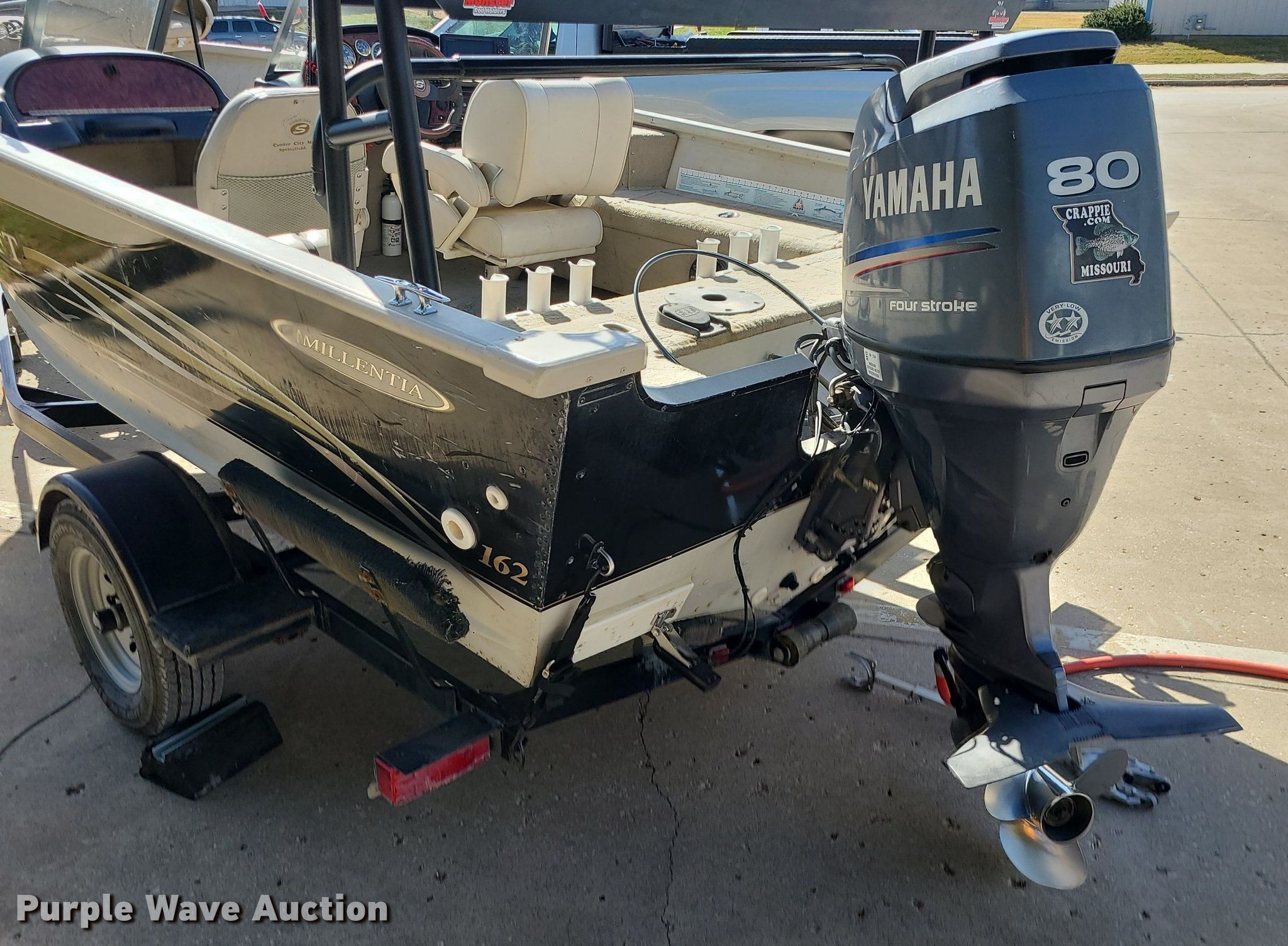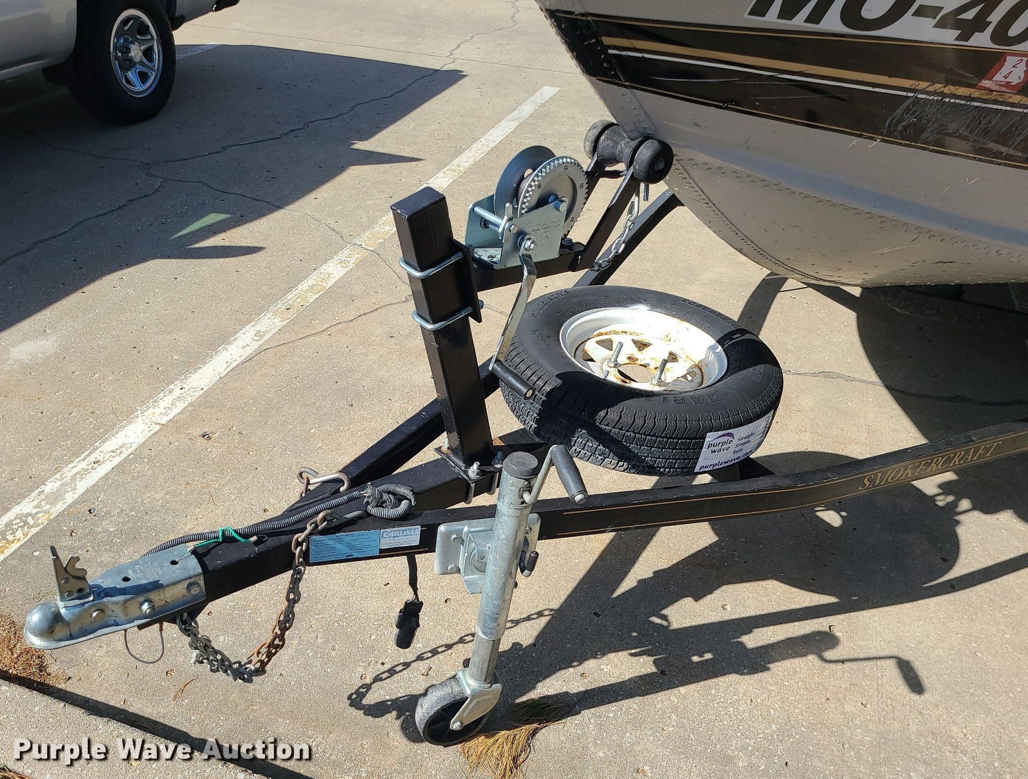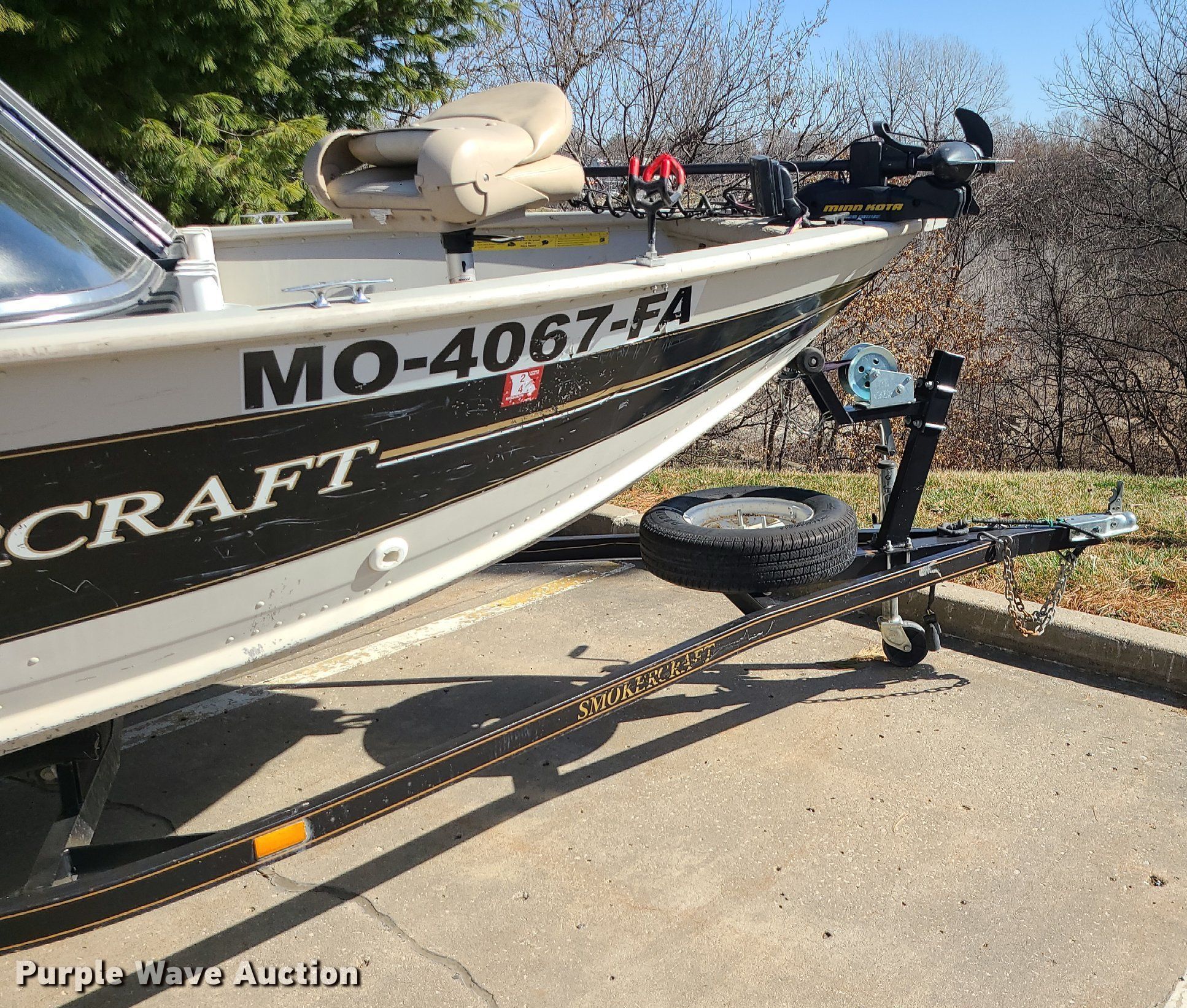 2003 Smokercraft Millenta 162 boat. Length: 16', Hull ID: SMK477341203. Engine Engine type: Outboard, Yamaha F80tlra, Serial: 67GL308210, Fuel type: Gas, HP: 80. Operators station Capacity Person: 5, 750 lbs. Features Trolling motor: Minn Kota. Trailer 2003 JQ Tex, VIN: 45JA2BN1431002751, Overall length: 18', Overall width: 84", Ball hitch size: 2", Axles: Single, Tire size: ST175/80R13. Notes Trailer tongue bent. Boat: Missouri title. Motor: Missouri title. Trailer: Missouri title. Title distribution may be delayed up to 14 days from verification of funds. Commercial Waterproofing, Inc... 6330 Northwest Kelly Drive. Kansas City, MO 64152