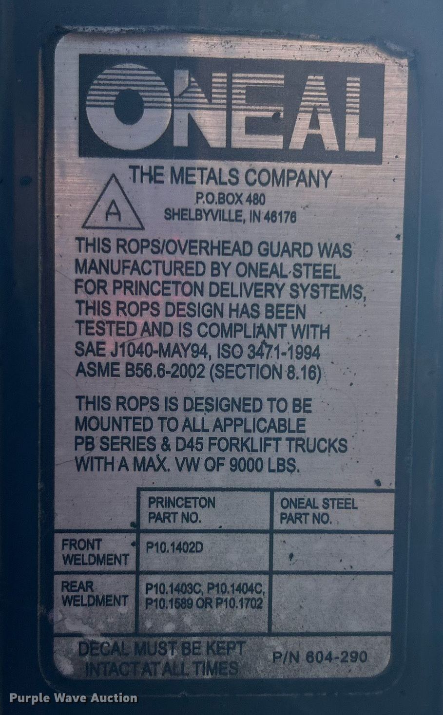 2009 Princeton PB50 forklift. Hours: 686 on meter, Serial: 140791509. Engine Caterplillar C2.2, Displacement: 2.216L, Cylinders: 4, Fuel type: Diesel. Transmission Hydrostatic. Operators station Canopy. Features Maximum lift capacity: 5,000 lbs, Maximum lift height: 144", Mast stages: 2, Side shift, Mast tilt, Fork length: 48". Tires Size: 31x15.5-15. 15107 North 137th East Avenue. Collinsville, OK 74021