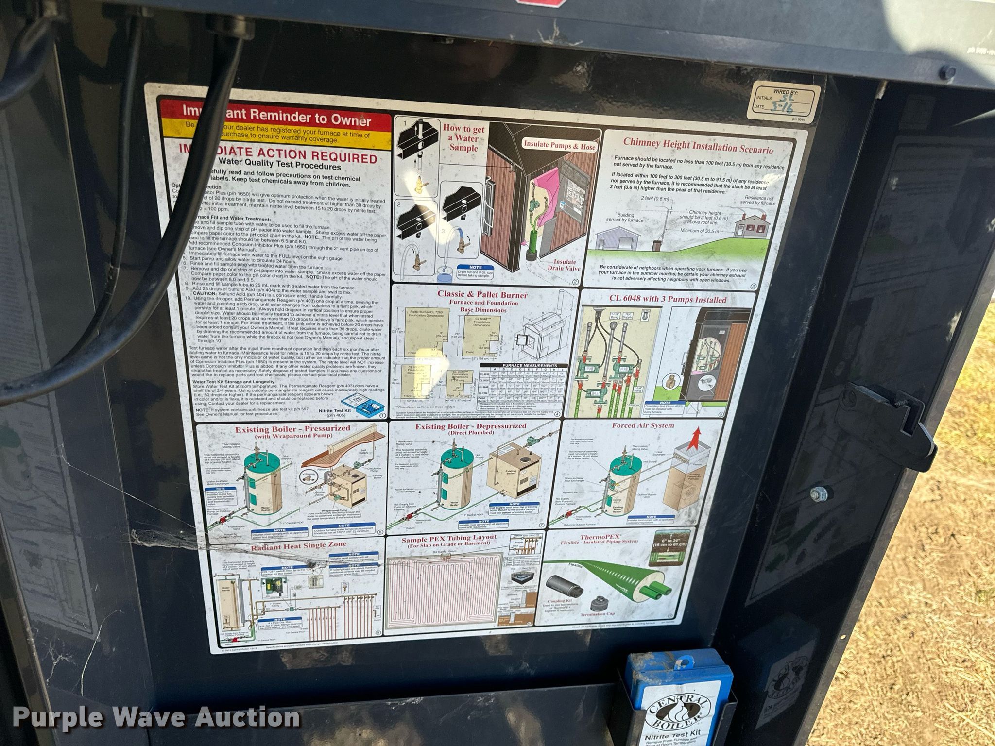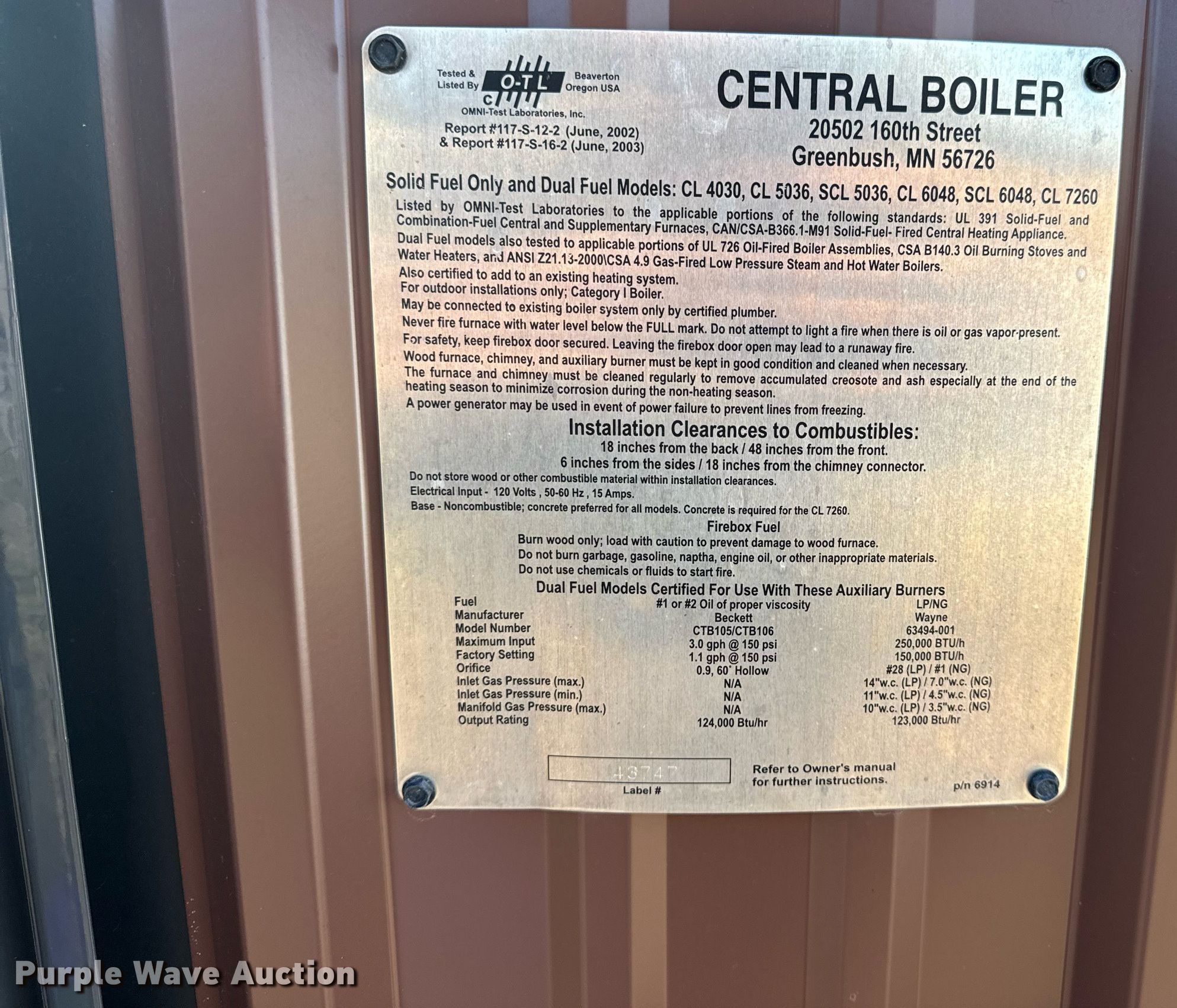 Purple Wave is selling a used Appliances in Missouri. This item is a 2007 Central Boiler Inc. CL5036 wood furnace with the following: Serial: 60065, Water Capacity: 196 gallons, Dual fuel, Gas burner included