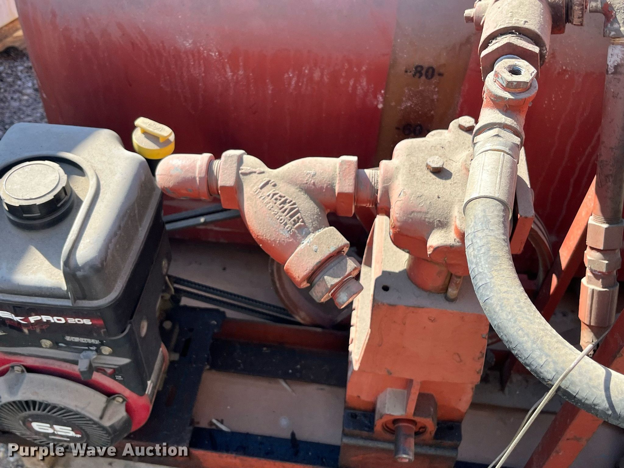 Turf sprayer. Hours: Unknown. Dimensions 46" x 49". Engine Briggs and Stratton Intek Pro206, Cylinders: 1, Fuel type: Gas, HP: 6.5. Features Pump, Hose, Hose reel, Tank Steel, Capacity: 100 gallons, Skid mounted. Notes Unknown operating condition. 3509 Loddick Lane. Fort Worth, TX 76244