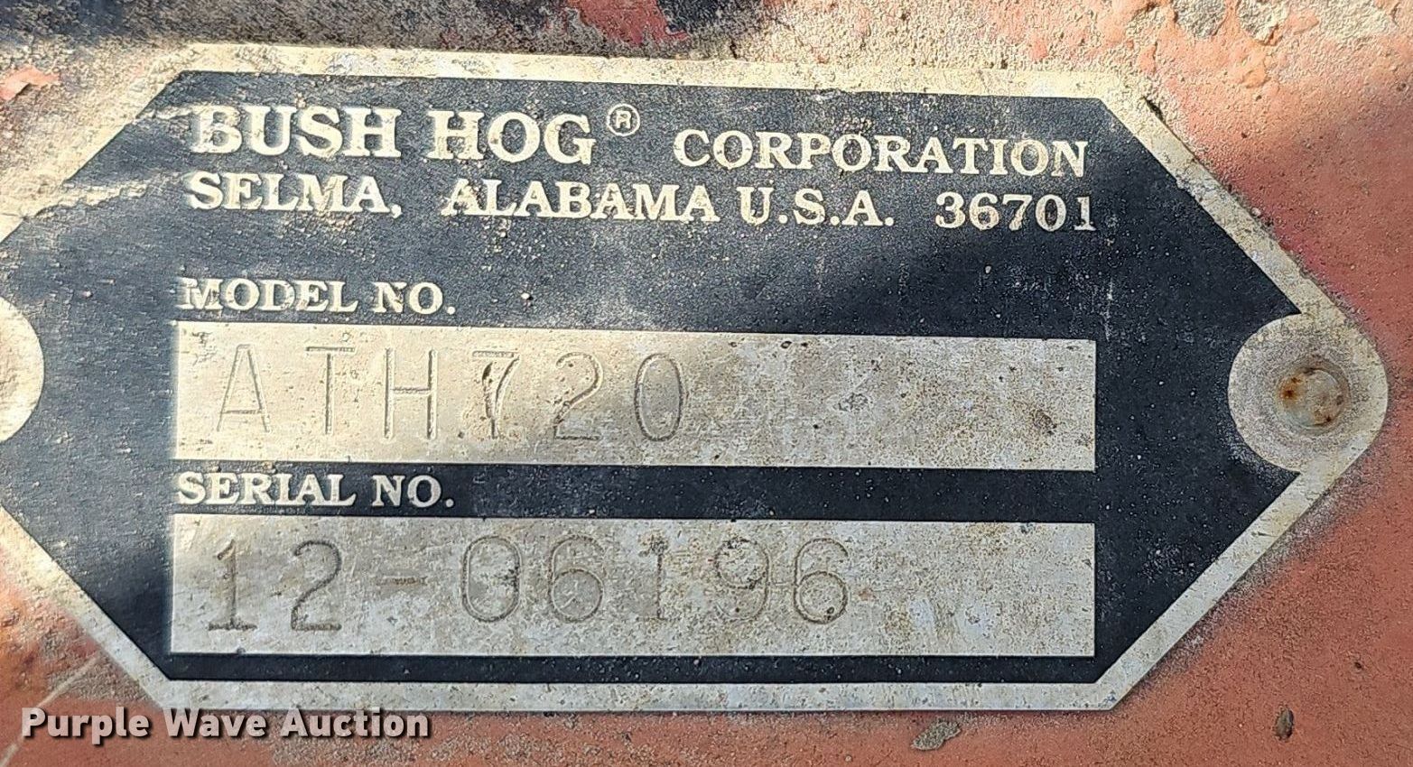 Purple Wave is selling a used Mower, Cutter, Shredder in Kansas. This item is a Bush Hog ATH720 finish mower with the following: Serial: 12- 06196