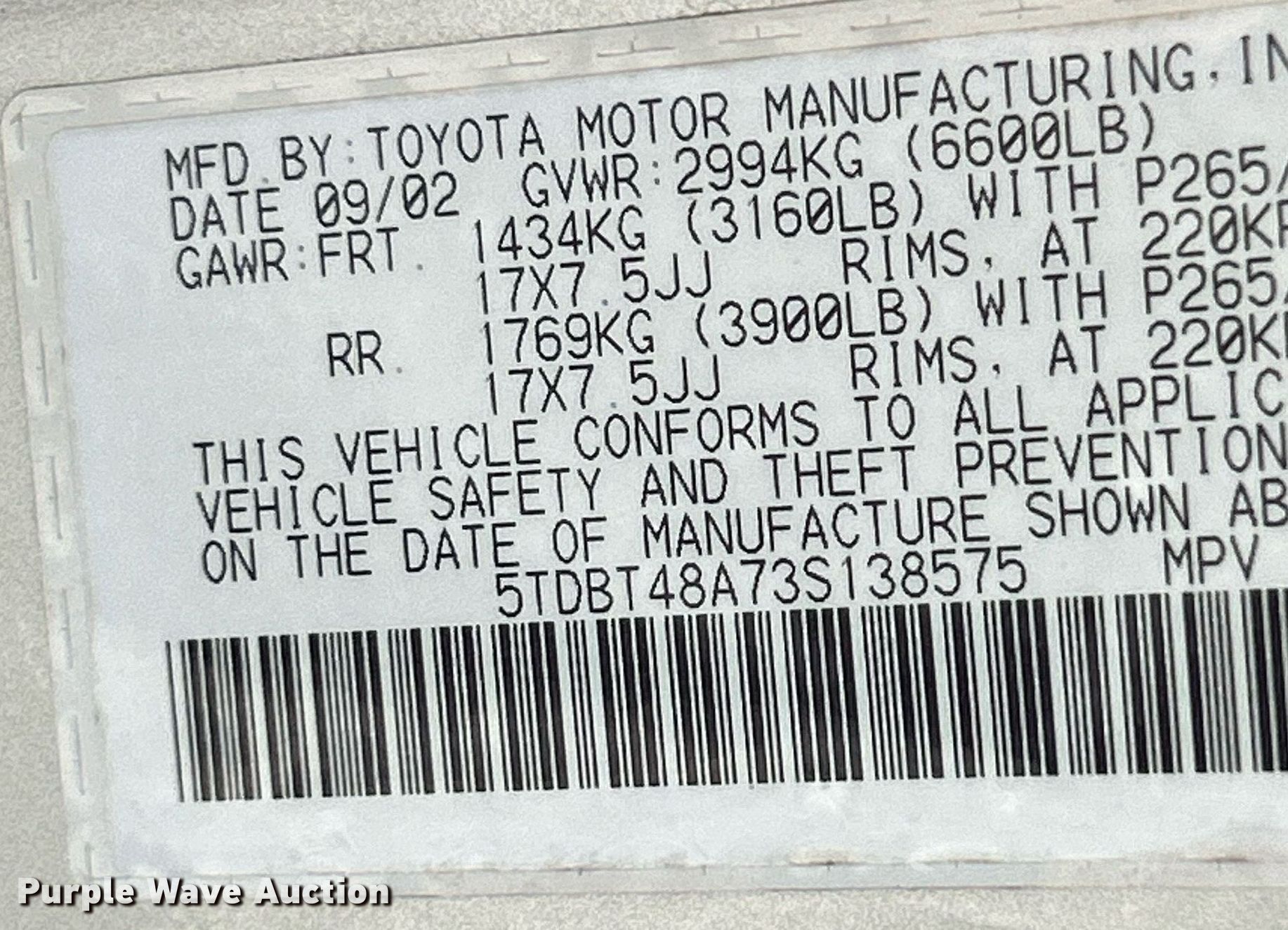 • VIN: 5TDBT48A73S138575