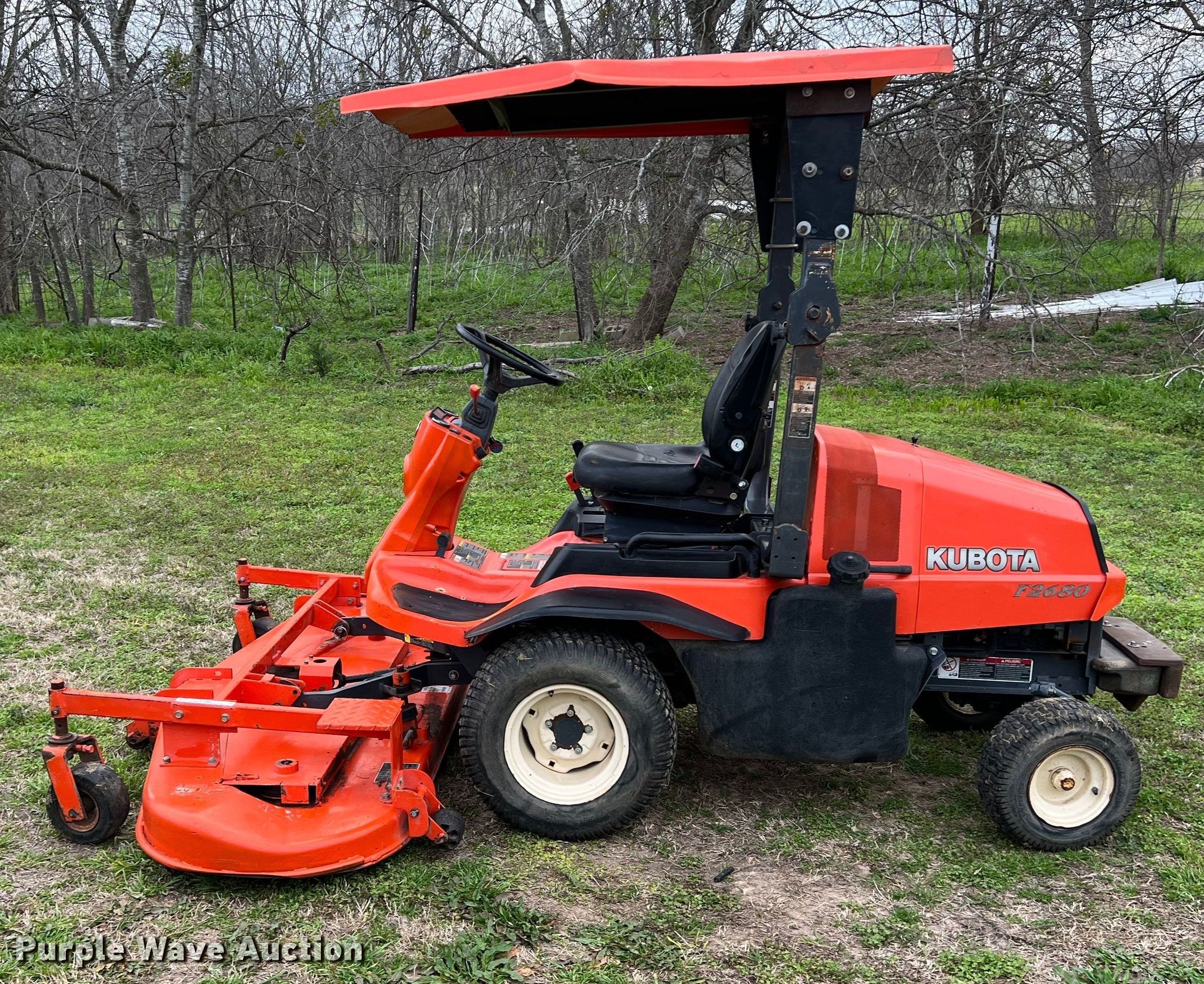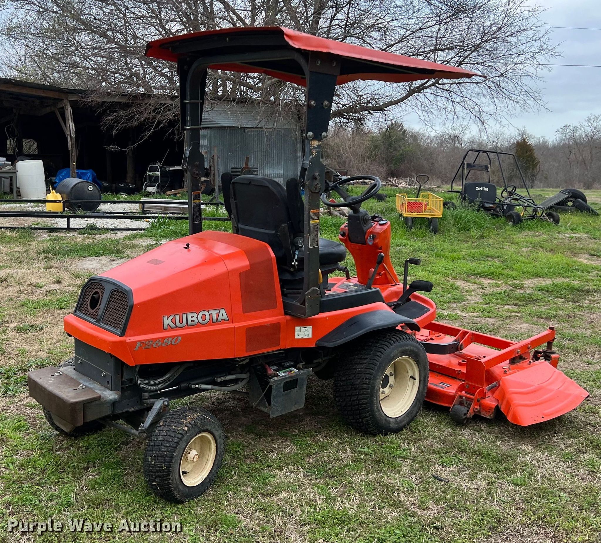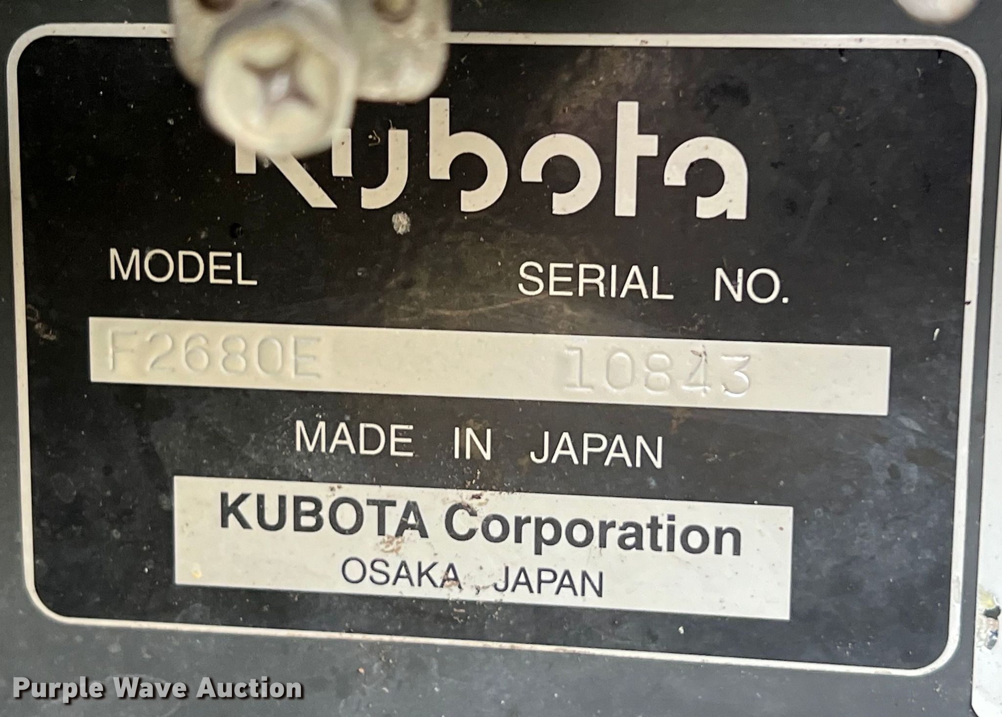 Purple Wave is selling a used Commercial Turf Mower in Texas. This item is a Kubota F2680E lawn mower with the following: Hours: 2,445 on meter, Cutting width: 72", Serial: 10843