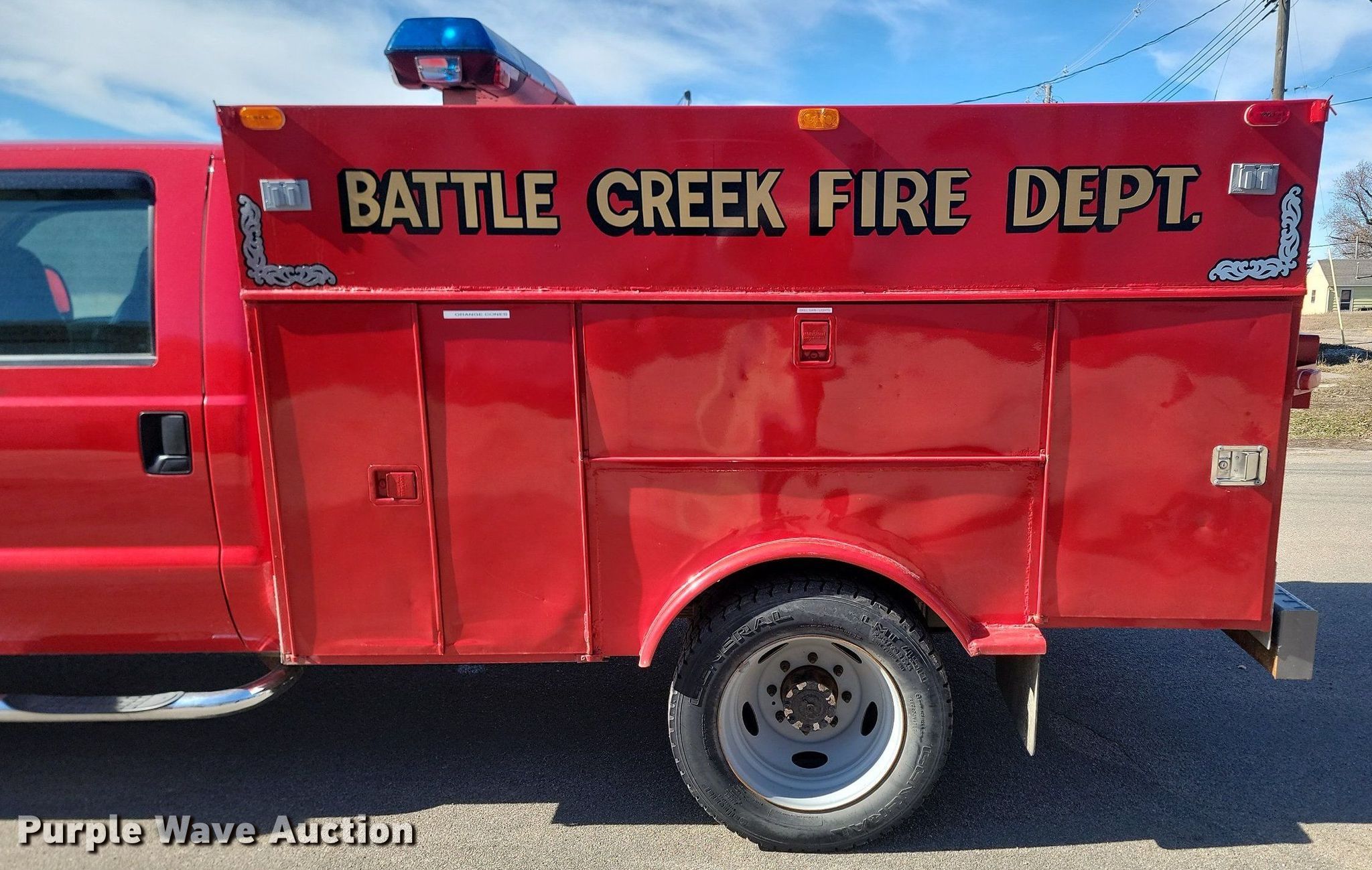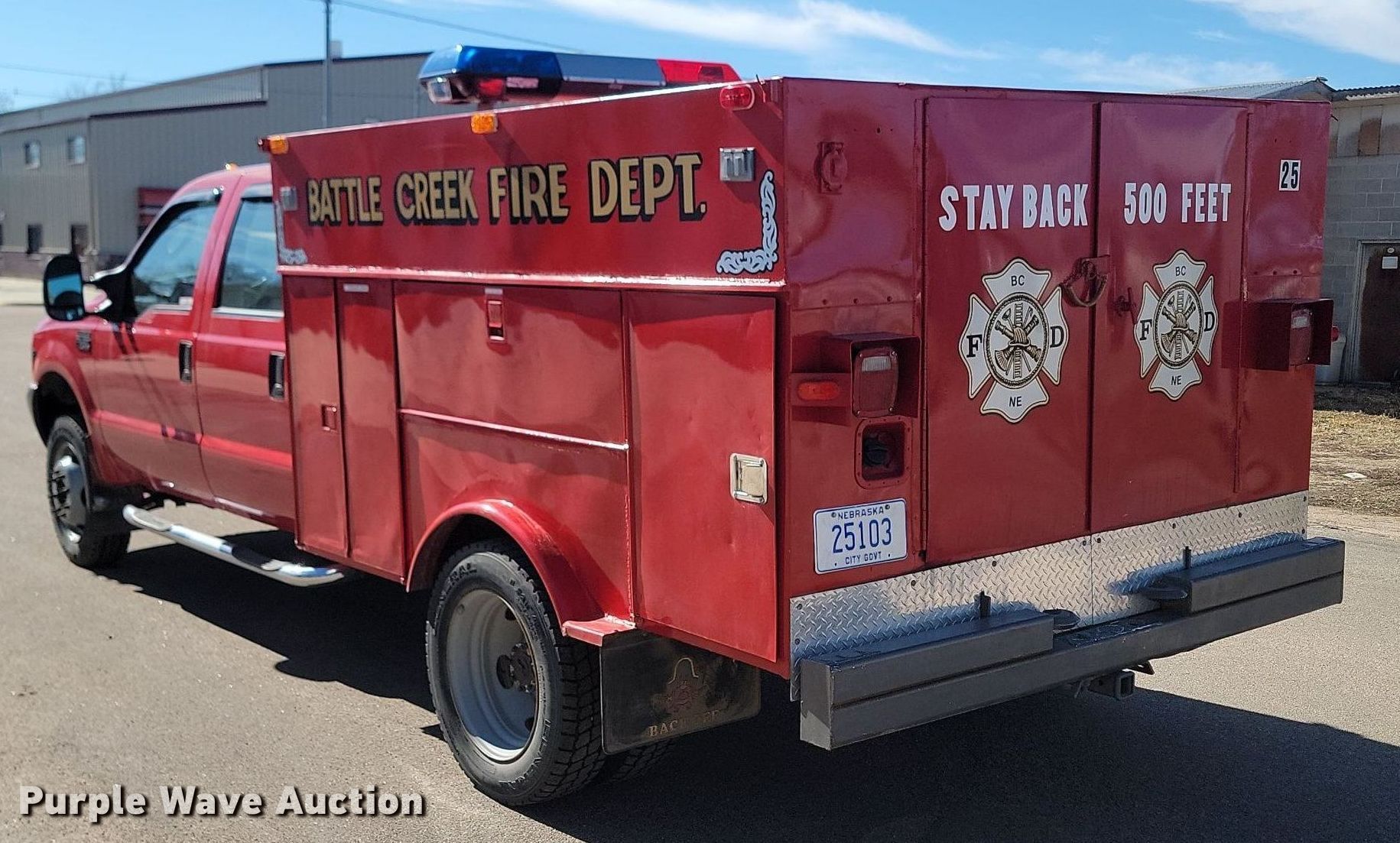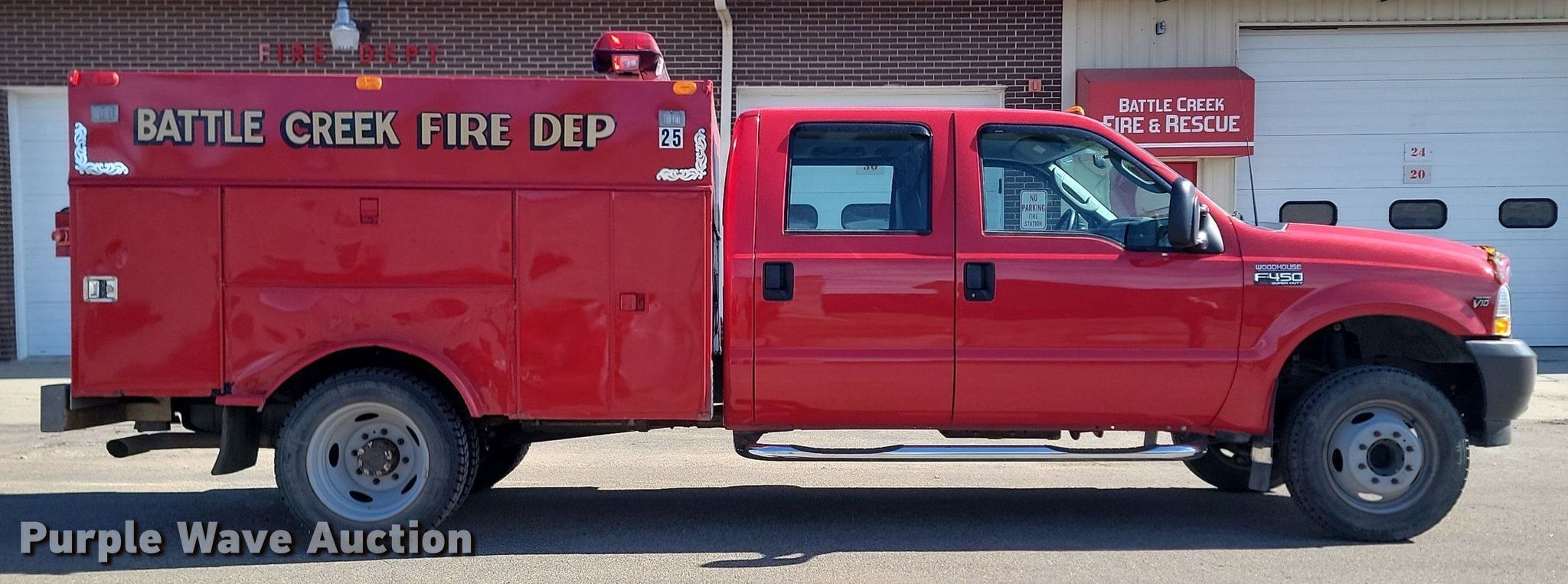 2003 Ford F450 Crew Cab utility / service truck. Miles: 6,977 on odometer, VIN: 1FDXW46S33ED82301. Engine Ford, Displacement: 6.8L V10 SOHC, Cylinders: 10, Fuel type: Gas. Transmission Automatic. Chassis Axles: Single, Suspension: Spring, Brakes: Hydraulic. Interior AC, Heat. Features Bed 9' L x 88" W. Tires Size: 225/70R19.5. Title distribution may be delayed up to 14 days from verification of funds. City of Battle Creek, NE. 102 South 2nd Street. Battle Creek, NE 68715