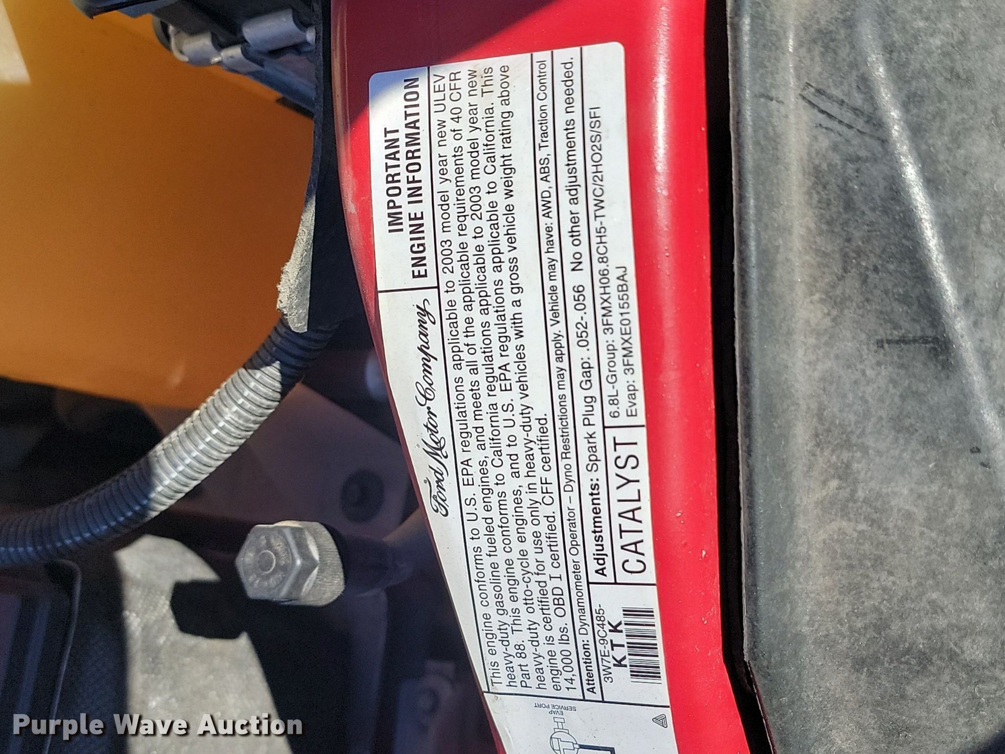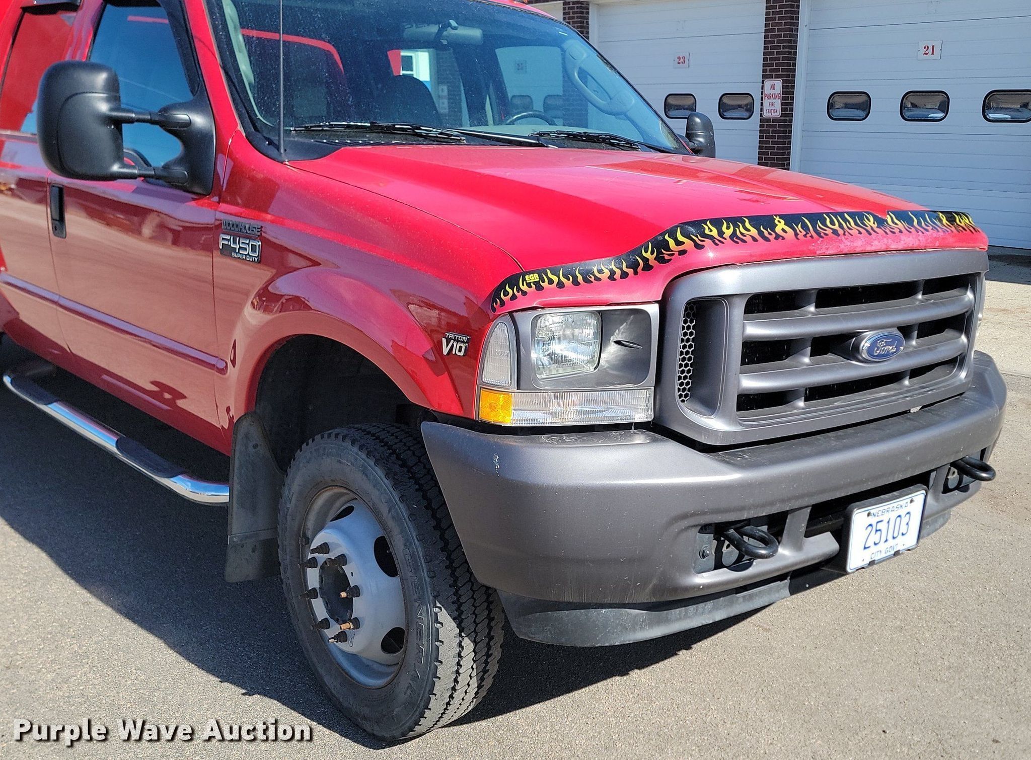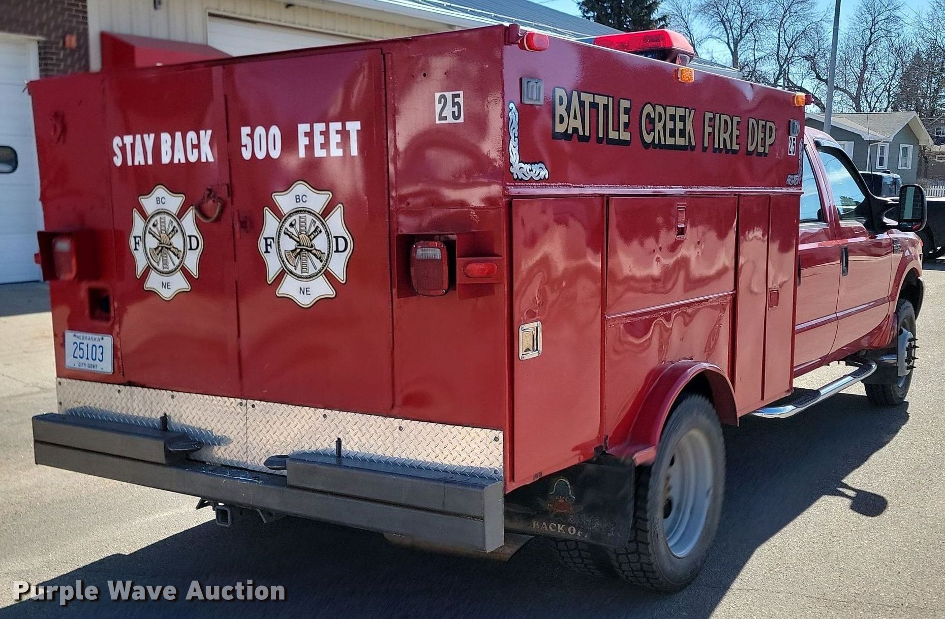 2003 Ford F450 Crew Cab utility / service truck. Miles: 6,977 on odometer, VIN: 1FDXW46S33ED82301. Engine Ford, Displacement: 6.8L V10 SOHC, Cylinders: 10, Fuel type: Gas. Transmission Automatic. Chassis Axles: Single, Suspension: Spring, Brakes: Hydraulic. Interior AC, Heat. Features Bed 9' L x 88" W. Tires Size: 225/70R19.5. Title distribution may be delayed up to 14 days from verification of funds. City of Battle Creek, NE. 102 South 2nd Street. Battle Creek, NE 68715