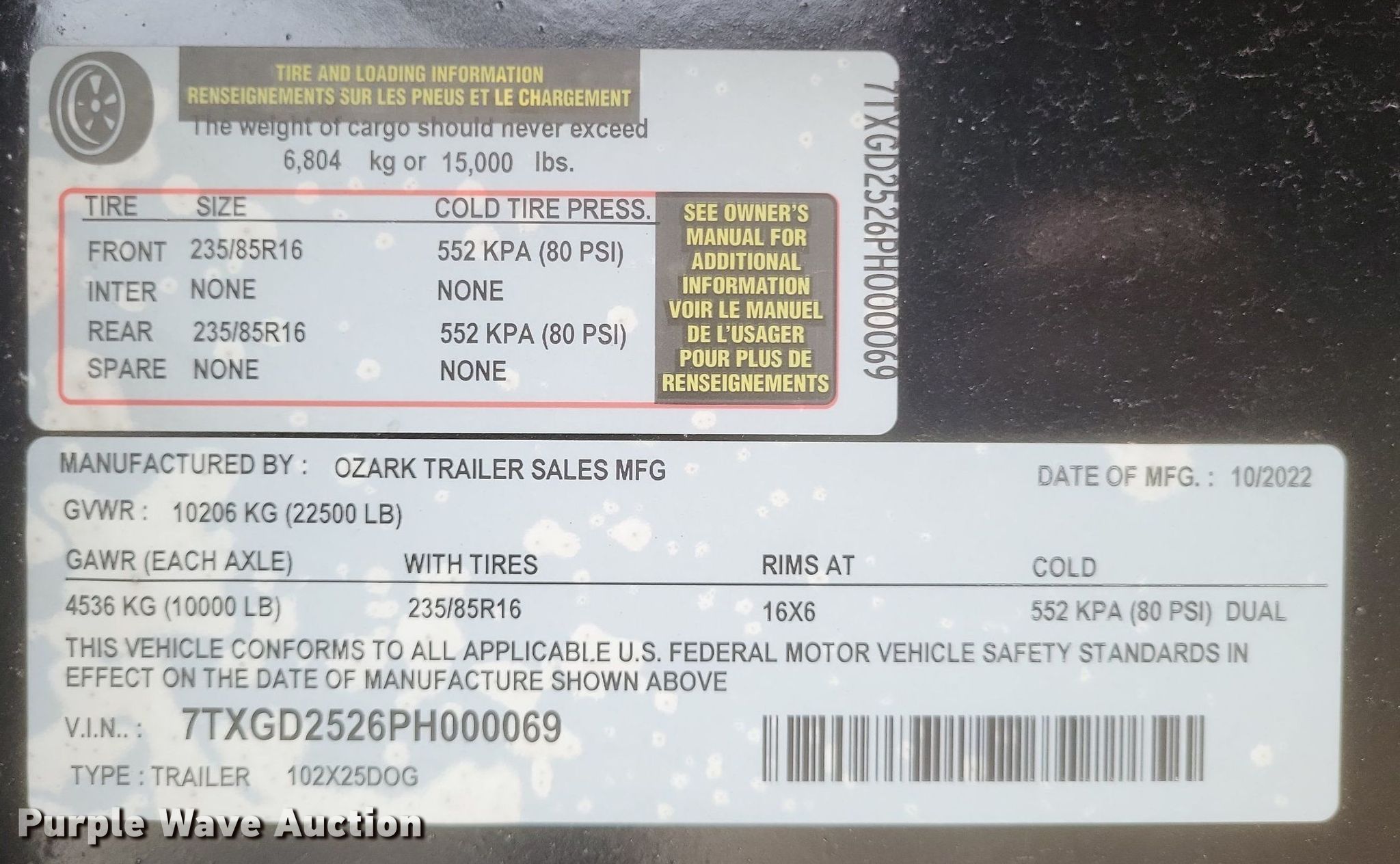 Purple Wave is selling a used Equip. Trailer in Arkansas. This item is a 2023 Ozark 102X25DOG equipment trailer with the following: VIN: 7TXGD2526PH000069