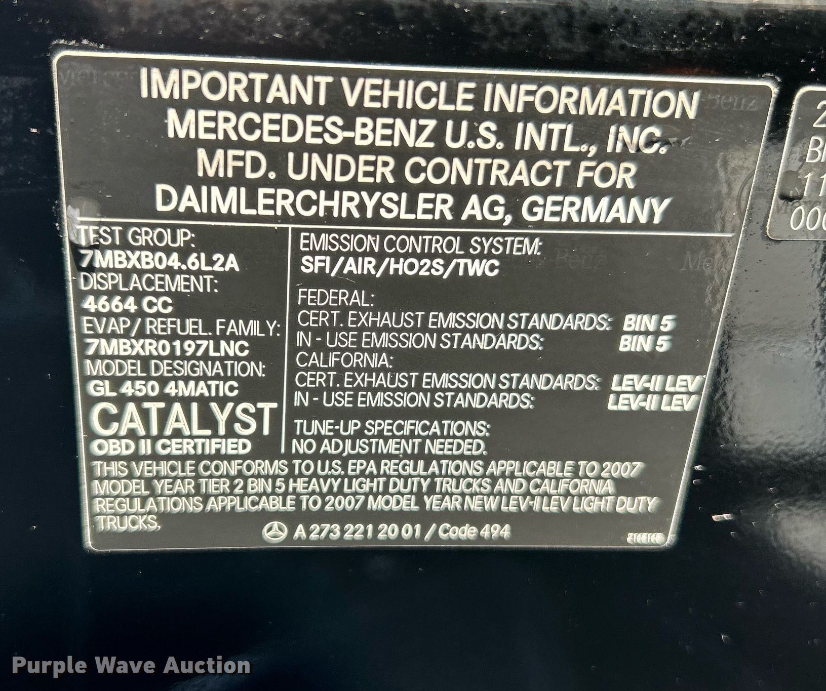 Purple Wave is selling a used Passenger Vehicle in Missouri. This item is a 2007 Mercedes Benz GL450 SUV with the following: Miles: 198,470 on odometer, VIN: 4JGBF71E07A162205