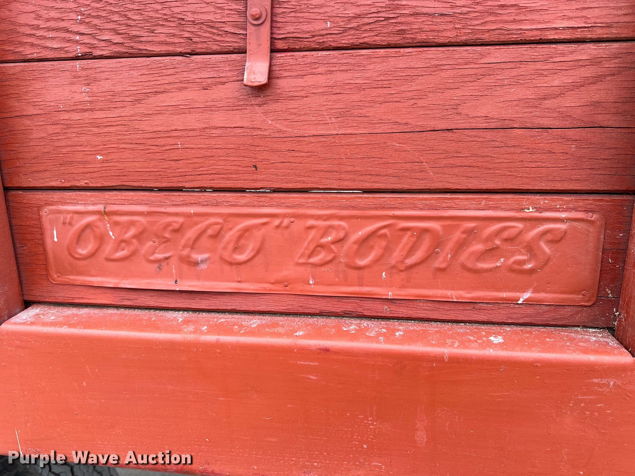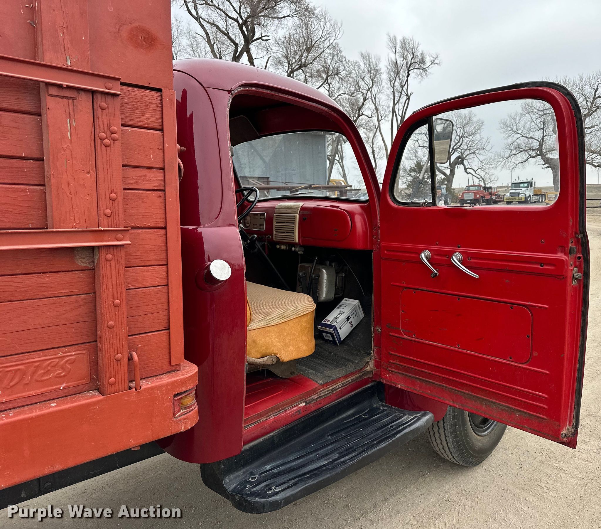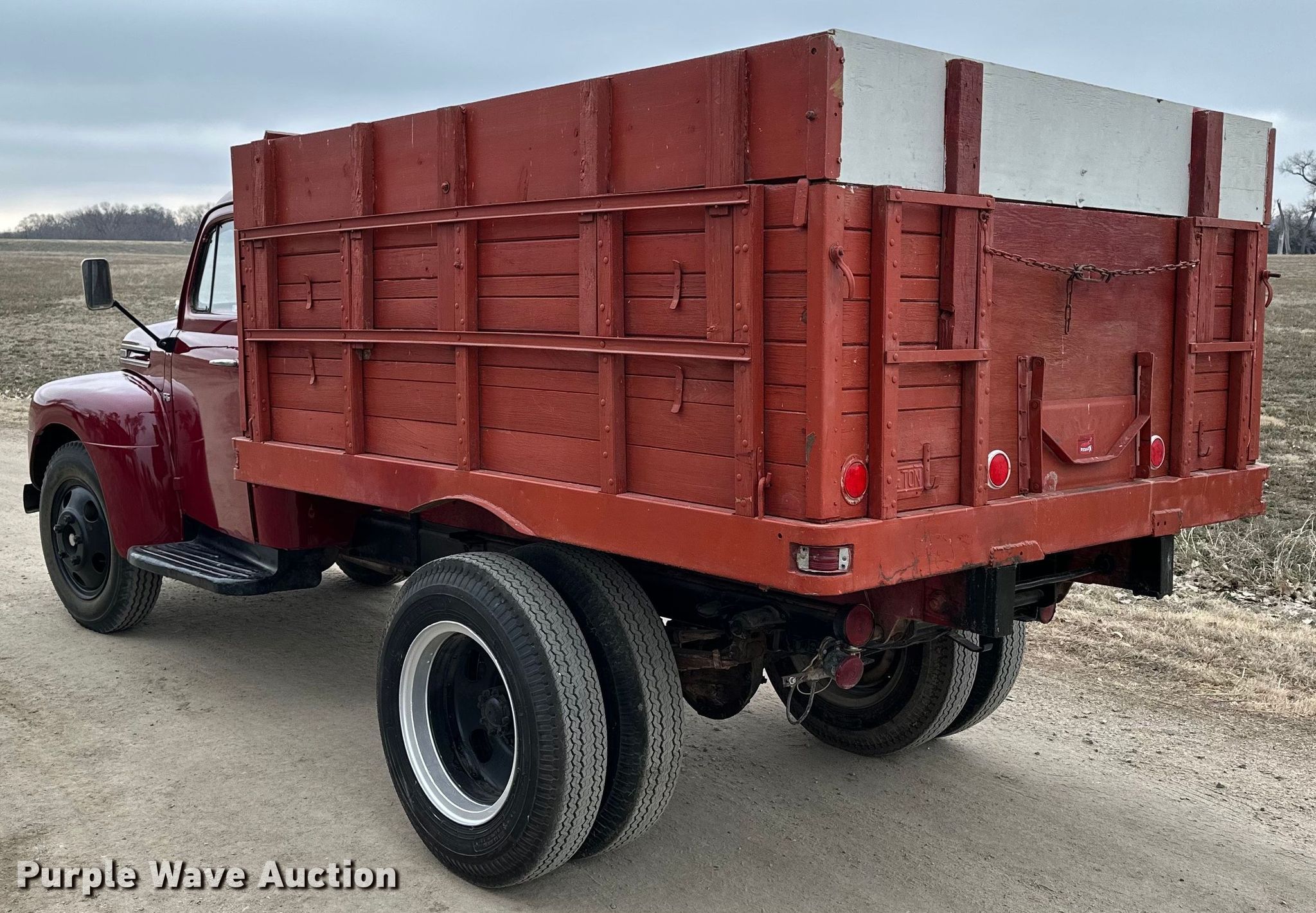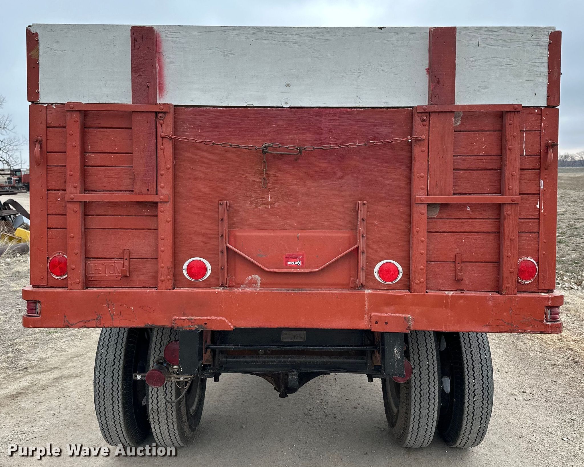 1948 Ford F-5 grain truck. Miles: 49,213 on odometer, VIN: 102556. Engine Ford, Serial: 88RT19985, Cylinders: 8, Fuel type: Gas. Transmission Manual, Speed: 3. Chassis Axles: Single, Suspension: Spring, Brakes: Hydraulic, PTO, GVWR: 14,000 lbs. Interior Heat. Features Dump bed Obeco Bodies, 8' L x 80" W, Side height: 28", Side board height: 12", Ram: Single, End gate: Manual. Tires Size: 7.50-20. Notes Non-operational brakes. Kansas antique title. Title distribution may be delayed up to 14 days from verification of funds. Ogallah, KS 67656
