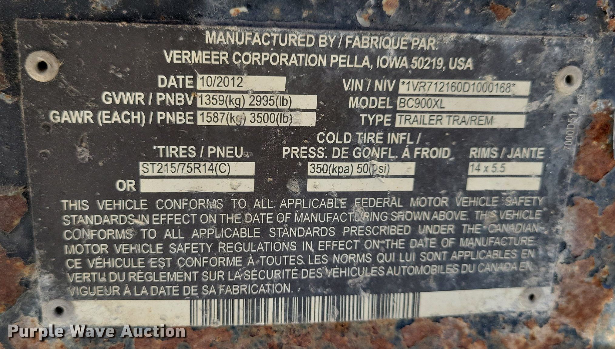 2013 Vermeer BC900XL wood chipper. Hours: 1,831 on meter, Serial: 1VR712160D1000168. Engine Kohler, Serial: 4624205671, Displacement: 999cc, Cylinders: 2, Fuel type: Gas. Features Throat opening: 15" W x 14" H. Tires Size: ST215/75R14. Transfer of ownership documentation will be a bill of sale. Vermeer Iowa & N Missouri. 6678 NE 14th St. Des Moines, IA 50313