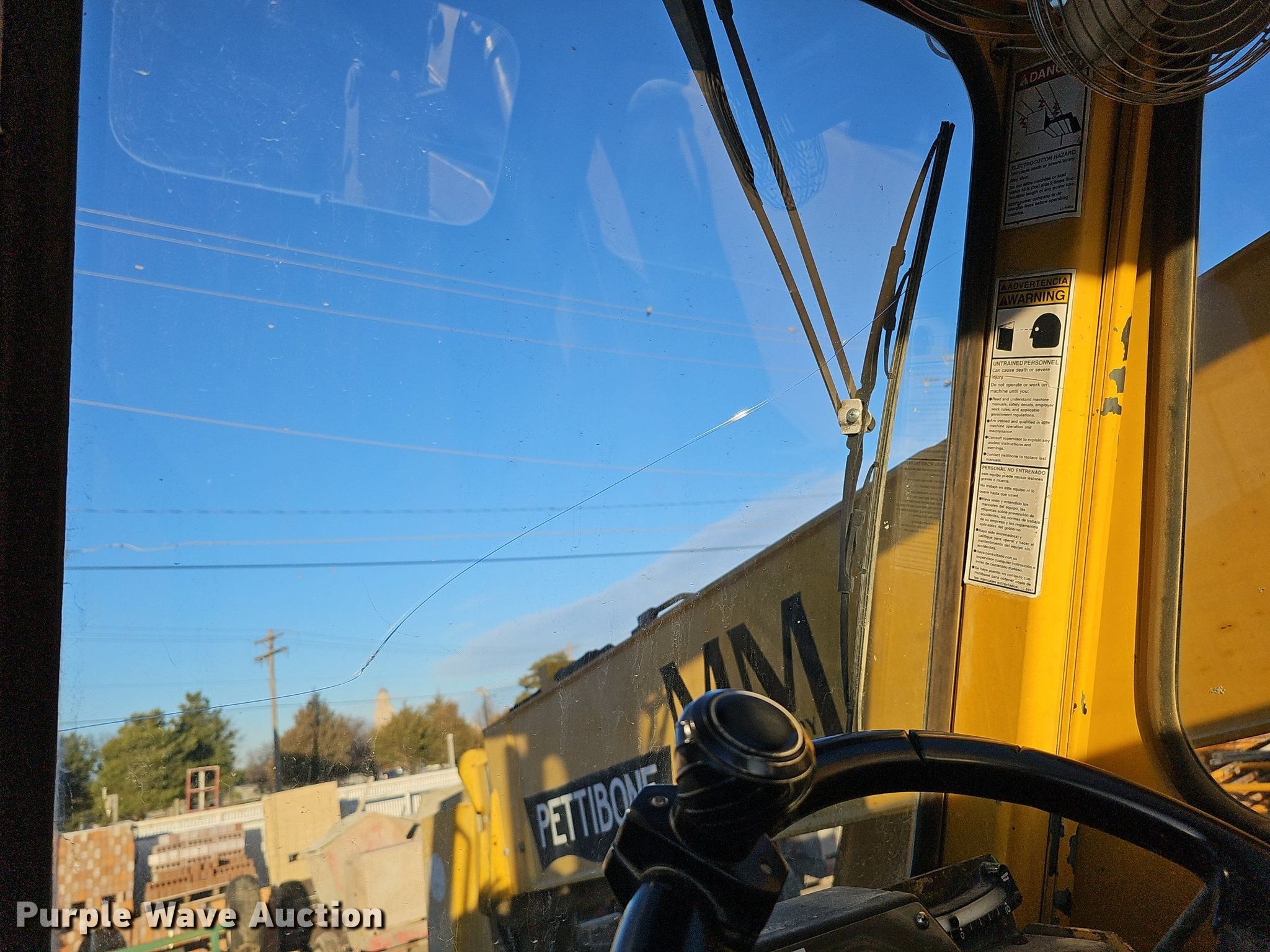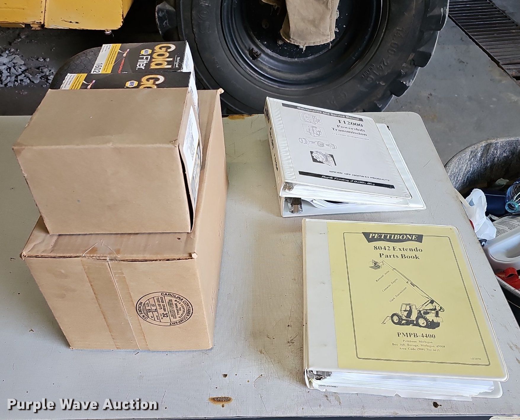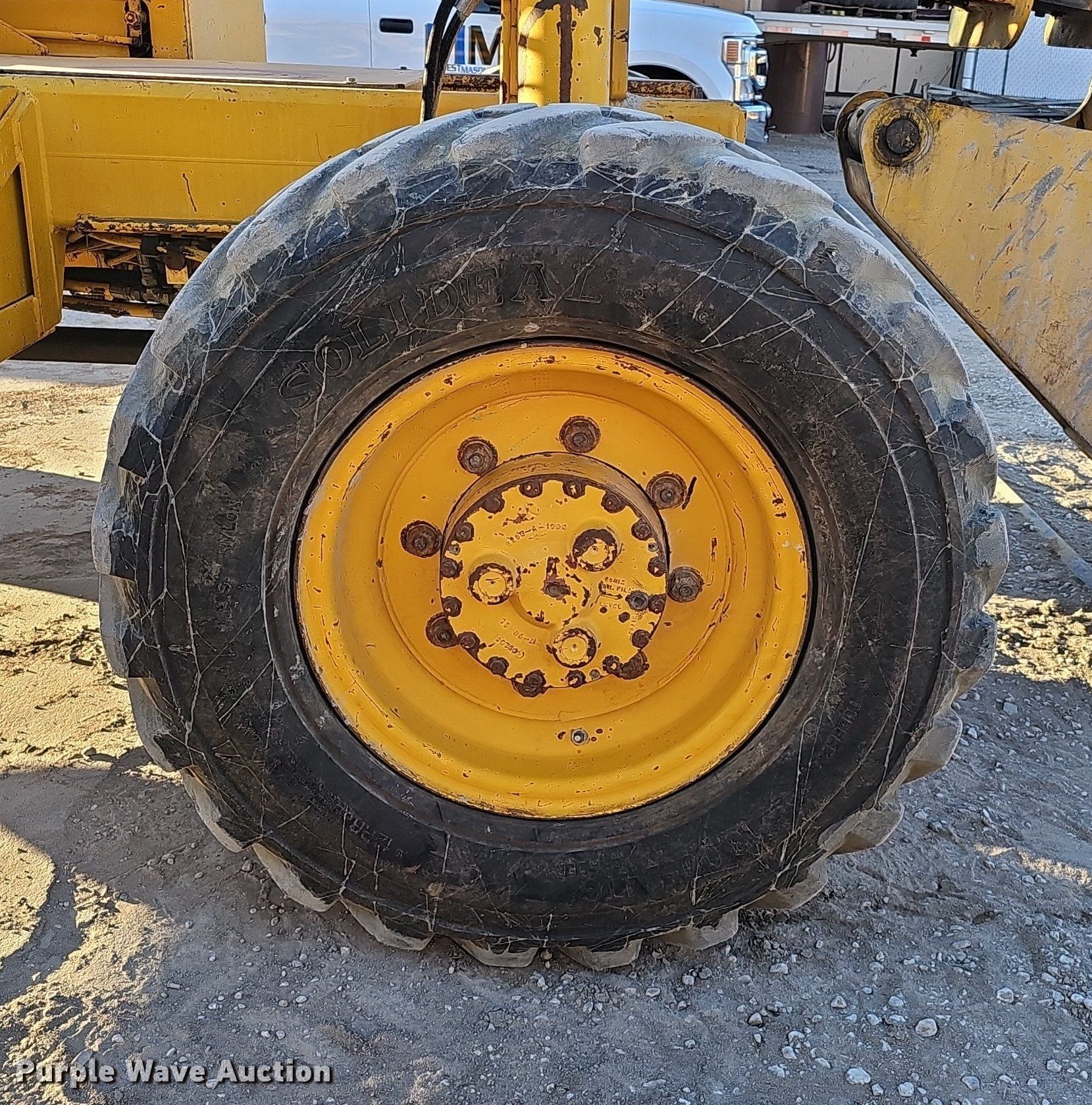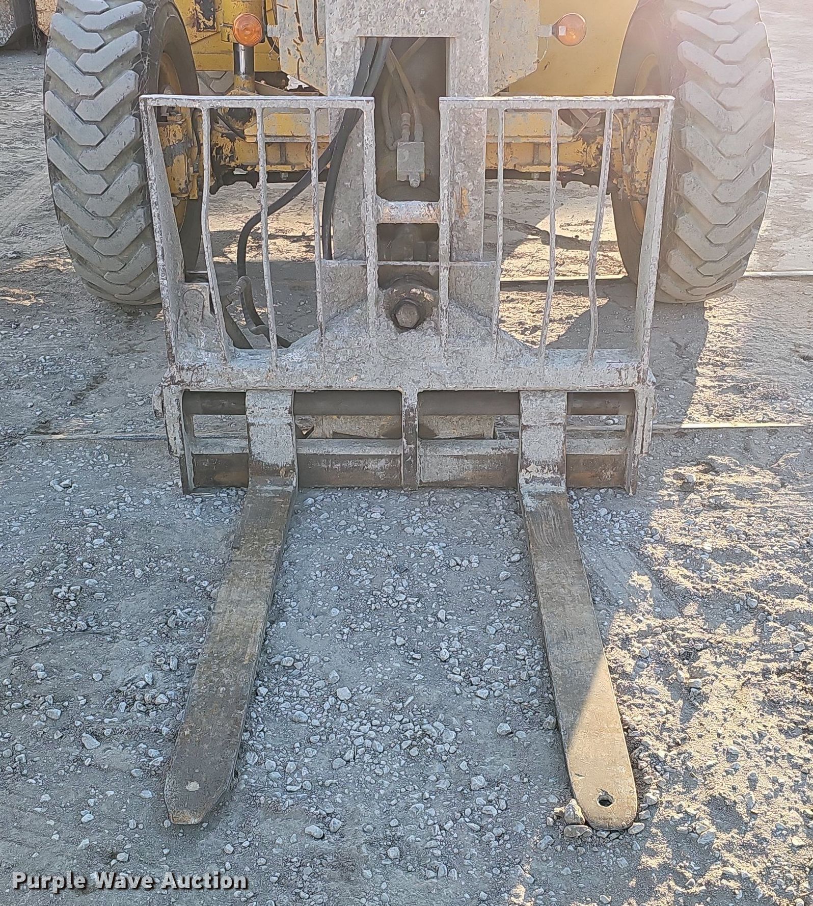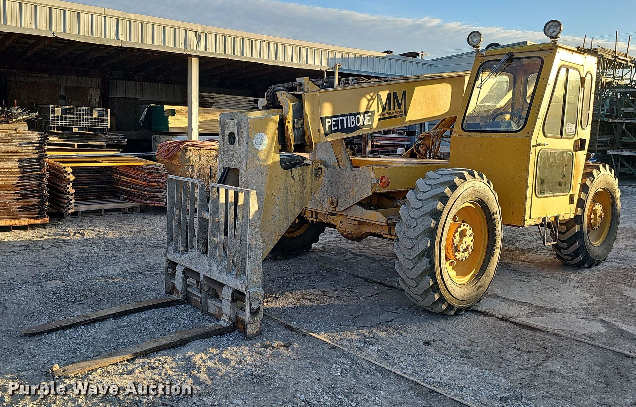 1995 Pettibone 8042 telehandler. Hours: 3,688 on meter, Serial: 7-143. Engine Cummins 4BT, Serial: 3802327, Cylinders: 4, Fuel type: Diesel. Transmission Powershift, 3F - 3R, Four wheel drive. Operators station Enclosed cab, Heat, Steering: Crab, Four wheel. Features Maximum lift capacity: 8,000 lbs, Maximum lift height: 42', Boom stages: 3, Fork length: 47.5", Tilt carriage. Tires Front: 13.00-24TG, Foam filled. Notes Glass cracked. Midwest Masonry Inc.. 912 S 26th St.. Lincoln, NE 68510