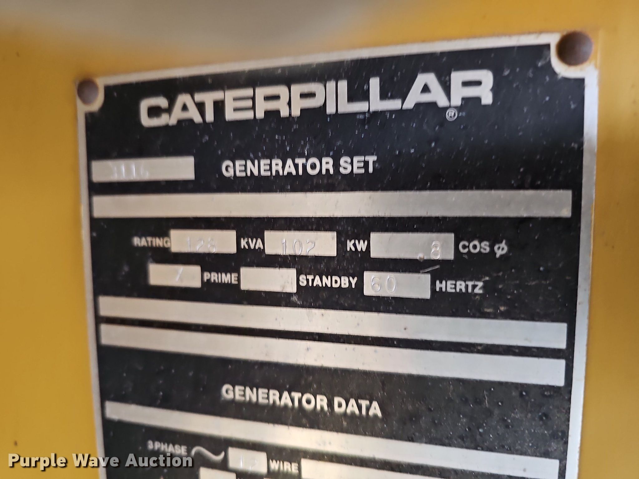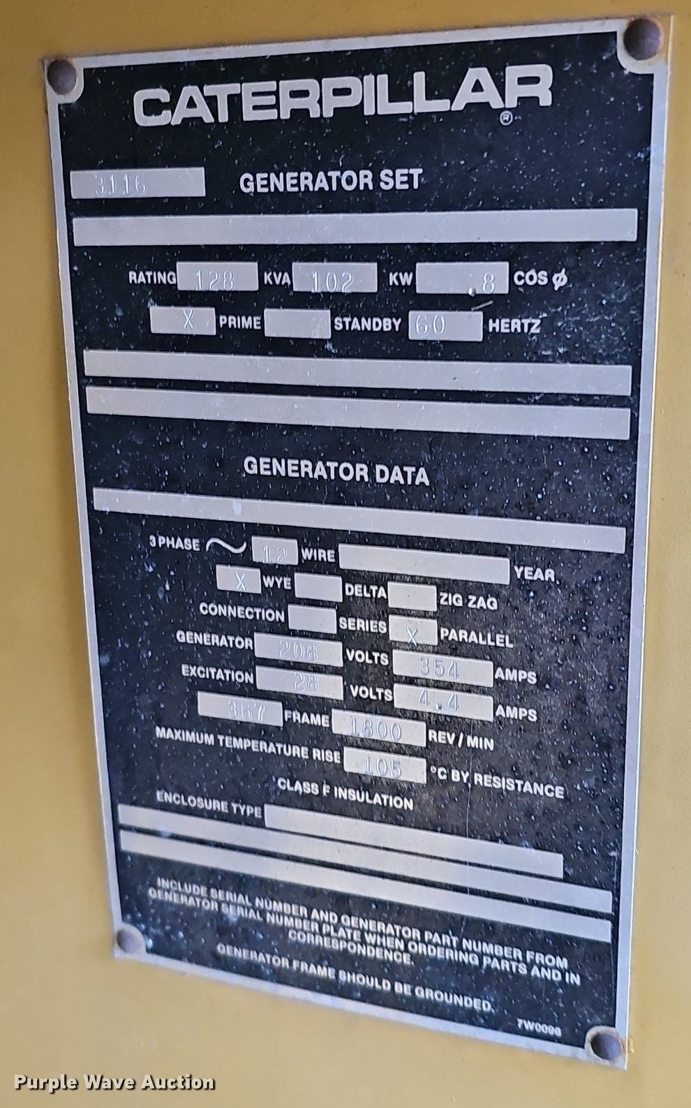Caterpillar 125 generator. Hours: Unknown, Dimensions: 140" L x 70" W x 76" H. Engine Caterpillar 3116, Serial: 1NJ00539, Cylinders: 6, Fuel type: Diesel. Features Generator Caterpillar 3116, kVA: 128, kW: 102, Phase: Three, Electric start, Fuel tank. Notes Unknown operating condition. Van Kirk Bros. Contracting. 31940 Road Y. Sutton, NE 68979