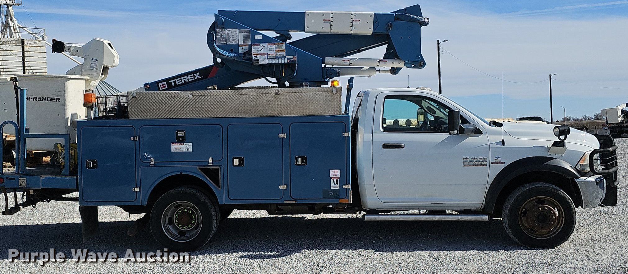 2015 Dodge Ram 5500HD bucket truck. Miles: 176,282 on odometer, VIN: 3C7WRNBL2FG632770, Unit #: 08-15. Engine Displacement: 6.7L L6 OHV, Cylinders: 6, Fuel type: Diesel. Transmission Automatic. Chassis Four wheel drive, Axles: Single, Suspension: Spring, Brakes: Hydraulic, PTO, GVWR: 19,500 lbs, Wheelbase: 172". Interior AC, Heat, Heated mirrors, Power windows, Power locks, Cruise control, Auxiliary controls, Backup camera. Features Bed Brandex 14, Serial: 51329, 11' L x 94" W, Boom 2015 Terex Hi Ranger LTM40, Serial: 2150855185, Mast height: 40', Maximum lift capacity: 400 lbs, Boom type: Articulating, Insulated, Telescopic, Man basket, Boom controls Ground, Platform/ basket, Material handler, Certification valid through: 04/20/24. Tires Size: 225/70R19.5. Notes Windshield chipped or cracked. Nebraska title. Title distribution may be delayed up to 14 days from verification of funds. Norris Public Power District. Beatrice, NE 68310