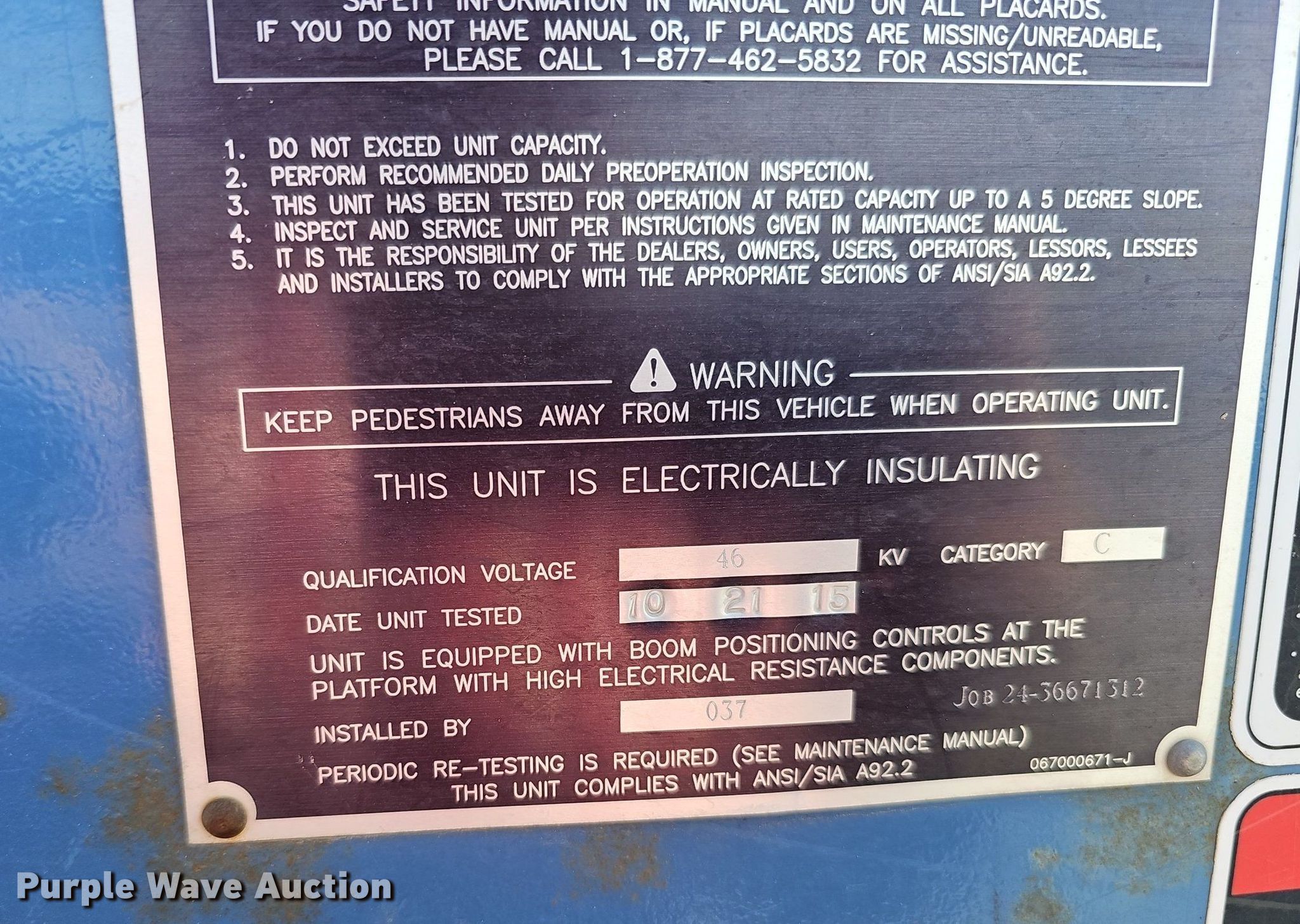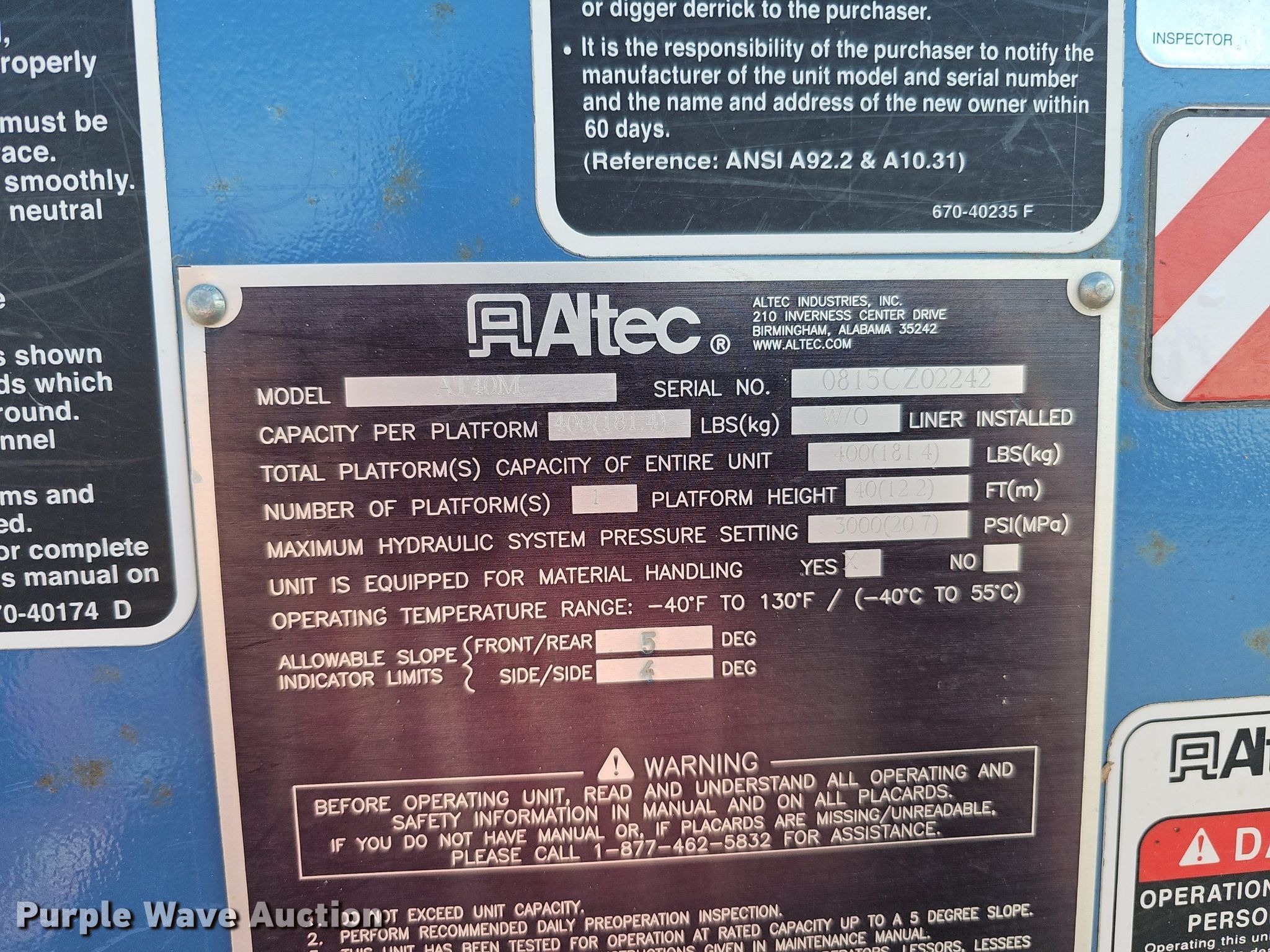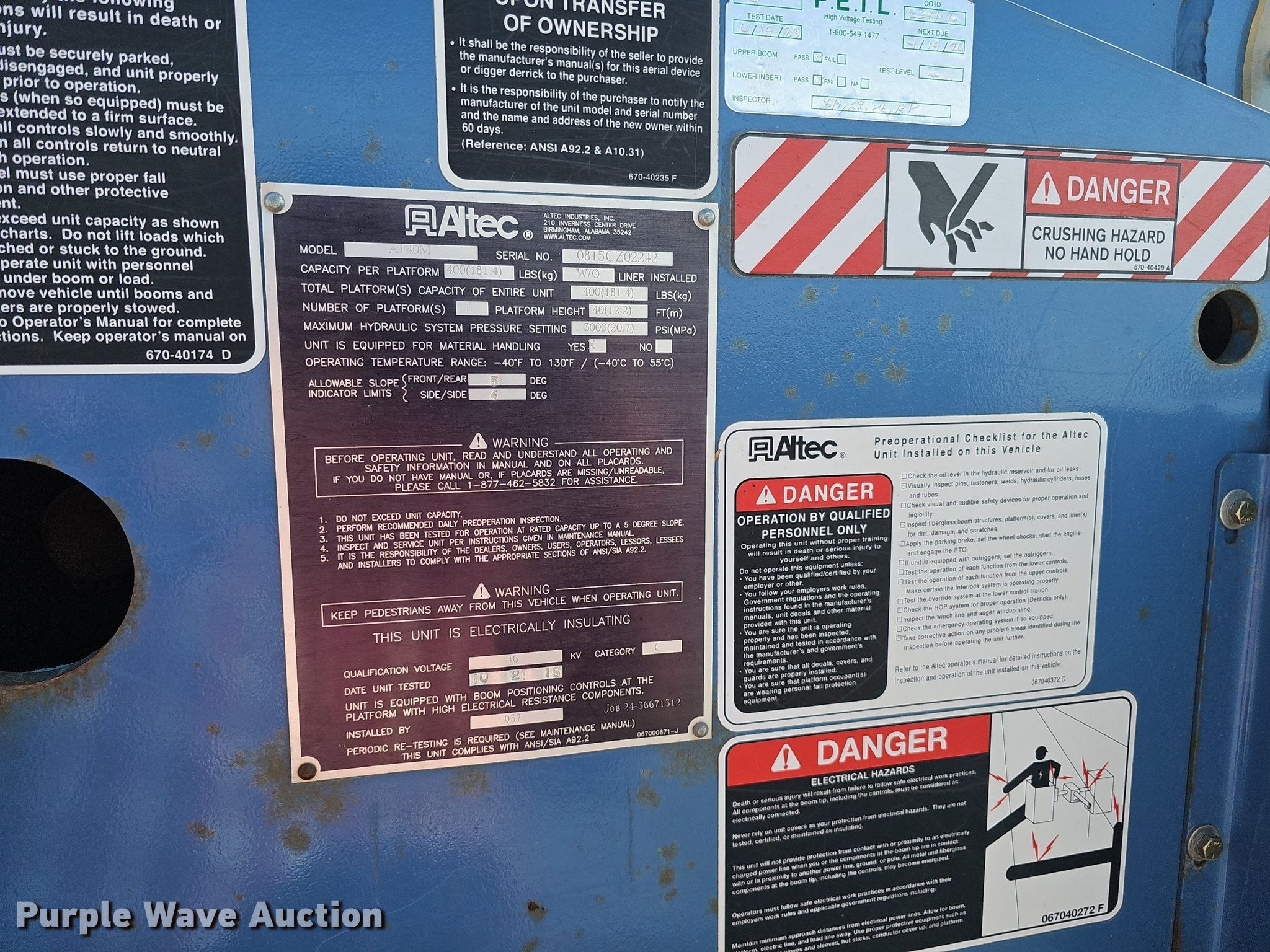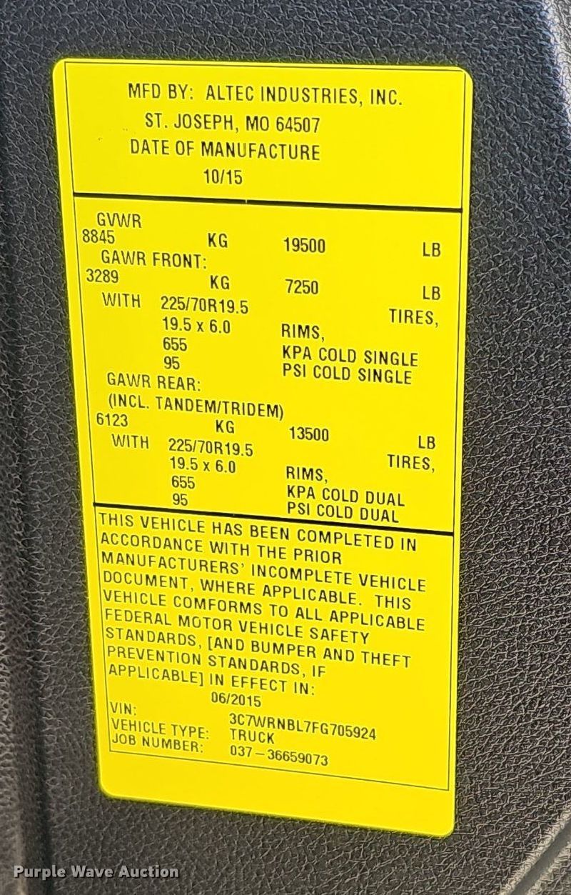2015 Dodge Ram 5500HD bucket truck. Miles: 192,907 on odometer, VIN: 3C7WRNBL7FG705924, Unit #: 04-15. Engine Displacement: 6.7L L6 OHV, Cylinders: 6, Fuel type: Diesel. Transmission Automatic. Chassis Four wheel drive, Axles: Single, Suspension: Spring, Brakes: Hydraulic, PTO, GVWR: 19,500 lbs, Wheelbase: 170". Interior AC, Heat, Heated mirrors, Power windows, Power locks, Cruise control, Auxiliary controls, Backup camera. Features Bed Altec, Serial: 12386-15, 10' 6" L x 94" W, Boom Altec AT40M, Serial: 0815CZ02242, Mast height: 40', Maximum lift capacity: 400 lbs, Boom type: Articulating, Insulated, Telescopic, Man basket, Boom controls Ground, Platform/ basket, Material handler, Certification valid through: 04/19/24. Tires Size: 225/70R19.5. Notes Oil leak, Coolant leak. Nebraska title. Title distribution may be delayed up to 14 days from verification of funds. Norris Public Power District. Beatrice, NE 68310