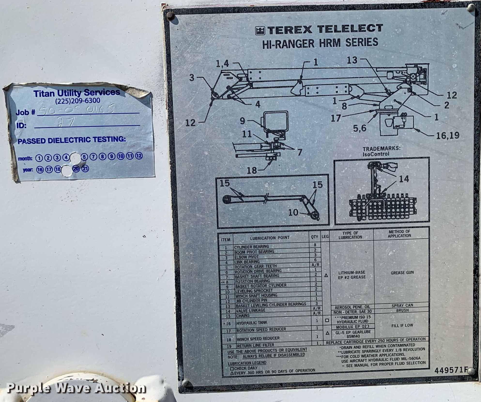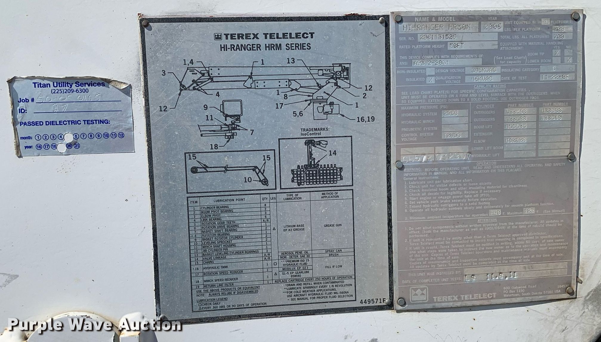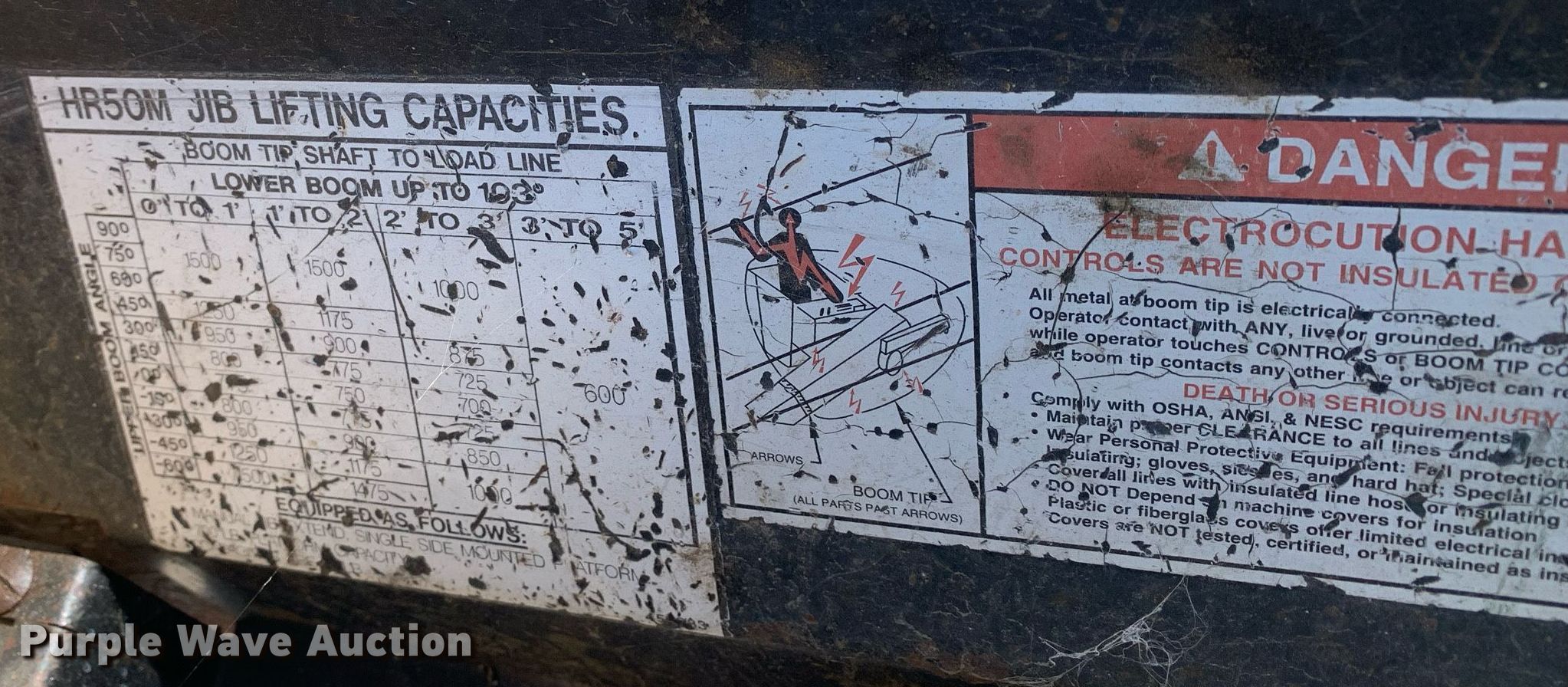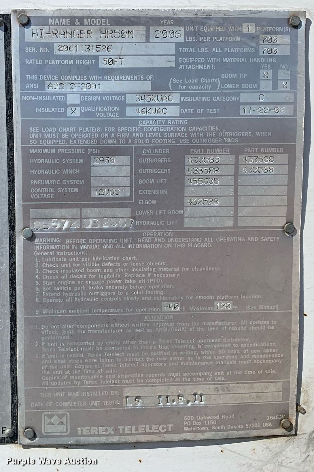 2007 Ford F750 Super Duty bucket truck. Miles: 121,193 on odometer, VIN: 3FRXF75B47V459004. Engine Cummins ISB, Cylinders: 6, Fuel type: Diesel. Transmission Manual, Speed: 7. Chassis Four wheel drive, Axles: Single, Suspension: Spring, Brakes: Air, PTO, GVWR: 33,000 lbs, Wheelbase: 182". Interior AC, Heat, Cruise control, Brake controller. Features Bed 13' 4" L x 7' W x 10" W, Boom 2006 Terex HR50M, Serial: 2061131526, Boom length: 50', Mast height: 50', Maximum lift capacity: 700 lbs, Boom type: Articulating, Insulated, Man basket, Boom controls Ground, Platform/ basket, Material handler. Tires Size: 11R22.5. Notes Non-operational four wheel drive Transfer case removed. Oklahoma title. Title distribution may be delayed up to 14 days from verification of funds. Choctaw Electric Co-Op. 1033 N 4250 Rd. Hugo, OK 74743