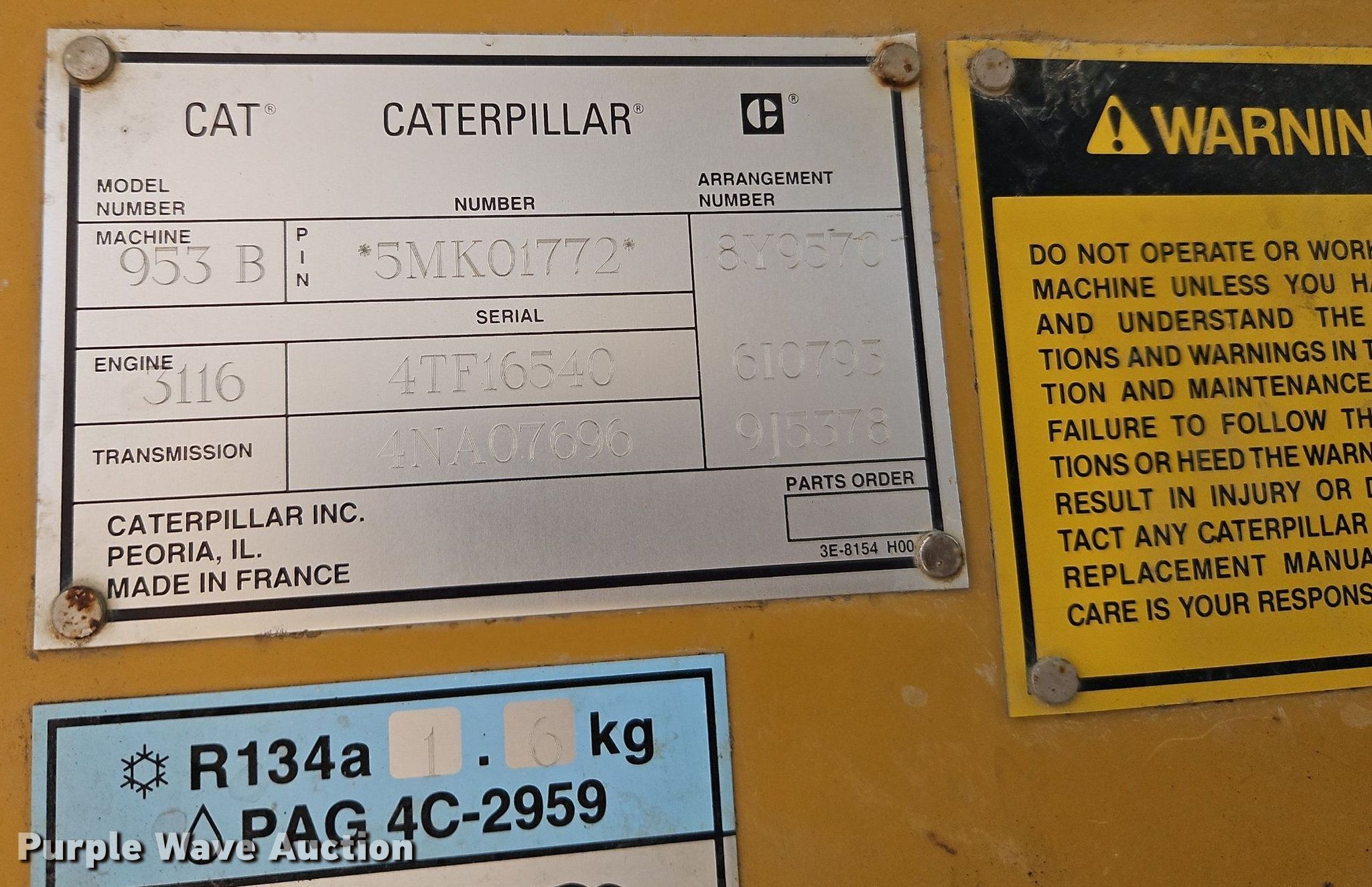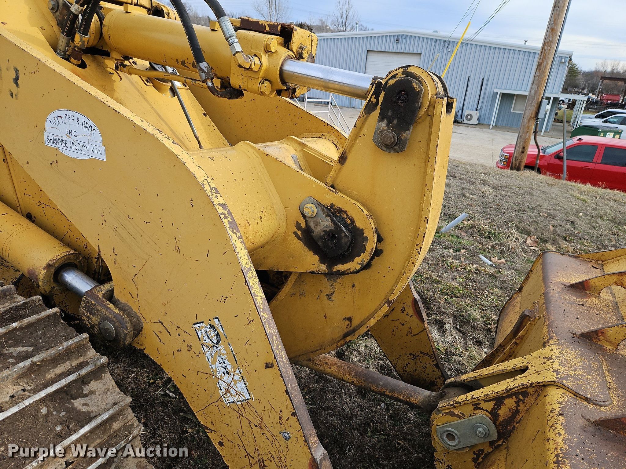 1994 Caterpillar 953B track loader. Hours: 18,452 on meter, Serial: 5MK01772. Engine Caterpillar 3116, Serial: 4TF16540, Cylinders: 6, Fuel type: Diesel. Transmission Hydrostatic. Operators station Enclosed cab, AC, Heat, Bucket controls: Two-lever. Features Bucket Width: 96", Self- leveling bucket, Cutting edge: Bolt-on, Teeth: 8. Tracks Width: 19.5", Grouser pads: Double. Max Rieke & Brothers Inc.. 15400 Midland Dr. Shawnee, KS 66217