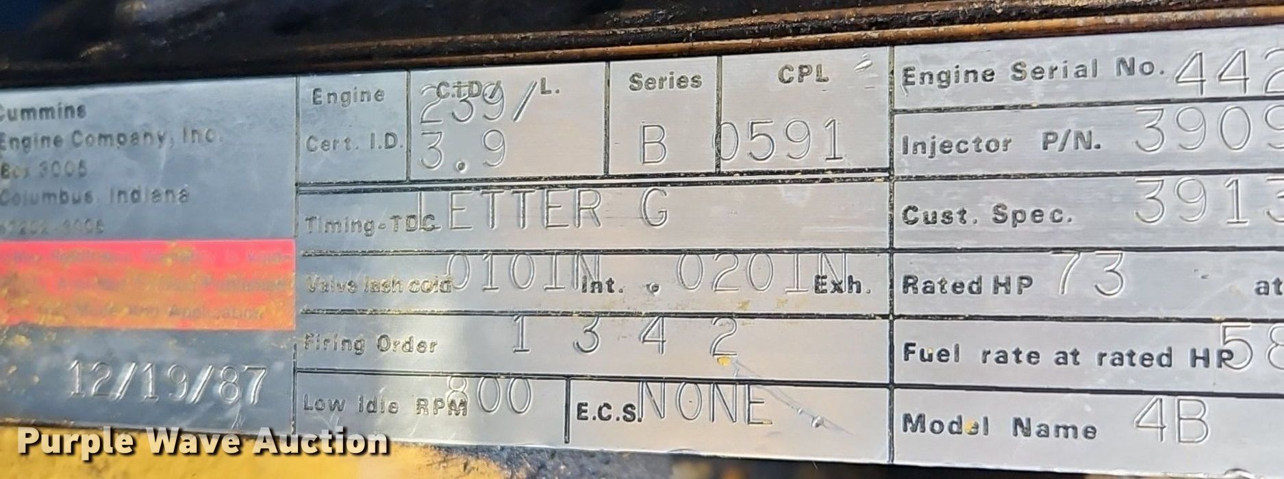1988 Bomag BW12R pneumatic roller. Hours: 12,970 on meter, Serial: 106610020159, Unit #: 447. Engine Cummins, Displacement: 3.9L, Cylinders: 4, Fuel type: Diesel. Transmission Hydrostatic. Operators station Vandal cover. Features Water spray applicator: Front, Rear. Tires Size: 7.50R15, Quantity: 9. Notes Unknown operating condition of engine, will run to load out, Non-operational unit. McAnany Construction Inc.. 15320 Midland Drive. Shawnee, KS 66217