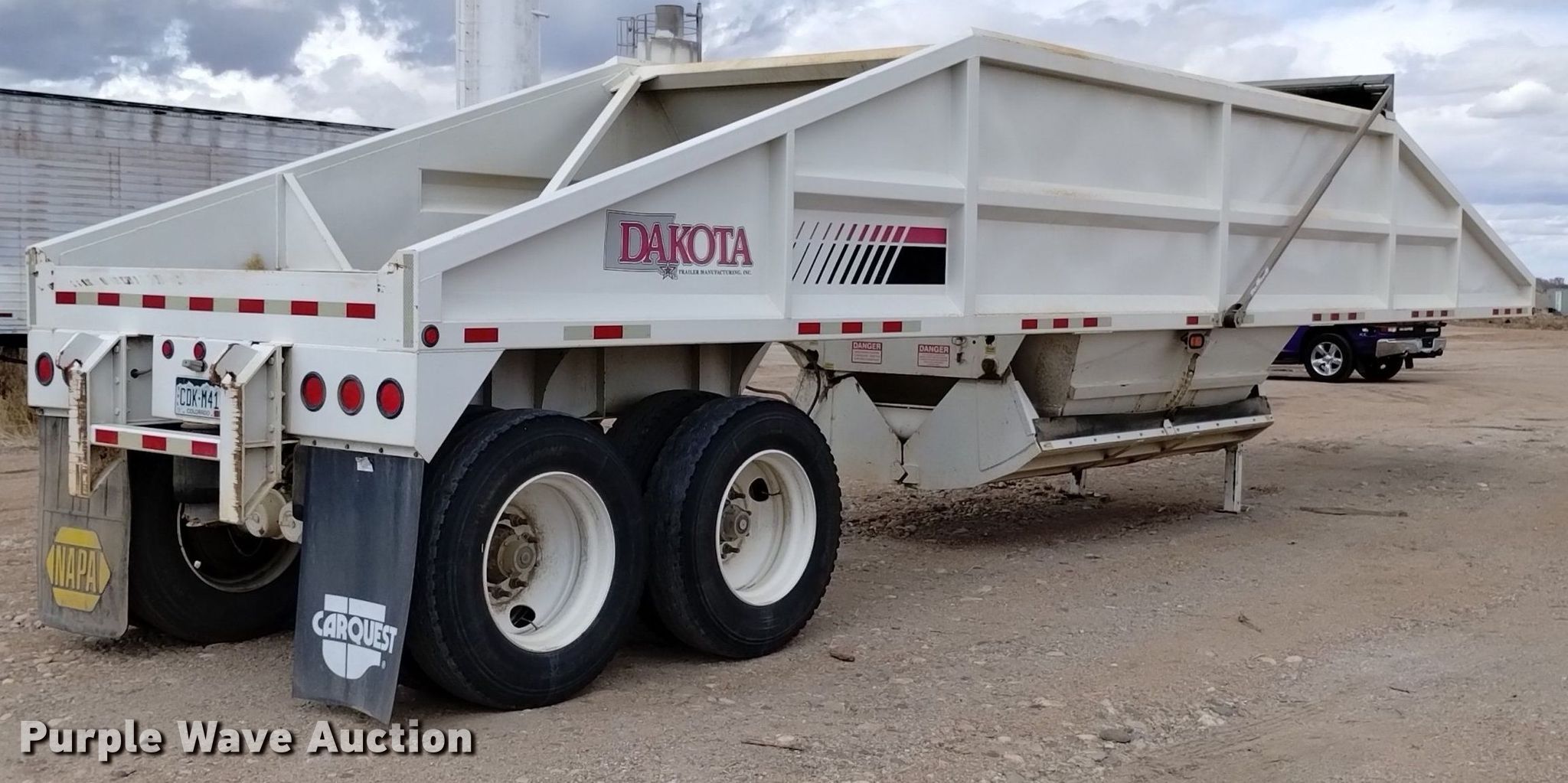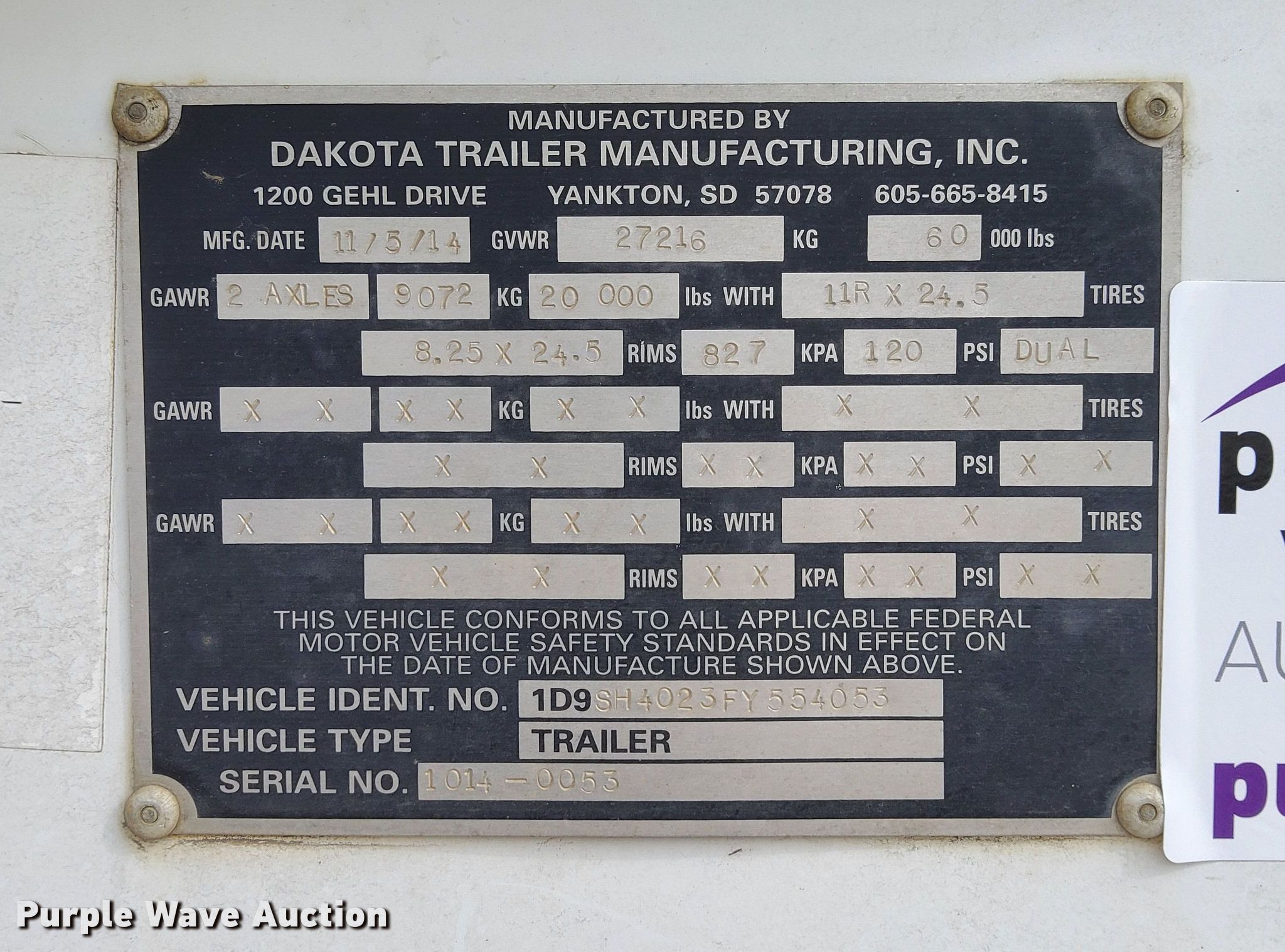 2015 Dakota bottom dump trailer. VIN: 1D9SH4023FY554053. Dimensions Overall: 40' L x 95" W. Features Body type: Steel, Clamshell gate: Air operated, Trailer controls. Chassis Landing gear: Dual, Suspension: Air, Brakes: Air, Axles: Tandem, GVWR: 60,000 lbs, GAWR: 20,000 lbs. Tires Steel wheels, Size: 11R24.5. Colorado title. Title has a lien that will be released following the close of the auction. Title distribution may be delayed up to 30 days from verification of funds. Valcrete Inc. Retirement. Open Inspection March 19th 10am-4pm. Rocky Ford, CO 81067