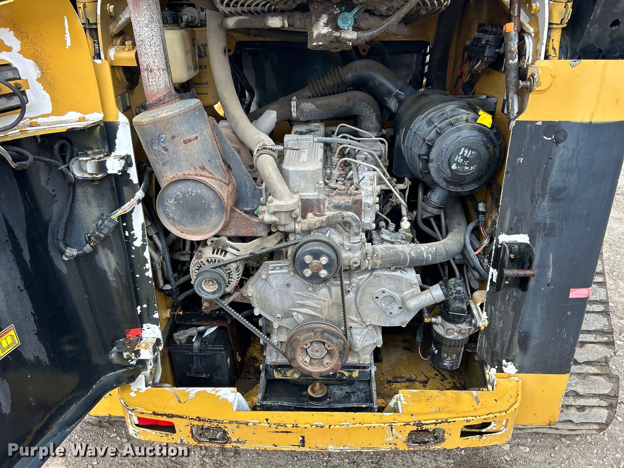 2006 Caterpillar 287B skid steer loader. Hours: 4,504 on meter, Serial: CAT0287BHZSA04059. Engine Caterpillar, Displacement: 3.3L, Cylinders: 4, Fuel type: Diesel. Transmission Two speed travel. Operators station OROPS, Bucket control: Hand. Features Auxiliary hydraulics, Quick coupler: Manual, Bucket Caterpillar, Width: 80", Low profile, Cutting edge: Bolt-on. Tracks Width: 18". Steele Excavating Inc.. 412 North 5th Street. Montezuma, IA 50171
