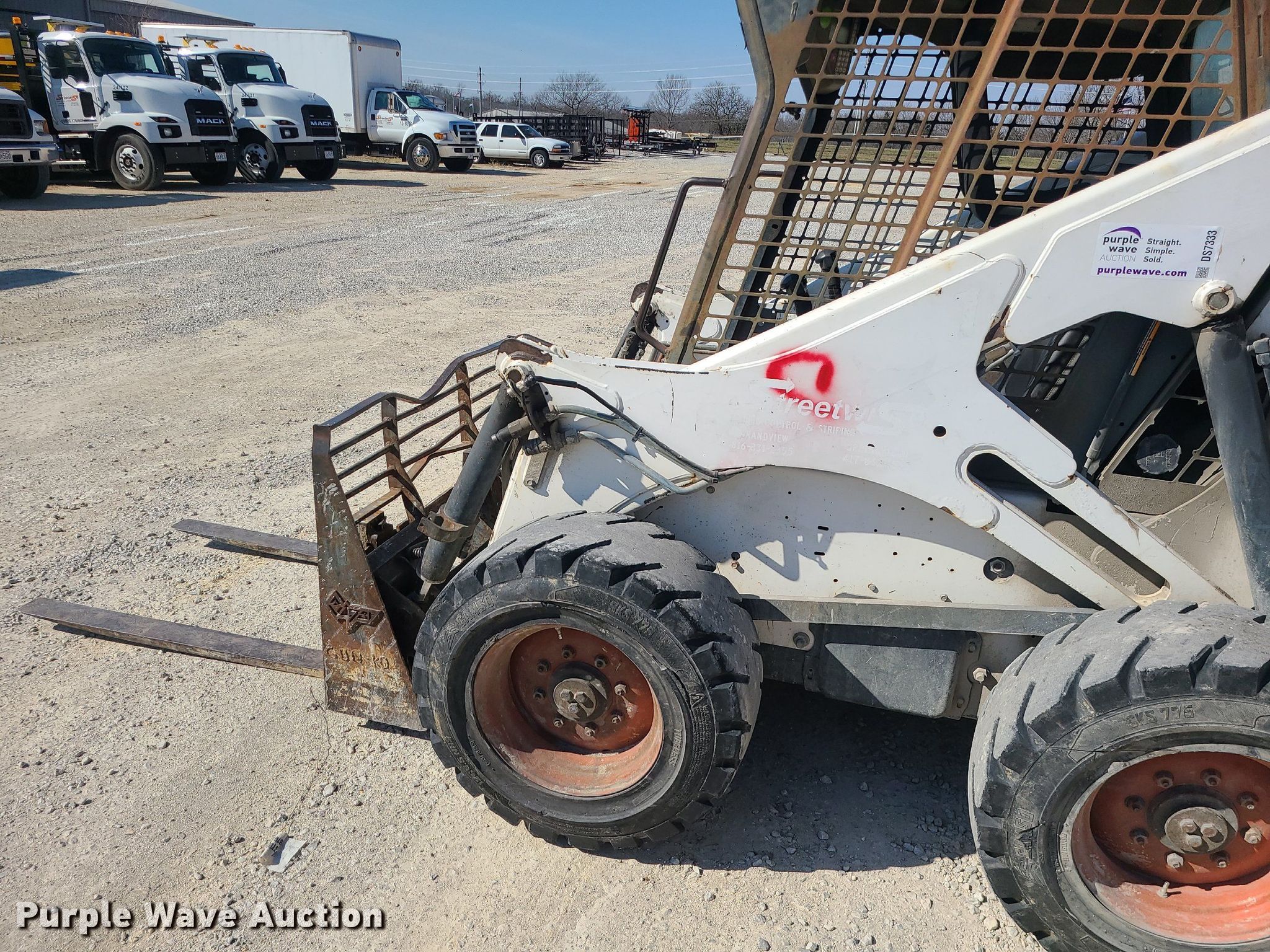 2000 Bobcat 873 skid steer loader. Hours: 5,202 on meter, Serial: 514142932. Engine Cylinders: 4, Fuel type: Diesel. Transmission Hydrostatic. Operators station OROPS, Bucket control: Foot. Features Auxiliary hydraulics, Quick coupler: Manual, Bucket Width: 70", Cutting edge: Weld-on, Forks Length: 48". Tires Size: 12-16.5. 13501 Arrington Road. Grandview, MO 64030