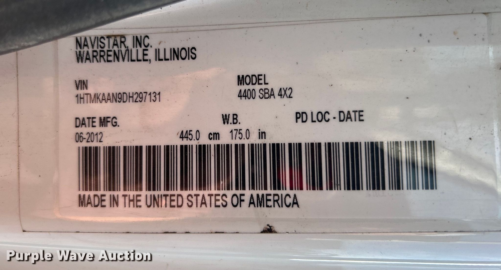2013 International 440 SBA utility / service truck. Miles: 125,844 on odometer, Hours: 11,829 on meter, VIN: 1HTMKAAN9DH297131. Engine International DT466, Displacement: 7.6L, Cylinders: 6, Fuel type: Diesel. Transmission Automatic. Chassis Axles: Single, Suspension: Spring, Brakes: Air. Interior AC, Heat, Cruise control, Auxiliary controls, Brake controller. Features Bed 13' 1" L x 95" W, Generator Fuel type: Gas.. Tires Size: 11R22.5. Notes Unknown operating condition of generator. Oklahoma title. Title distribution may be delayed up to 14 days from verification of funds. 15107 North 137th East Avenue. Collinsville, OK 74021