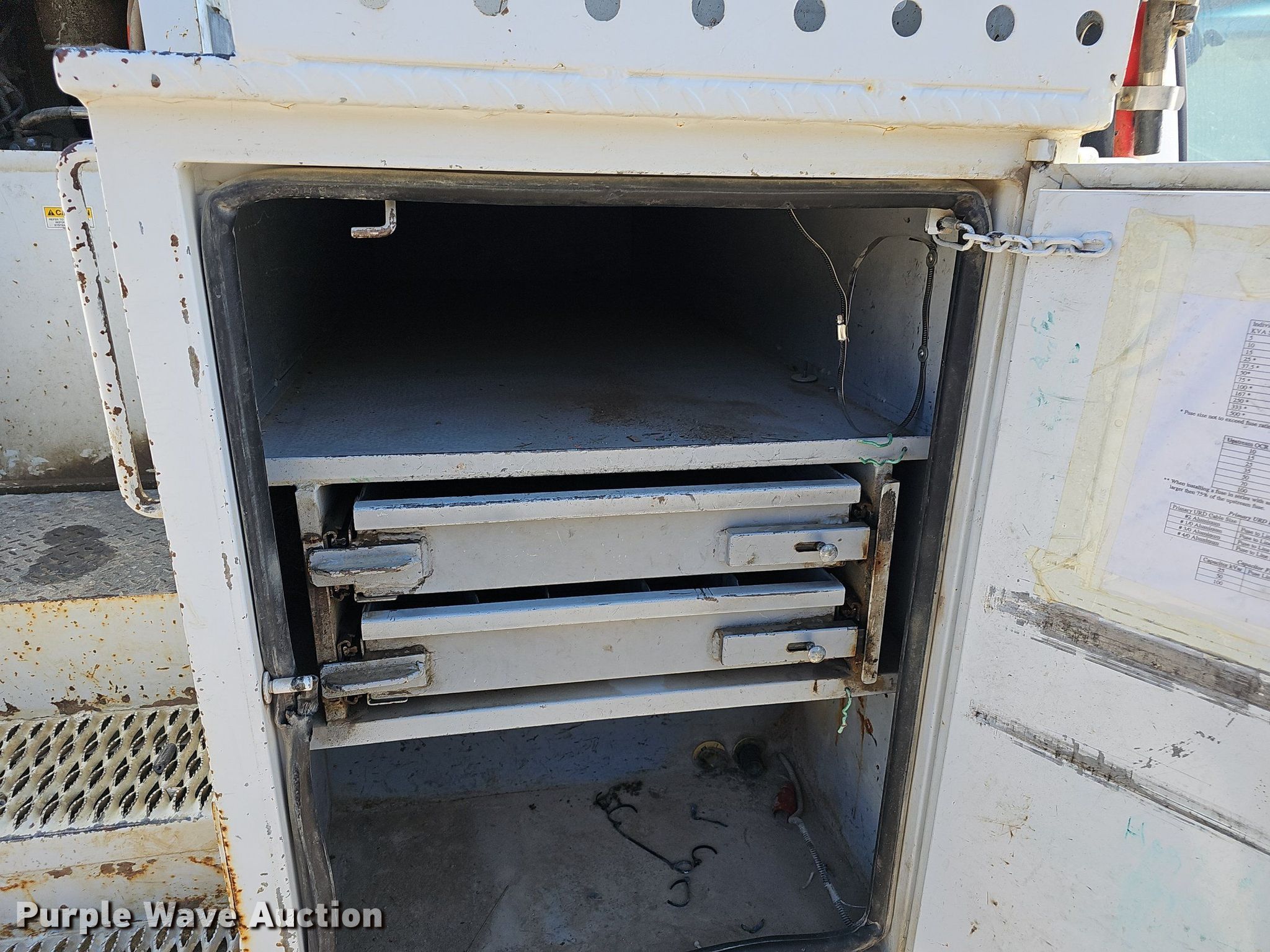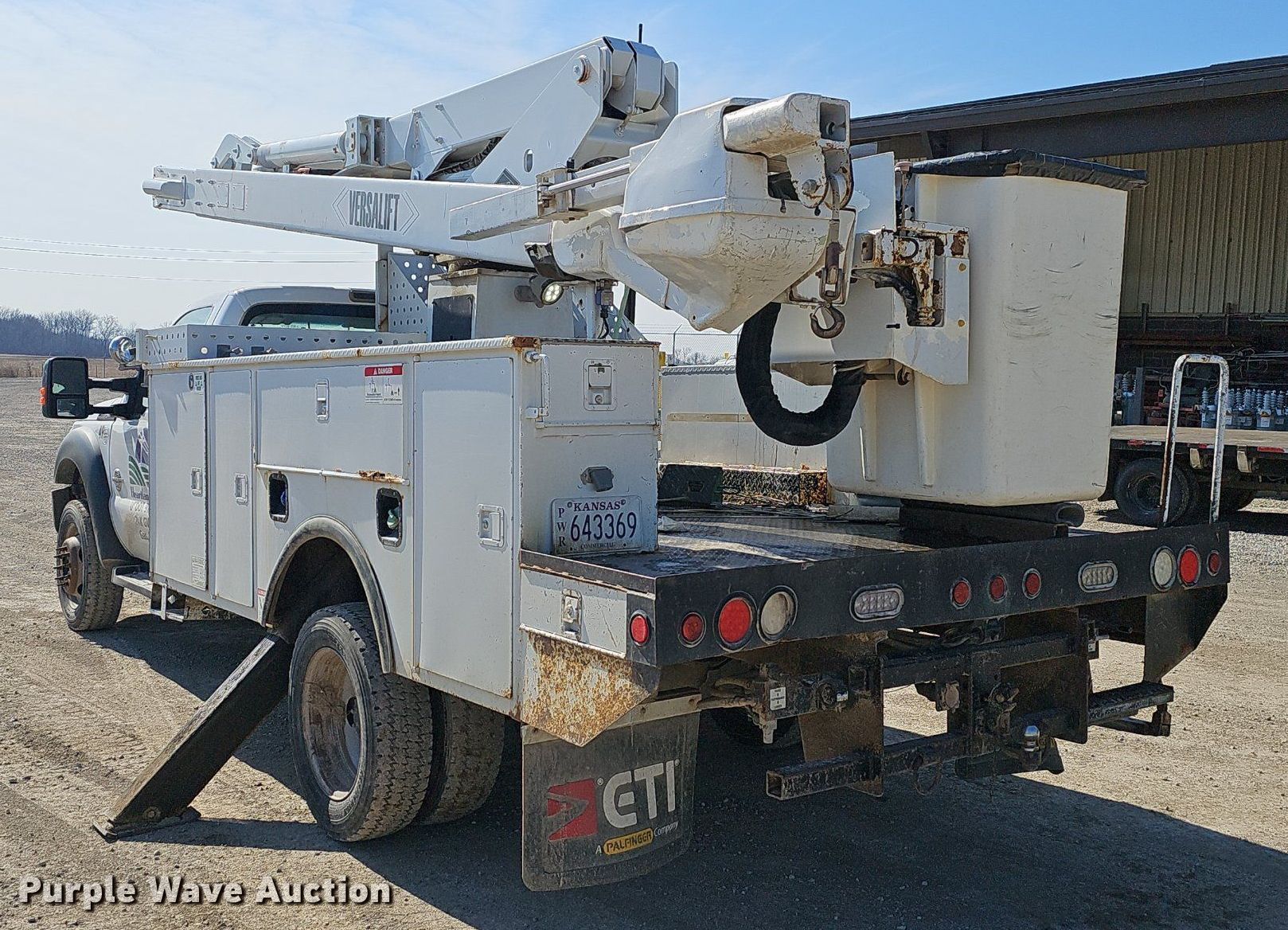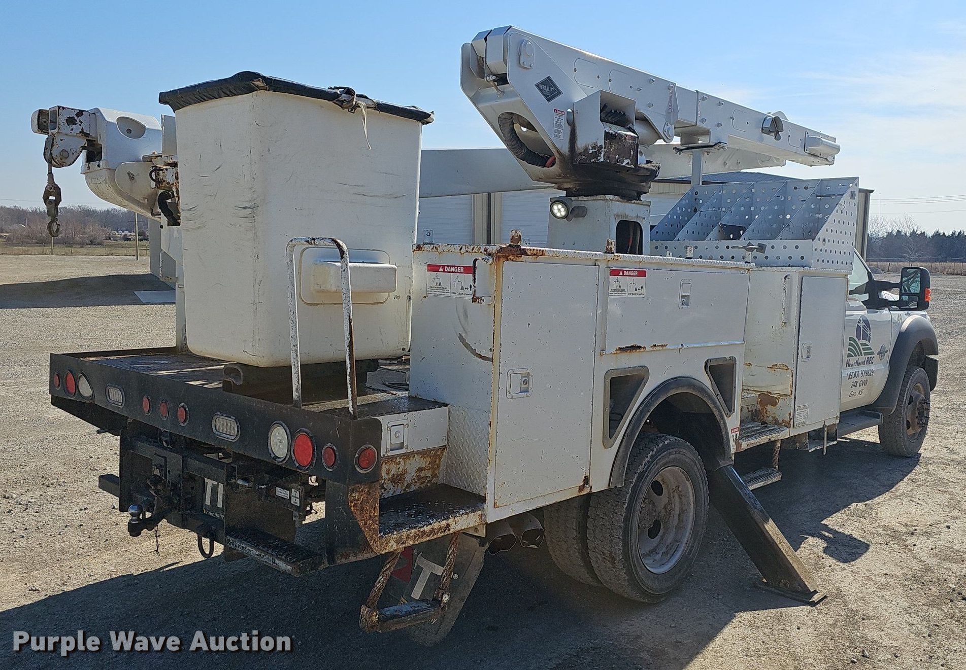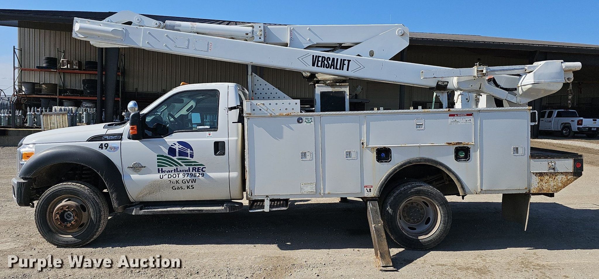2016 Ford F550 Super Duty bucket truck. Miles: 225,136 on odometer, VIN: 1FDUF5HT7GEC99104, Unit #: 49. Engine Displacement: 6.7L, Cylinders: 8, Fuel type: Diesel. Transmission Automatic. Chassis Four wheel drive, Axles: Single, Suspension: Spring, Brakes: Hydraulic, PTO, GVWR: 19,500 lbs. Interior AC, Heat, Power windows, Power locks, Cruise control, Auxiliary controls. Features Bed 11' L x 95" W, Boom Versalift VO-40-MHI, Boom length: 40', Maximum lift height: 40', Boom type: Articulating, Boom controls Ground, Platform/ basket.. Tires Size: 225/70R19.5. Kansas title. Title distribution may be delayed up to 14 days from verification of funds. Heartland Rural Electric Cooperative Inc.. Girard, KS 66743