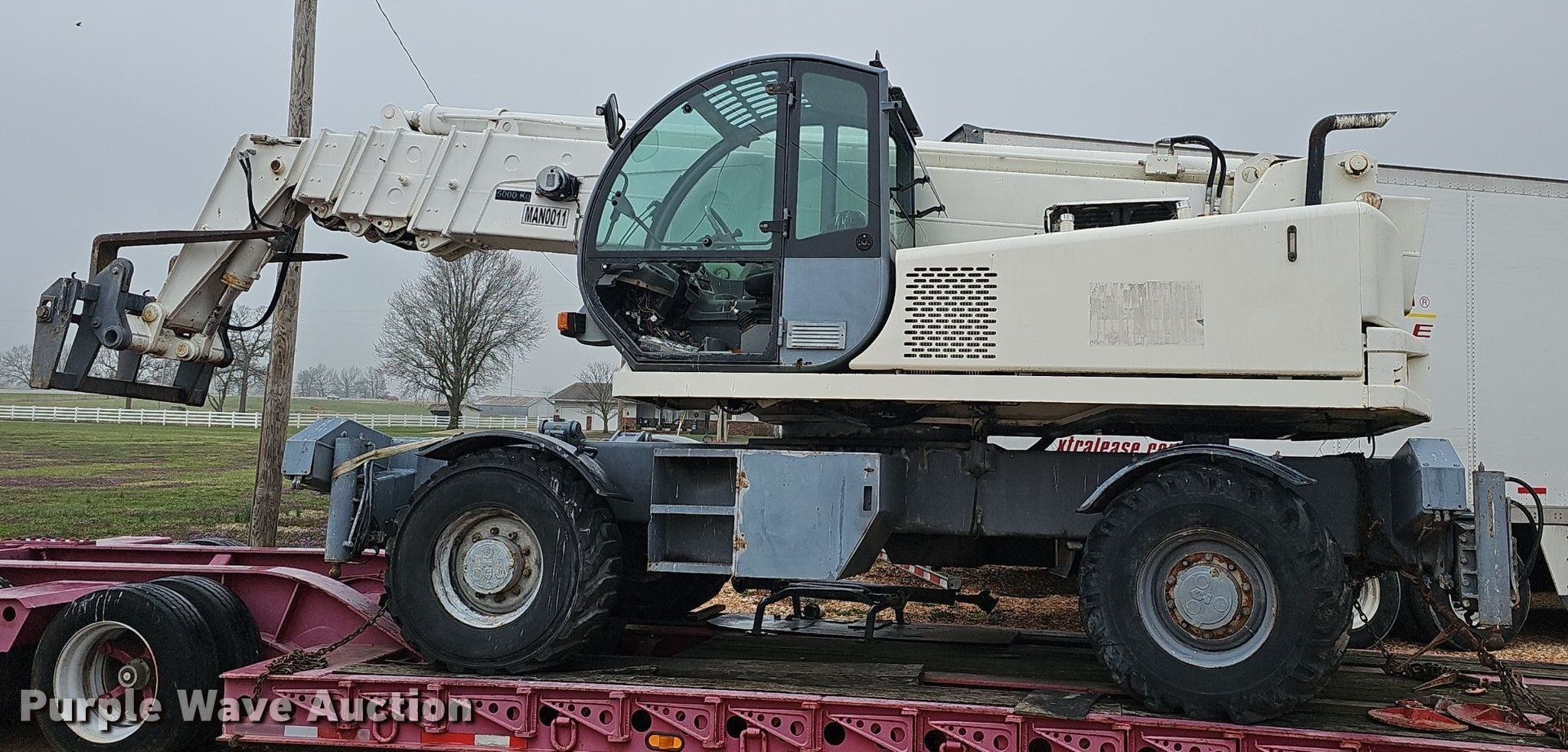 2004 Terex 5022 telehandler. Hours: 6,127 on meter, Serial: 10425. Engine Cylinders: 6, Fuel type: Diesel, kW: 94.4. Transmission Hydrostatic, 2F - 2R, Differential lock. Operators station Enclosed cab, Heat, Steering: Crab, Four wheel. Features Boom stages: 4, Fork length: 47", Tilt carriage, Hydraulic outriggers, Hydraulic leveling, Lift capacity: 5,000 kg, Lift height: 21.7 meters. Tires Size: 18-22.5. Notes Trailer not included, Unknown operating condition. Mike Bennett, Inc.. 8011 Farm Road 2090. Purdy, MO 65734