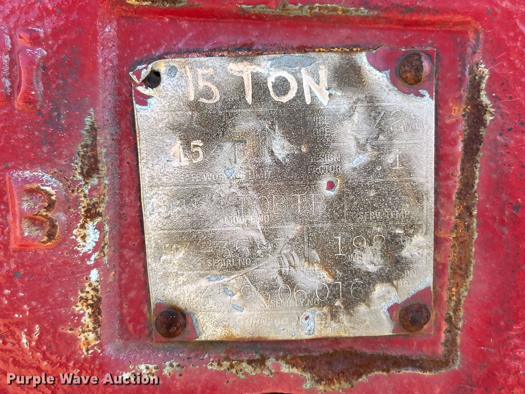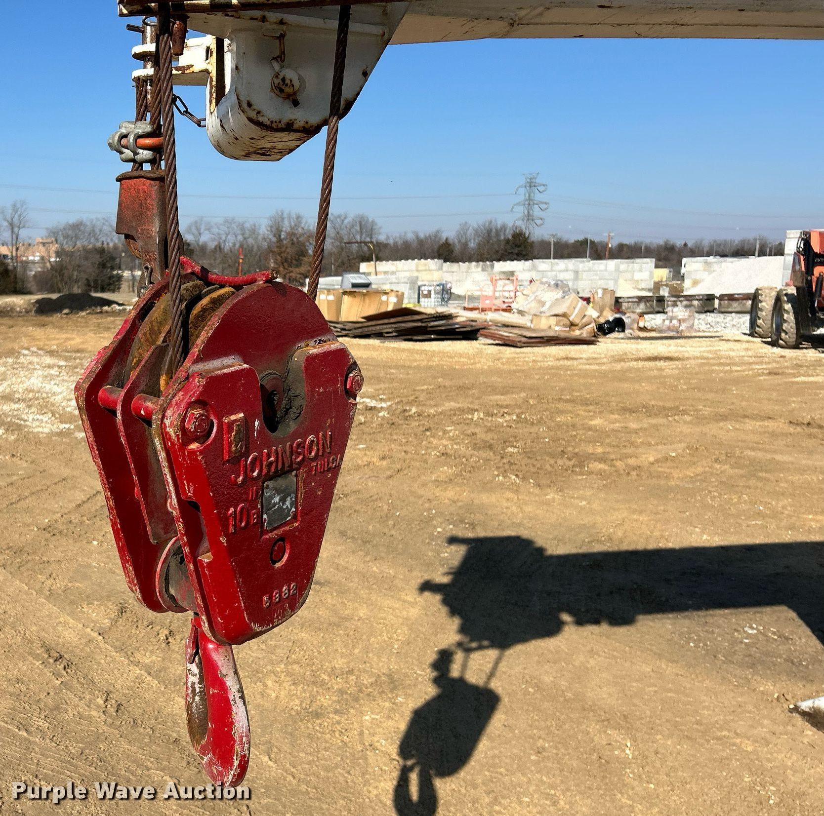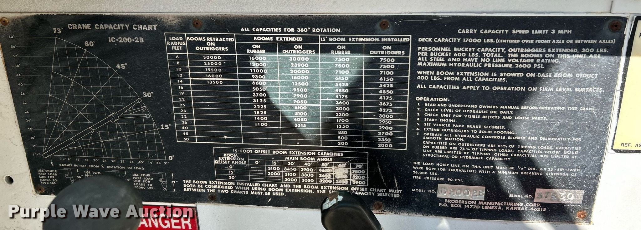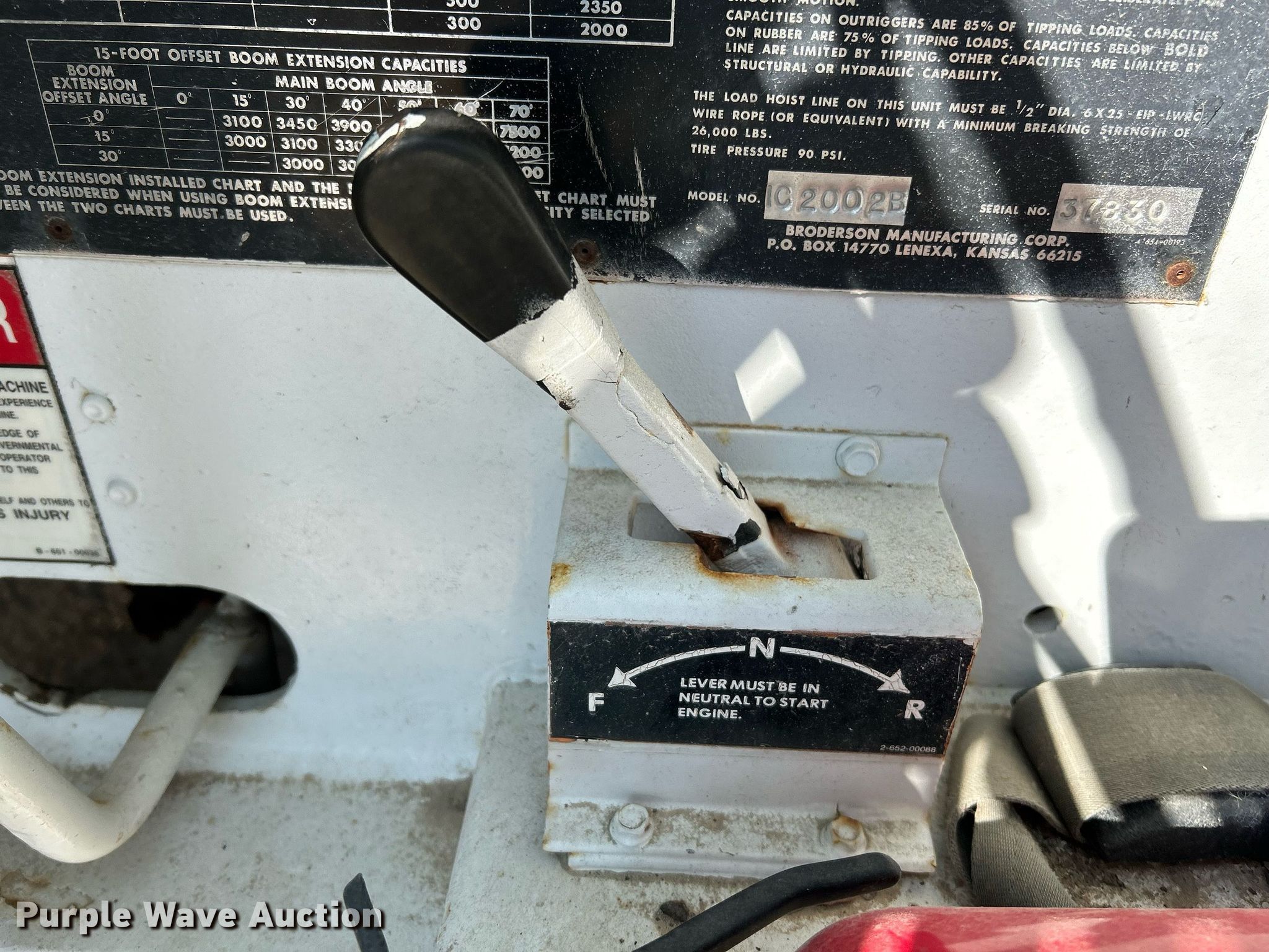 1993 Broderson IC-200-2B crane. Hours: 9,053 on meter, Serial: 37830. Engine Ford, Cylinders: 6, Fuel type: Dual fuel. Transmission Powershift, Speed: 4. Chassis Suspension: Spring, Brakes: Hydraulic, Controls: Hydraulic actuated. Operators station Enclosed cab, Crane controls: Stick. Features Boom Telescopic, Maximum boom length: 36' Sections: 3, Maximum lift capacity: 30,000 lbs, Maximum lift height: 51', Jib: 15', Stabilizers: 4, Boom controls In-cab, Crane block Sheaves: 2, Lift chart. Tires Size: 385/65R22.5. Notes Dead battery, Door missing. This is worksite support equipment and will not come with a title. Transfer of ownership documentation will be a bill of sale. Kinder Crane & Excavating. Wentzville, MO 63385