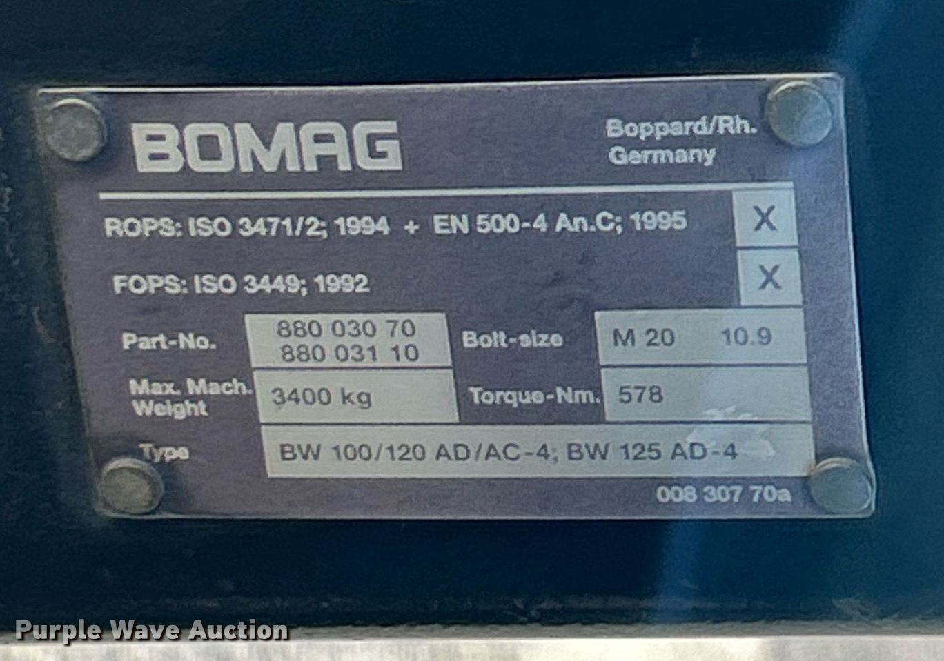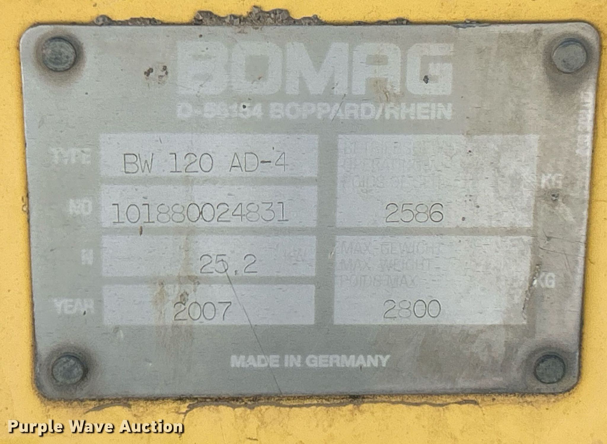 Purple Wave is selling a used Double Drum Roller Compactor in Missouri. This item is a 2007 Bomag BW120AD-4 double drum vibratory roller with the following: Hours: 2,534 on meter, Serial: 101880024831