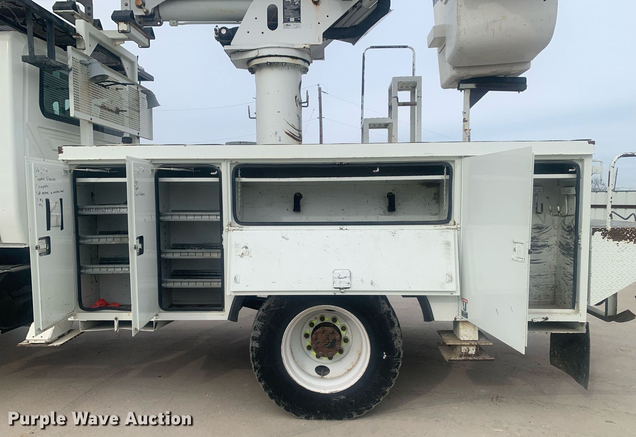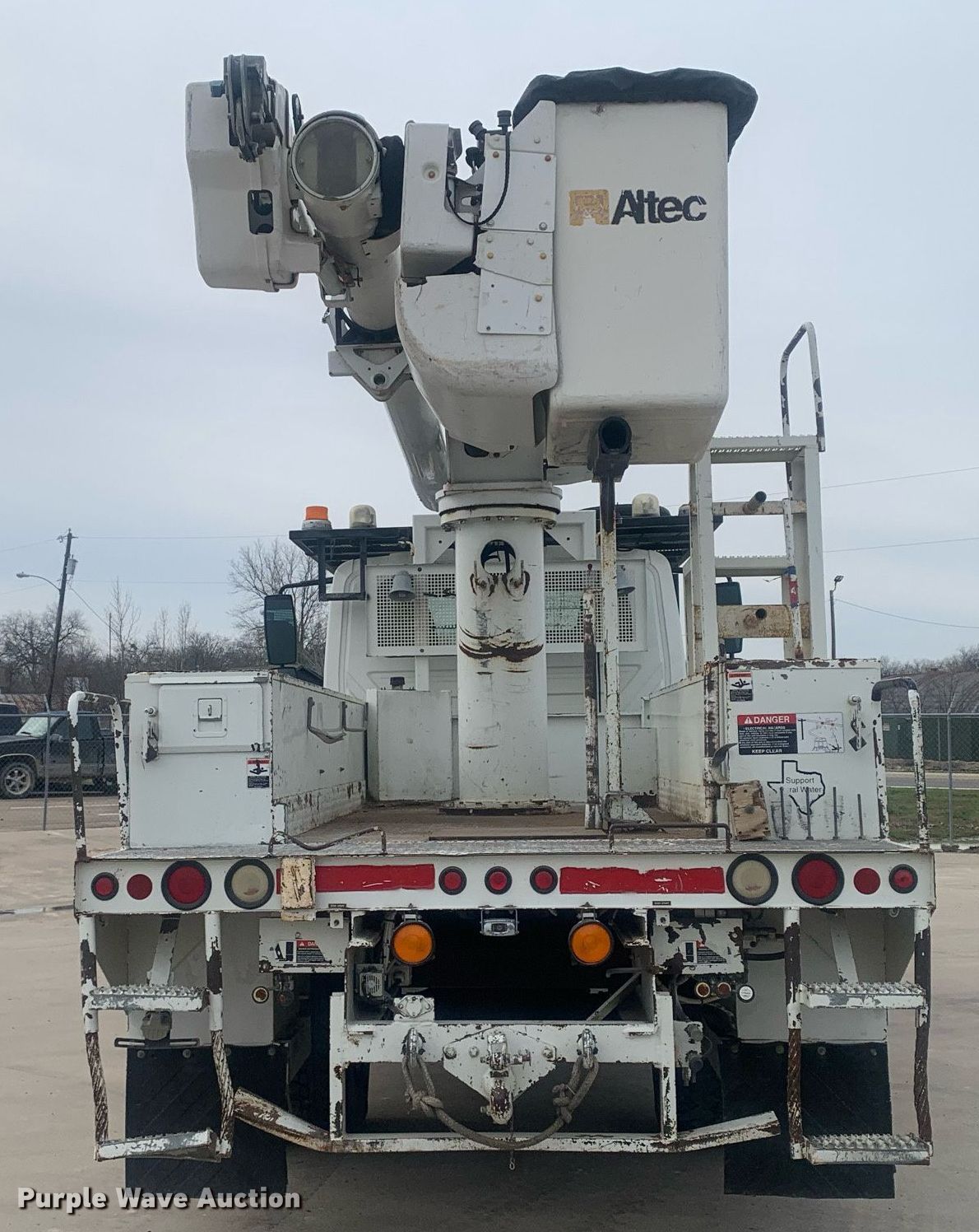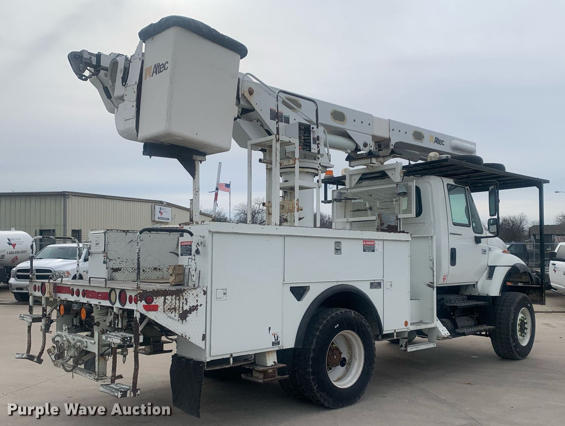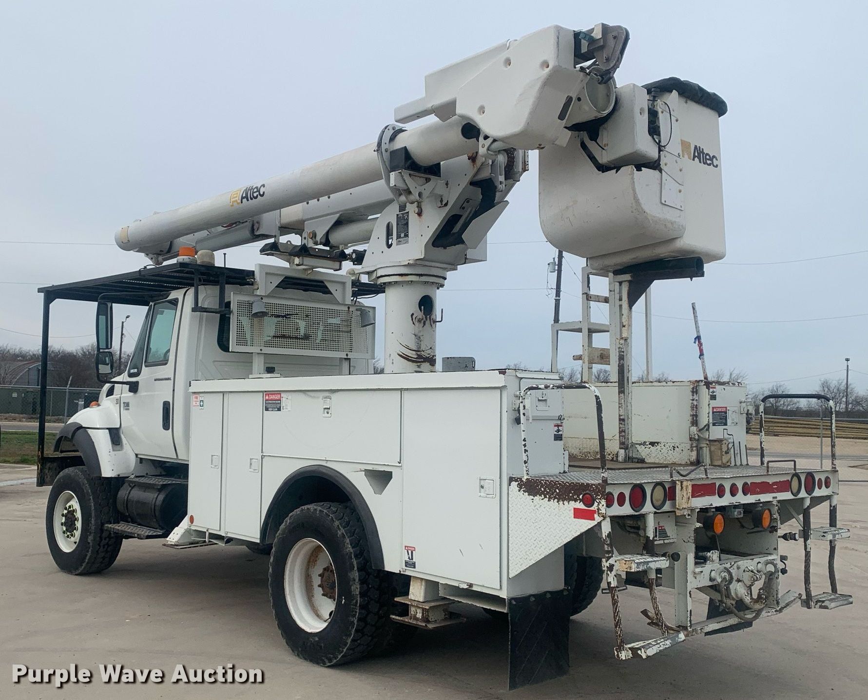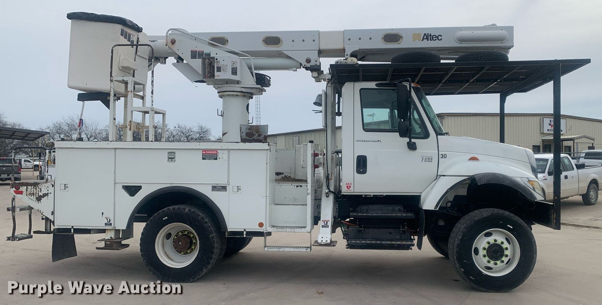 2005 International 7300 bucket truck. Miles: 150,288 on odometer, Hours: 10,588 on meter, VIN: 1HTWBAAN75J049799. Engine International DT466, Displacement: 7.6L, Cylinders: 6, Fuel type: Diesel, HP: 350. Transmission Automatic. Chassis Four wheel drive, Axles: Single, Suspension: Spring, Brakes: Air, PTO, GVWR: 33,000 lbs, Wheelbase: 160". Interior AC, Heat, Cruise control. Features Bed Altec, Serial: 272792543904, 13' 4" L x 7' 9" W, Boom 2005 Altec, Serial: 0704DQ0072, Boom length: 42', Mast height: 42', Maximum lift capacity: 400 lbs, Maximum lift height: 42', Boom type: Articulating, Insulated, Man basket, Boom controls Ground, Platform/ basket, Material handler. Tires Front: 385/65R22.5, Rear: 11R22.5. Notes Gear selector issues, does not show gear, Non-operational four wheel drive, transfer case missing. Texas title. Title distribution may be delayed up to 14 days from verification of funds. Hilco Electric Cooperative, Inc.. 502 North Hill Street. Itasca, TX 76055