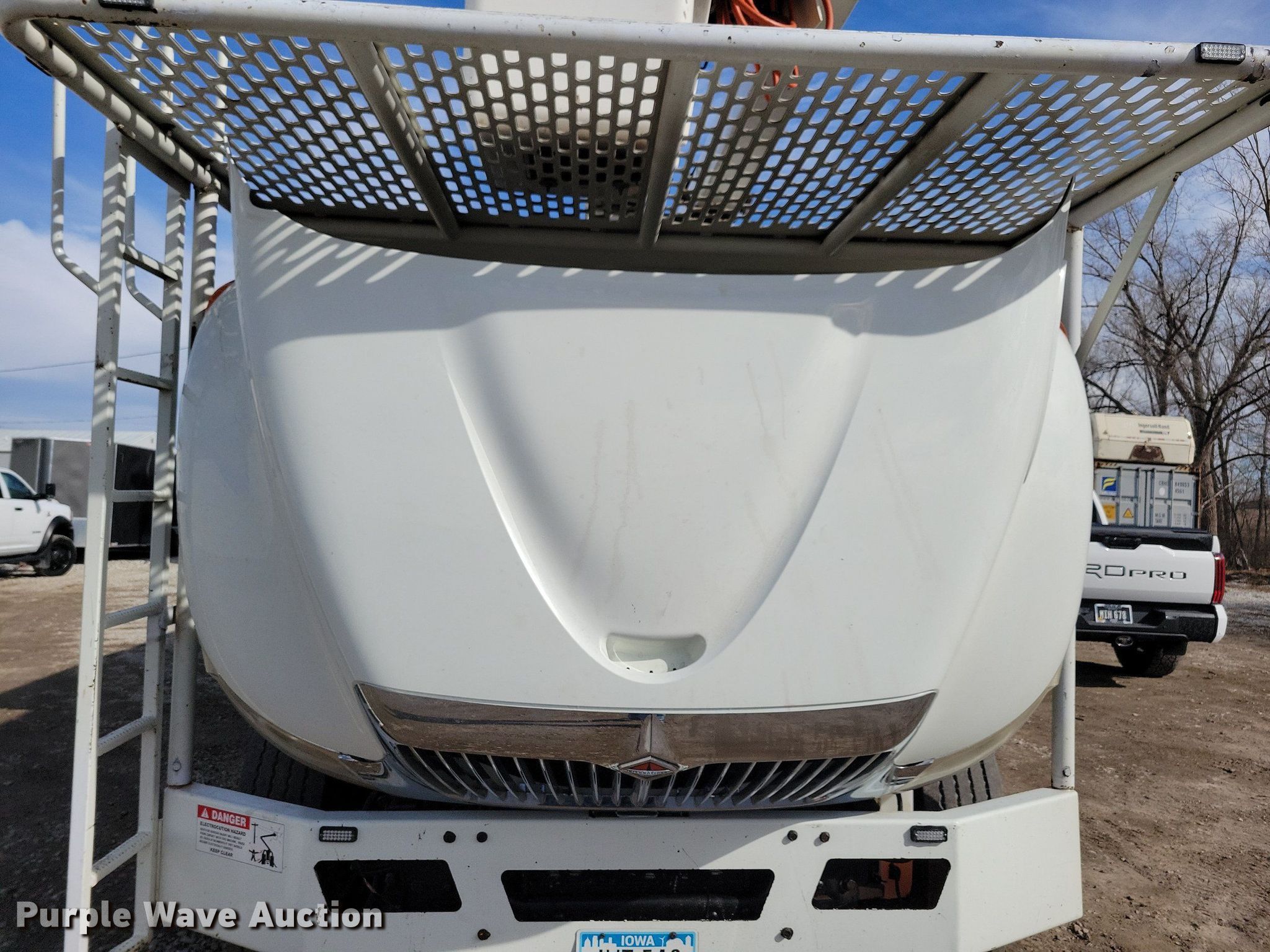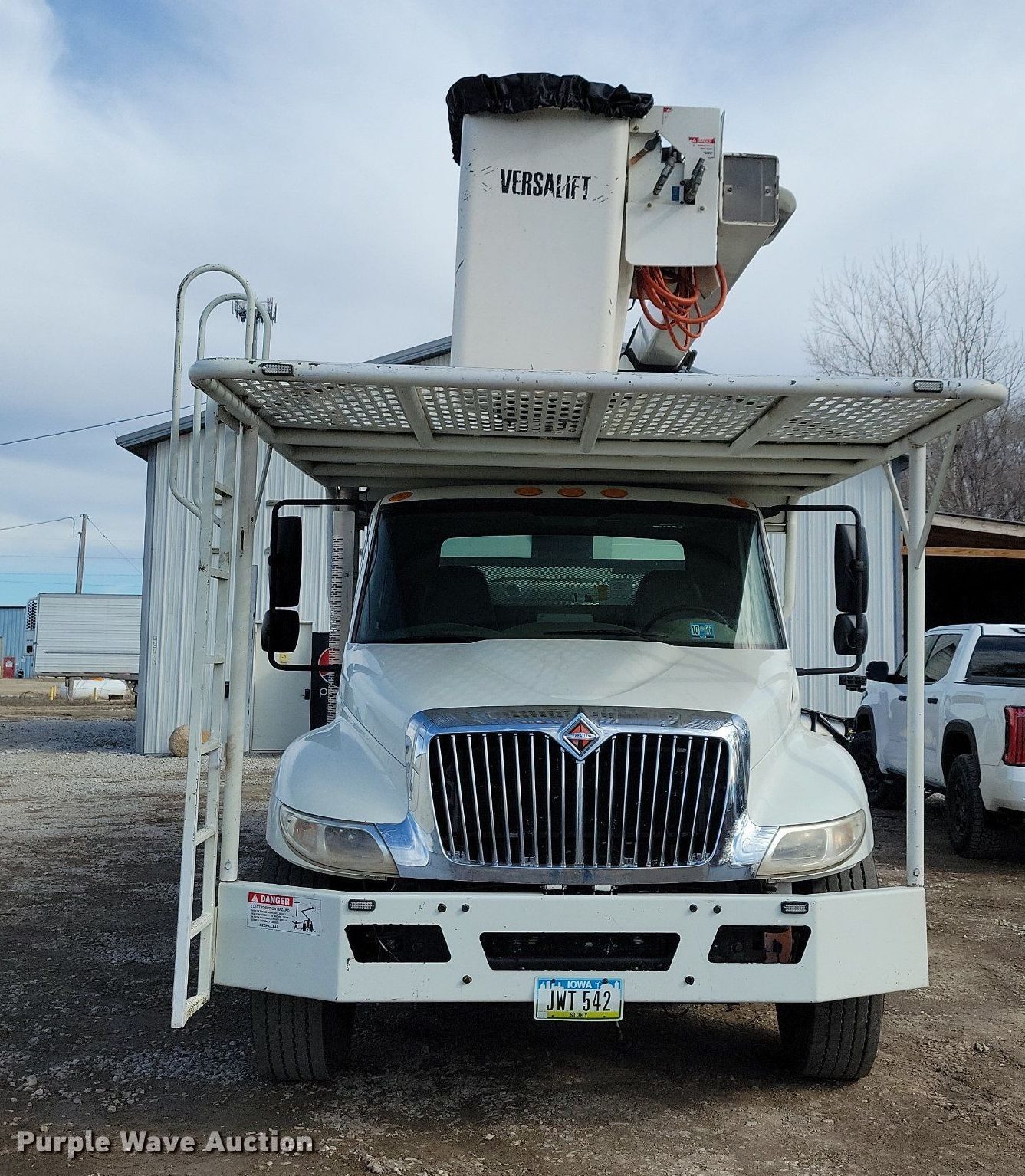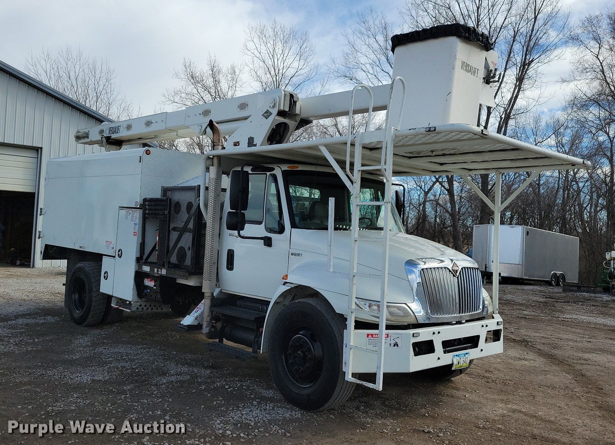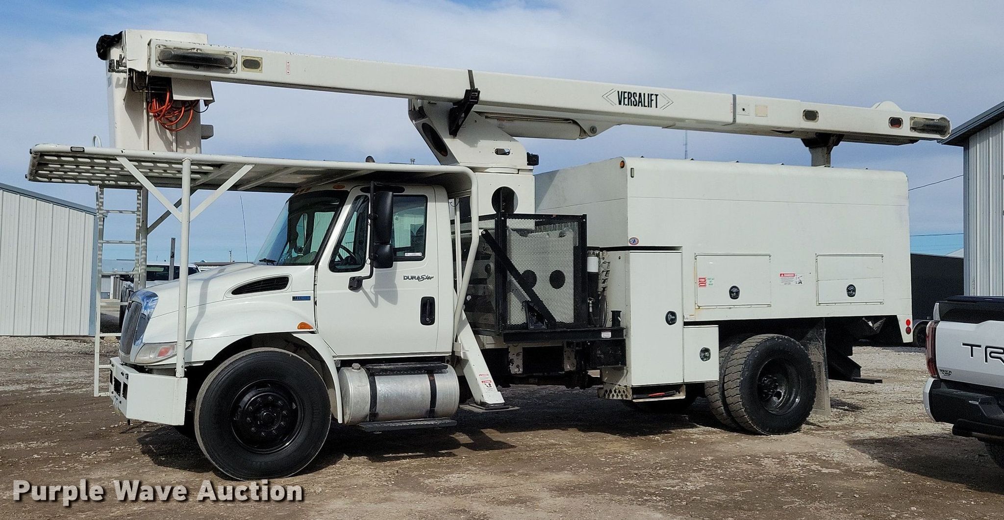 2012 International 4300 forestry bucket truck. Miles: 94,827 on odometer, Hours: 9,038 on meter, VIN: 1HTMMAAR4CH601154. Engine International Maxxforce, Displacement: 7.6L, Cylinders: 6, Fuel type: Diesel. Transmission Allison, Automatic. Chassis Axles: Single, Suspension: Spring, Brakes: Air, PTO, GVWR: 34,000 lbs, Wheelbase: 207". Interior AC, Heat, Heated mirrors, Cruise control, Auxiliary controls. Features Chip bed Arbortech, 12' 2" L x 96" W, Boom Versalift V0270EREV, Serial: NA110013, Boom length: 65', Mast height: 10', Maximum lift capacity: 350 lbs, Maximum lift height: 75', Boom type: Articulating, Insulated, Man basket, Boom controls Ground, Platform/ basket, Elevator-Versalift VO-270-E 10' lift extension. Tires Front: 315/80R22.5, Rear: 11R22.5, Brand: Continental. Iowa title. Title distribution may be delayed up to 14 days from verification of funds. Ames Lawn Care & Maintenance. 56780 241st Street. Ames, IA 50010